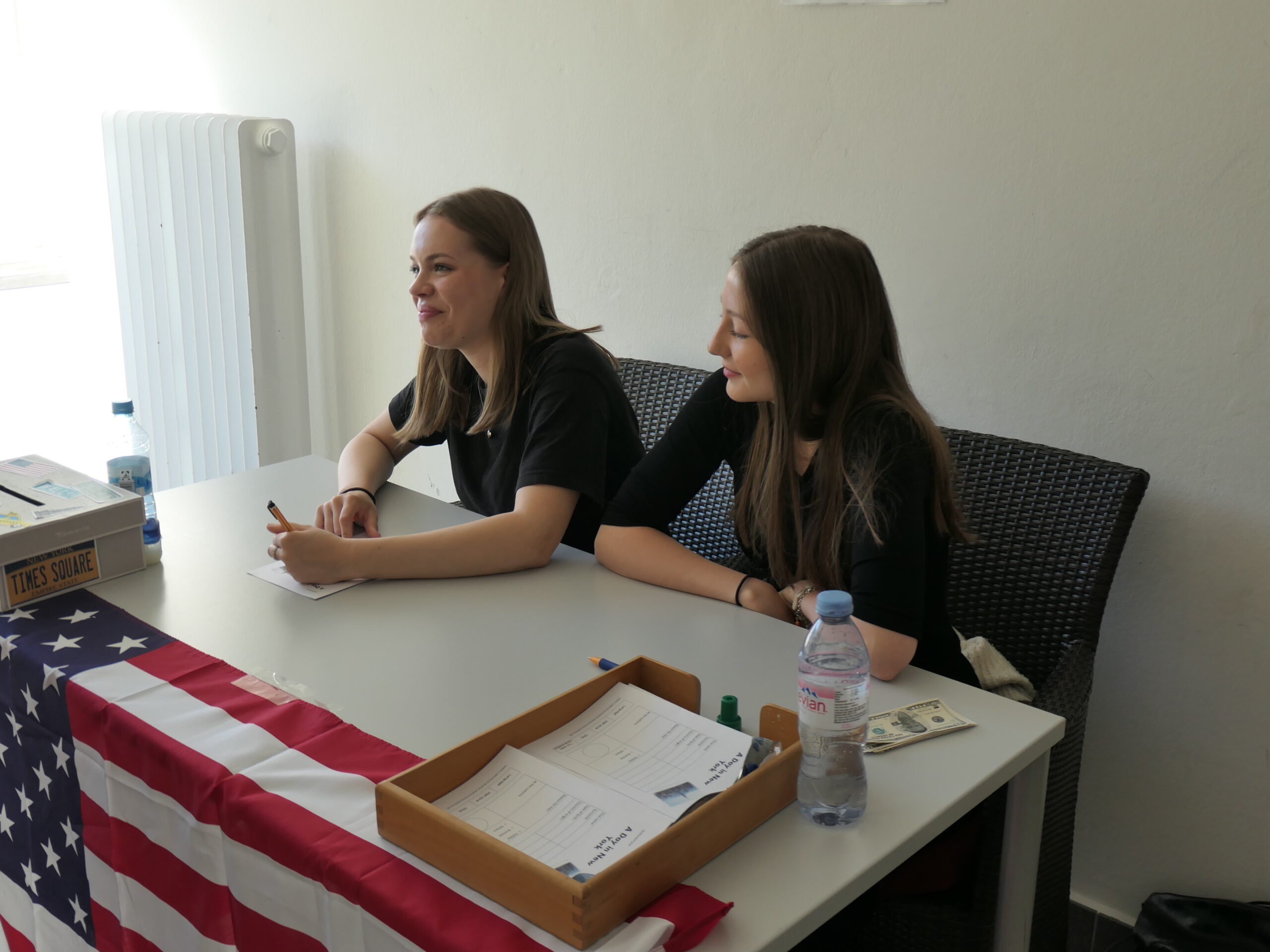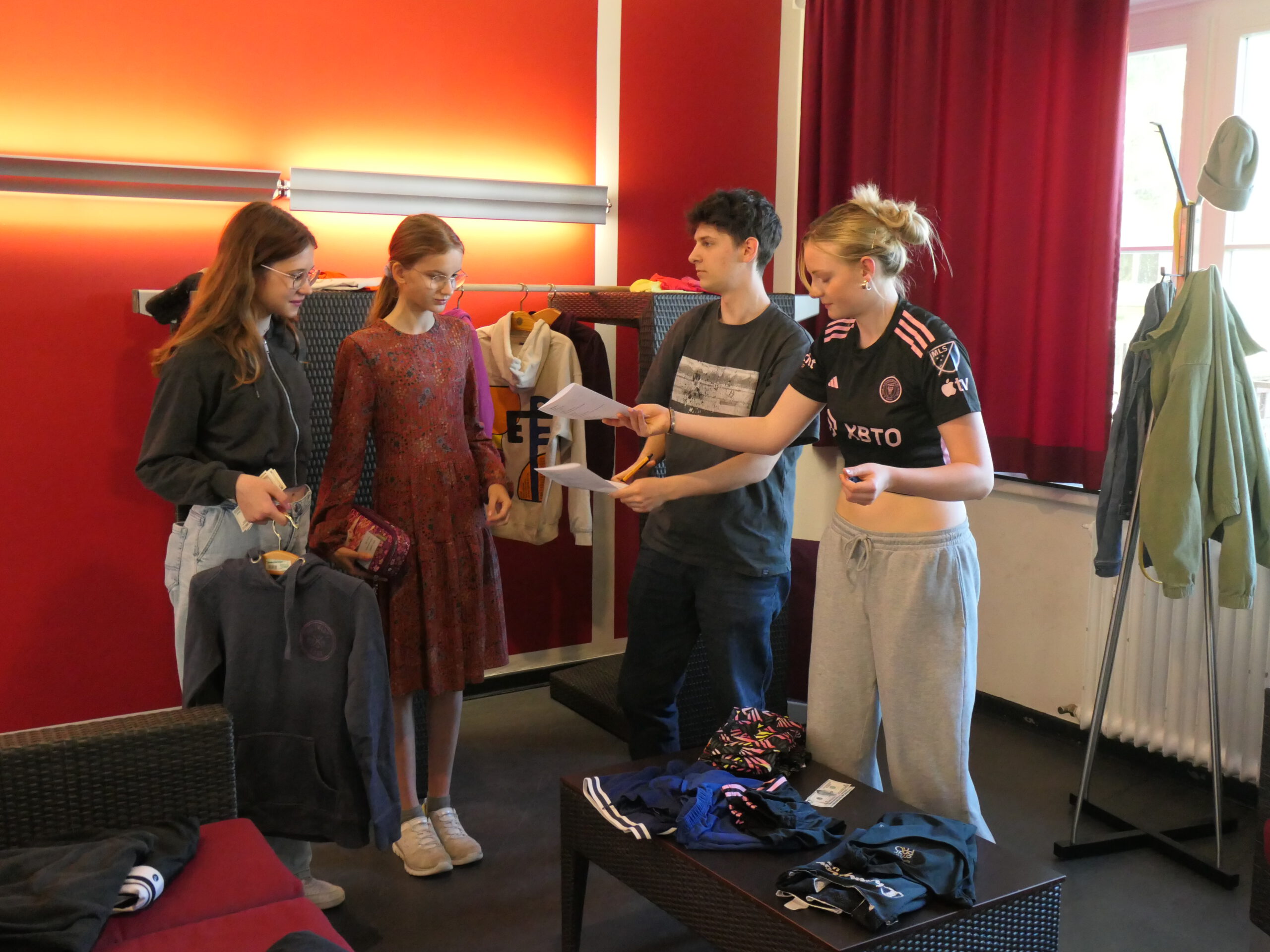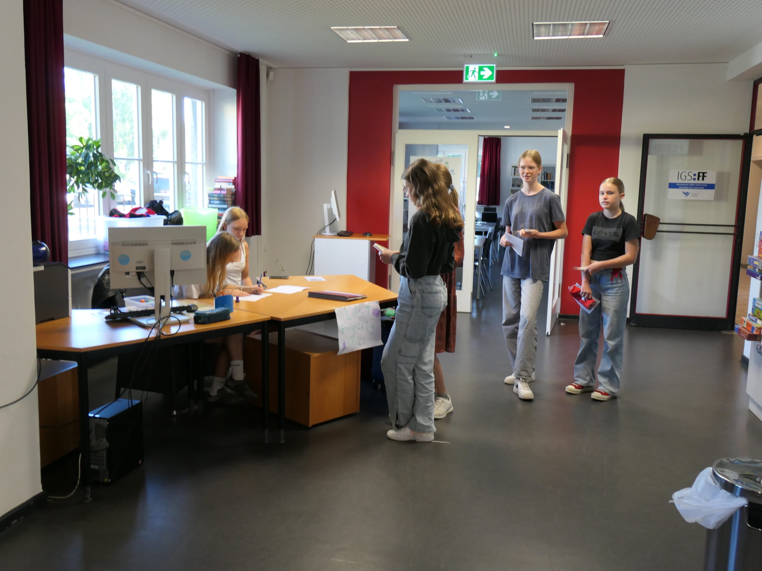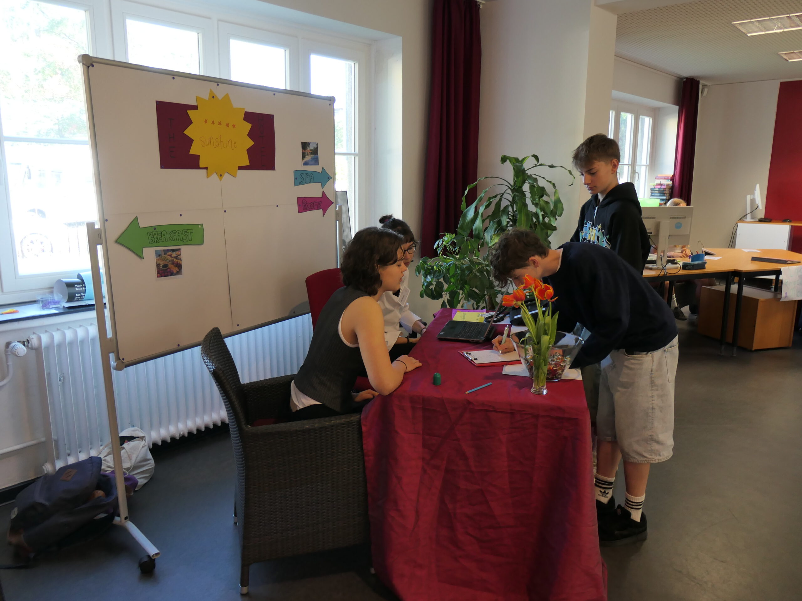 Aber der Reihe nach: zunächst galt es bei der Ankunft am JKF Airport die Kontrollen am Zoll in der Fremdsprache zu bestehen. Ausgestattet mit einem Tourpass und einer Handvoll IGSFF-Dollar konnten sich die SchülerInnen im Anschluss durch New York treiben lassen. Beginnend beim Lost Property Office musste man den fehlenden Koffer beschreiben und klären, wie das Gepäck ins Hotel geliefert werden könne. Beim freundlichen Personal des Sunshine Hotels galt es die reservierten Hotelzimmer zu beziehen und nach dem WLAN-Passwort und anderen typischen Einrichtungen der Unterkunft zu fragen. Leckere Bonbons gab es dann inklusive. Versehen mit der Keycard machten sich die Teams auf, den Tag zu planen und das „Sprachen“-Dorf zu erkunden. Die besten Vintagestücke gab es auf jeden Fall in der SportsBoutique (ein Besenstil mit Kleiderbügeln zwischen den hochgestellten Sofas kann sehr exquisit wirken). Eine professionelle Beratung für interessante Touren offerierte die Tourist Information und für die besten Tickets der aktuellen Broadwayshows musste man zur Box Office am Time Square, bevor der Night Desk Agent zum Entspannen und über den Tag reden einlud.