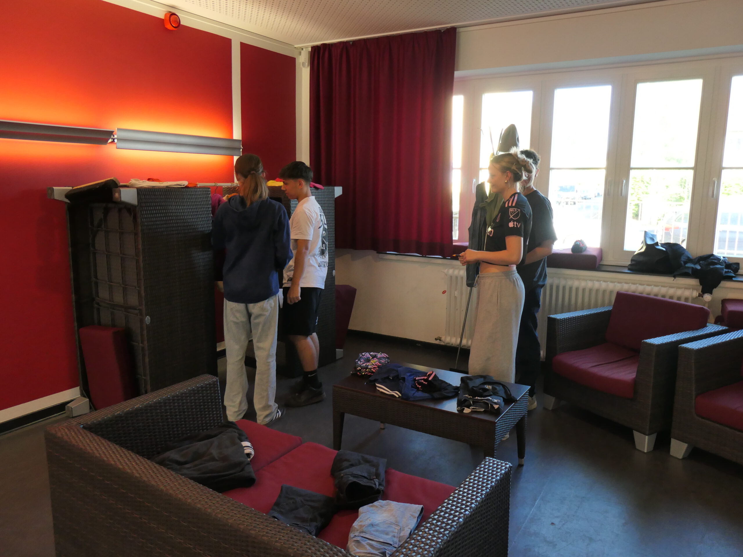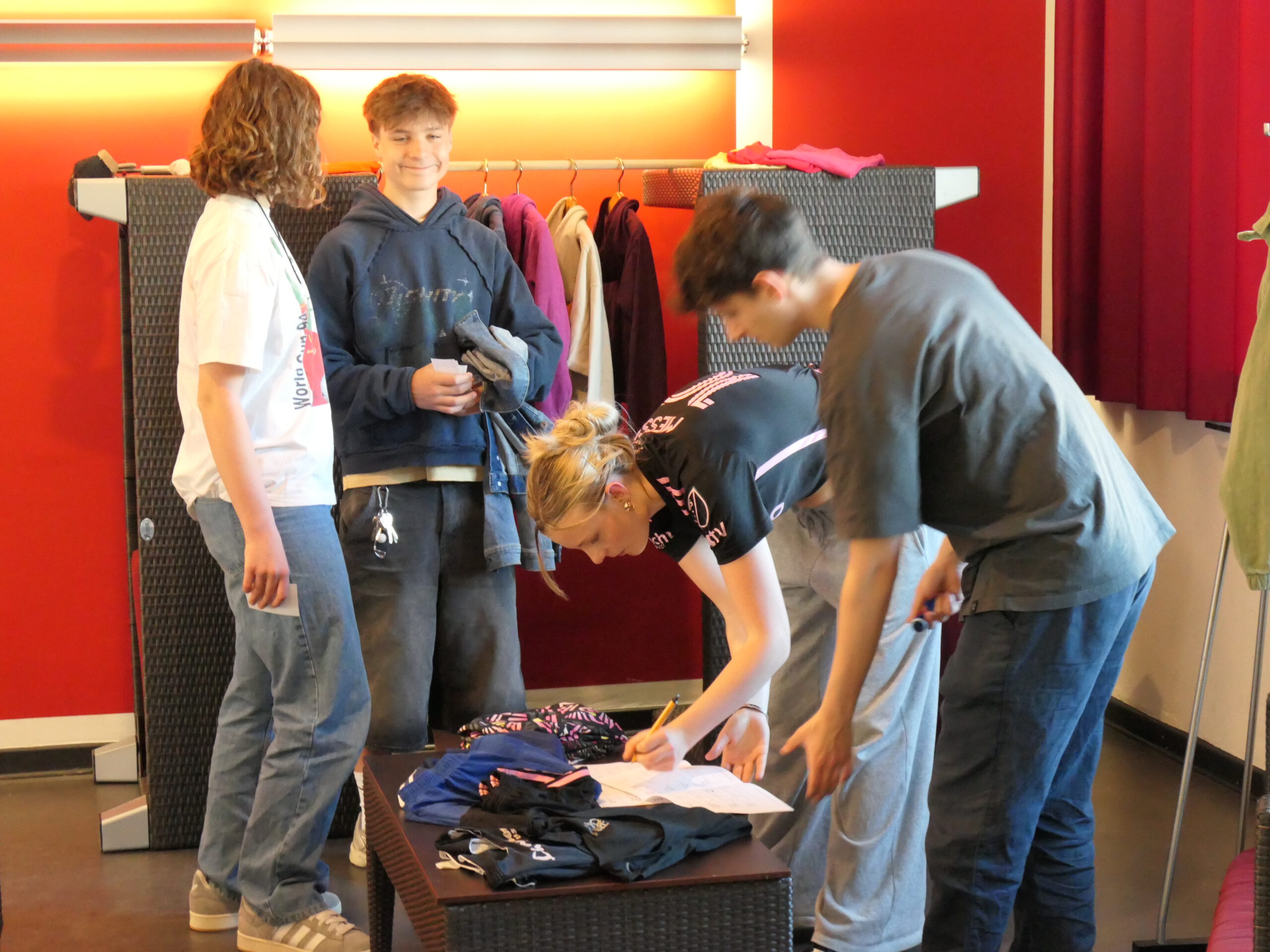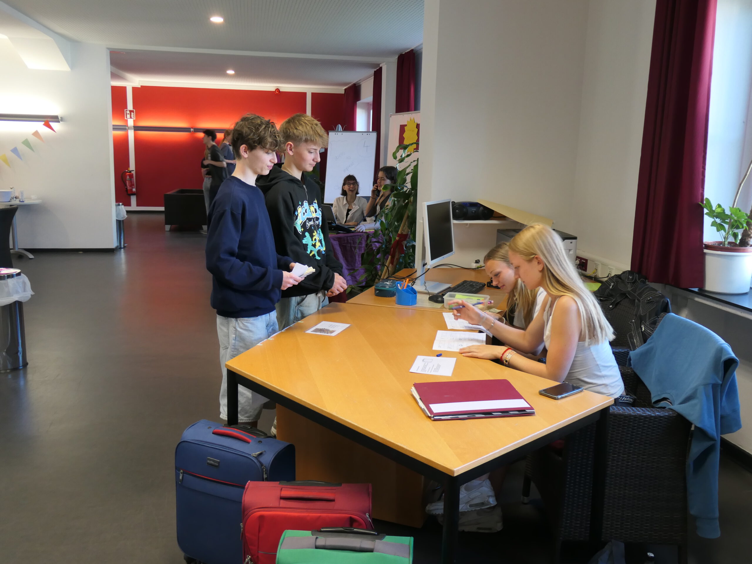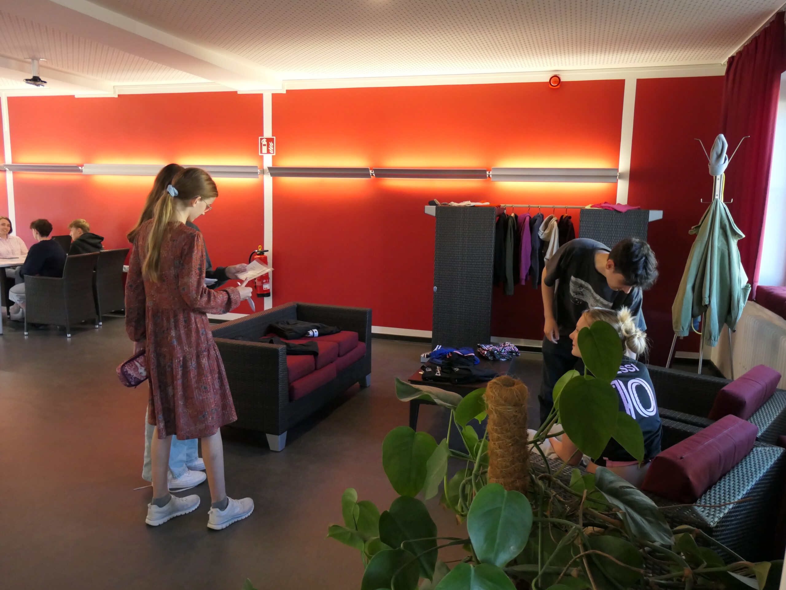 Aber der Reihe nach: zunächst galt es bei der Ankunft am JKF Airport die Kontrollen am Zoll in der Fremdsprache zu bestehen. Ausgestattet mit einem Tourpass und einer Handvoll IGSFF-Dollar konnten sich die SchülerInnen im Anschluss durch New York treiben lassen. Beginnend beim Lost Property Office musste man den fehlenden Koffer beschreiben und klären, wie das Gepäck ins Hotel geliefert werden könne. Beim freundlichen Personal des Sunshine Hotels galt es die reservierten Hotelzimmer zu beziehen und nach dem WLAN-Passwort und anderen typischen Einrichtungen der Unterkunft zu fragen. Leckere Bonbons gab es dann inklusive. Versehen mit der Keycard machten sich die Teams auf, den Tag zu planen und das „Sprachen“-Dorf zu erkunden. Die besten Vintagestücke gab es auf jeden Fall in der SportsBoutique (ein Besenstil mit Kleiderbügeln zwischen den hochgestellten Sofas kann sehr exquisit wirken). Eine professionelle Beratung für interessante Touren offerierte die Tourist Information und für die besten Tickets der aktuellen Broadwayshows musste man zur Box Office am Time Square, bevor der Night Desk Agent zum Entspannen und über den Tag reden einlud.