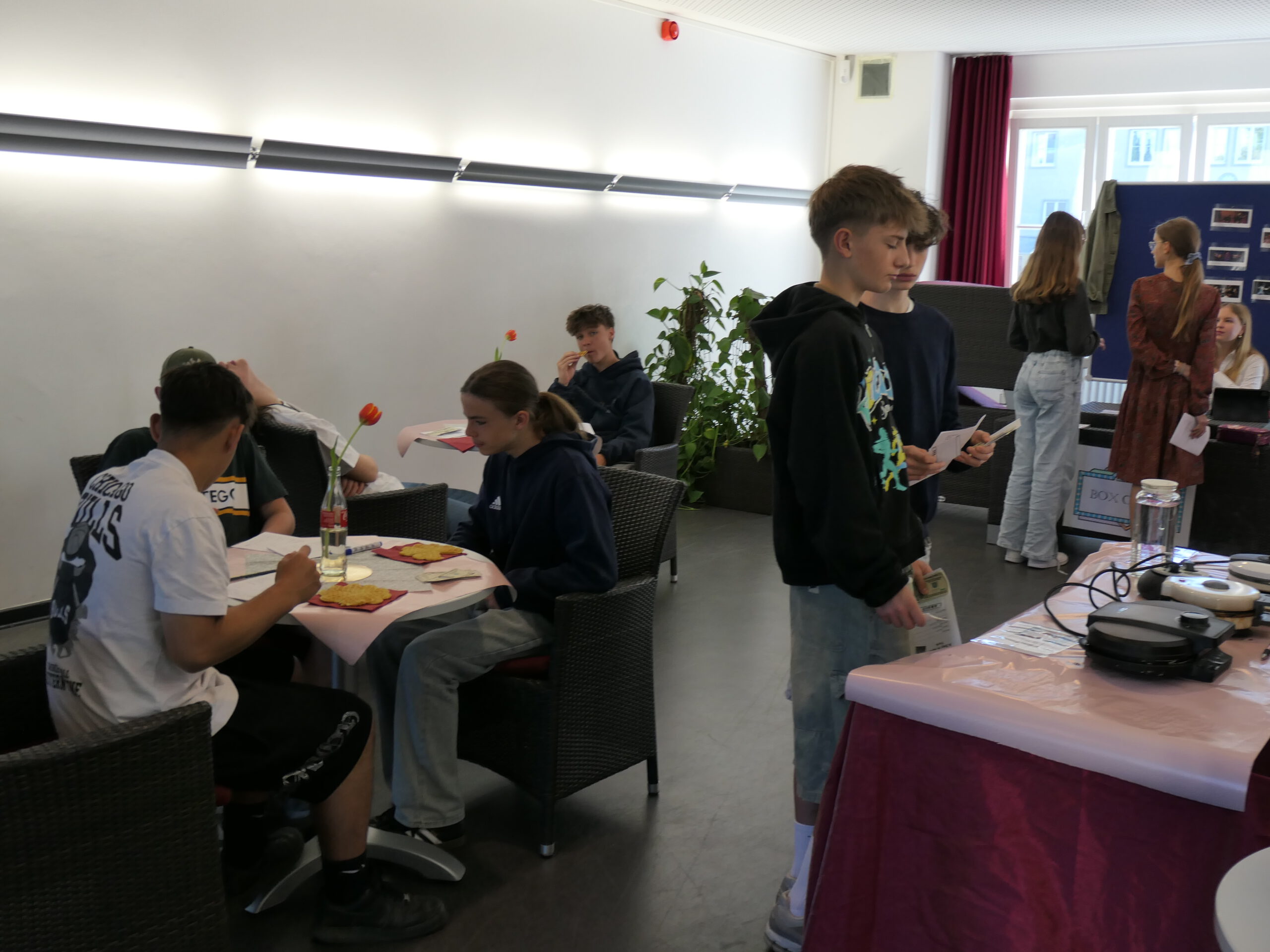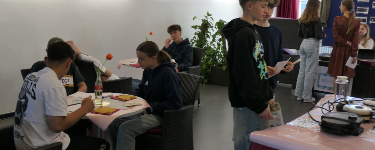 Mit sehr viel Liebe zum Detail waren die Stationen von den SchülerInnen in der Mediathek ausgestaltet worden und während man im Straßencafé Waffle Haven die frisch gebackenen Waffeln genießen durfte, konnte man die Hintergrundgeräusche einer Straße am Big Apple hören und den Blick über die Skyline schweifen lassen (gut, dass überall Monitore hängen).