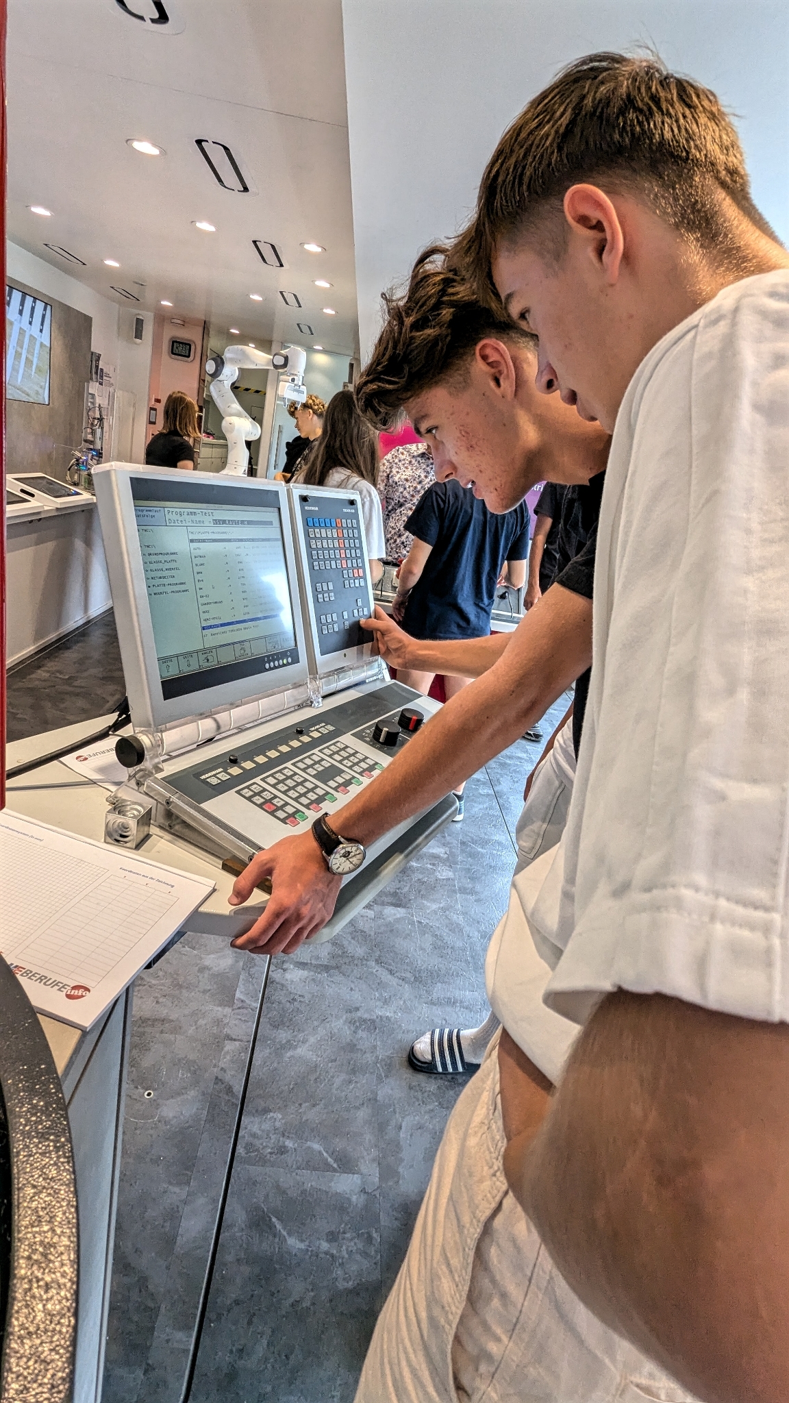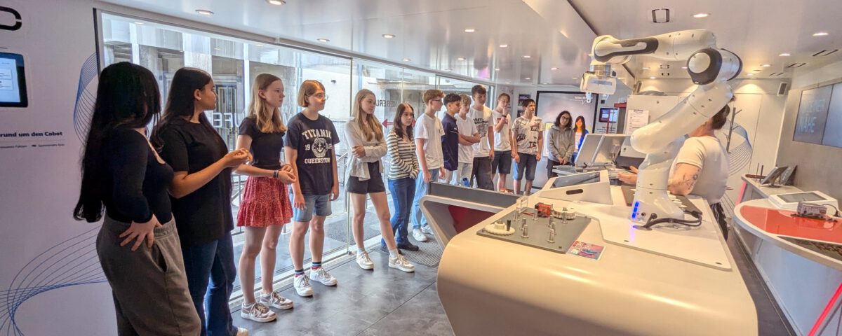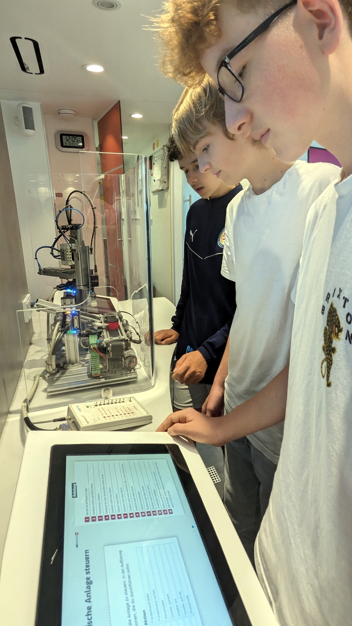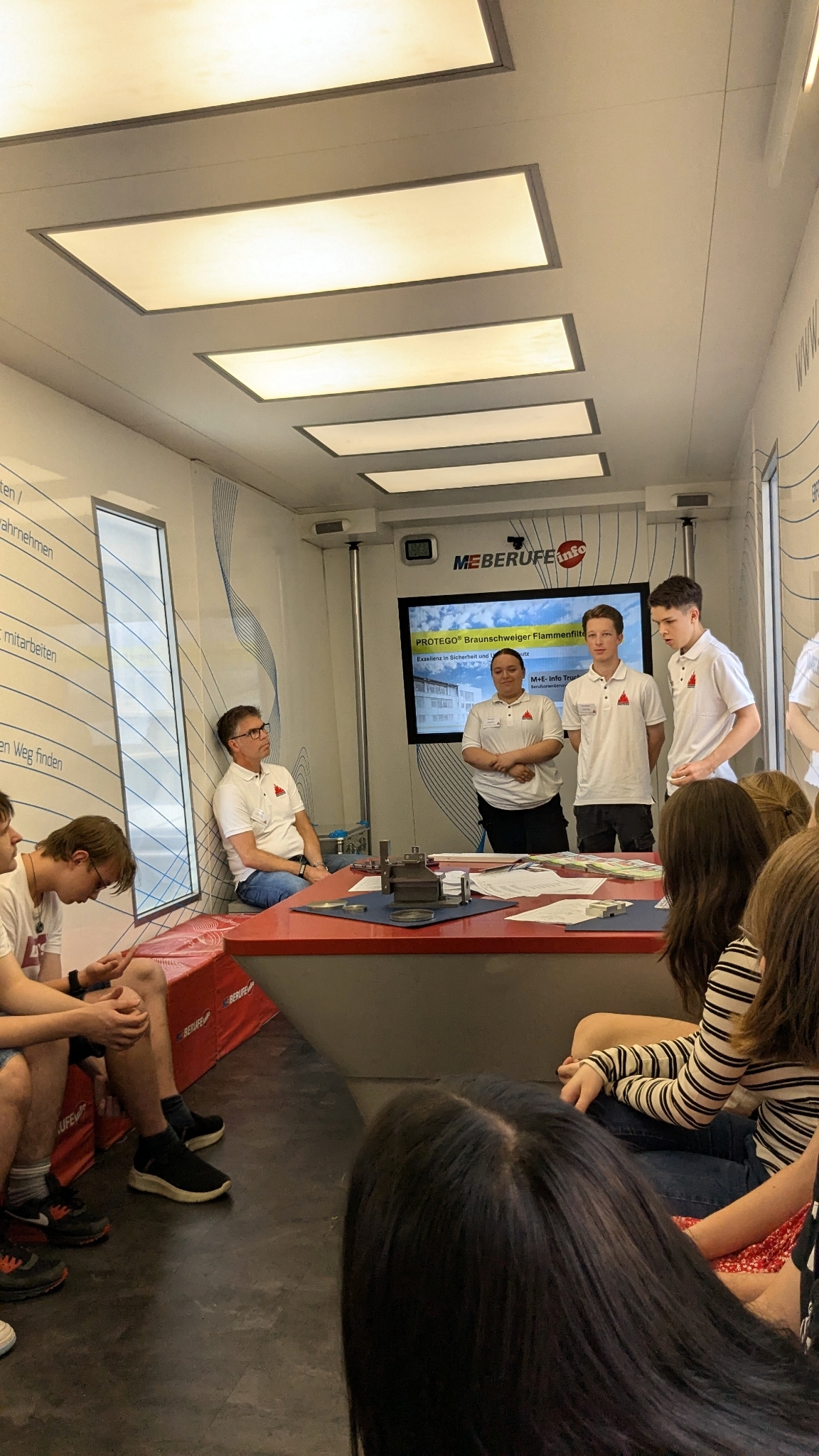 Imposant war da nicht nur das Erscheinungsbild. Auch die Inhalte konnten sich sehen lassen. Modernste Technik traf da auf unsere Schüler:innen der 9. und 10. Klassen. Gerade jetzt, wo die Bewerbungen um Berufsausbildungen anstehen, konnten sich die Jugendlichen zu Themen wie Fräsmaschinen, Stromkreise, Robotersteuerung und Fließbandfertigung informieren. Vielfältige Experimente luden zum Mitmachen ein. Rede und Antwort zu Berufsausbildungen standen junge Auszubildende der Firmen Protego/Flammenfilter und Bühler. Beides bodenständige und angesehene Braunschweiger Firmen dieser Ausbildungszweige. Und so berichteten die Auszubildenden auch ganz ungezwungen aus ihrem Arbeits- und Ausbildungsleben. Sicherlich werden die Tage so manch einem Jugendlichen neue Ideen eröffnet haben. Begrüßen konnten wir auch die Jugendlichen der Profil Technik-Kurse der J. F. Kennedy-Realschule. Auch sie profitierten von dem kostenlosen Angebot. Vielen Dank an Herrn Rohde von der Stiftung Niedersachsen-Metall für die tatkräftige Unterstützung.