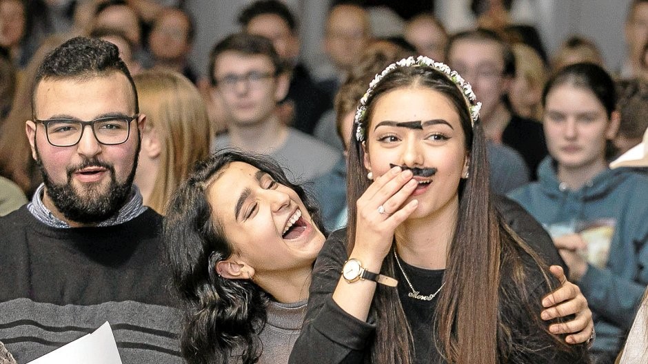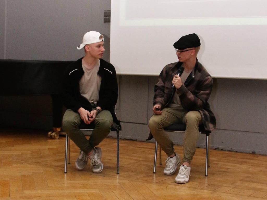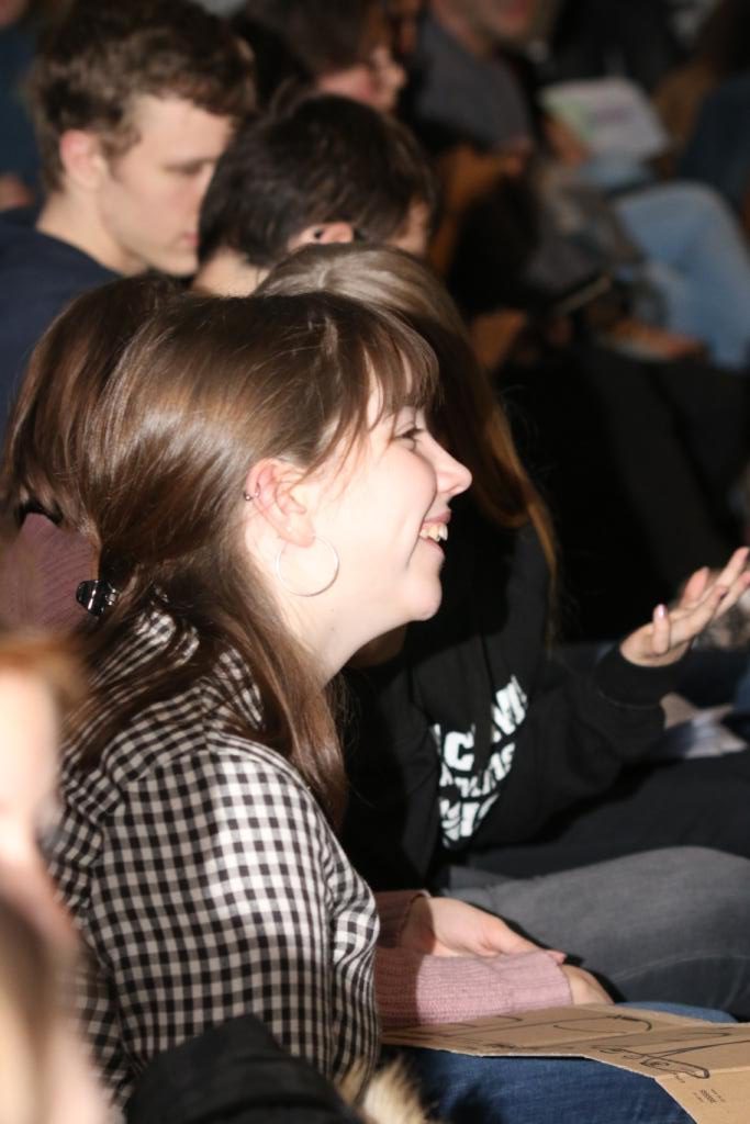 Was Schulstress eigentlich bedeutet, wie er entsteht und was man daran ändern kann? Hannah Yilmaz dichtet sich durch ihren Slam und kommt damit gut an. Sie belegt den dritten Platz. Im letzten Vortrag des Abends treten Thomas und Lucas Palluch als Hans (83) und Flüchtlingskind Amar (17) auf. Die beiden haben scheinbar nichts gemeinsam. Außer, dass sie bei lauten Geräuschen zucken müssen. Beide haben furchtbare Kriegserlebnisse hinter sich.