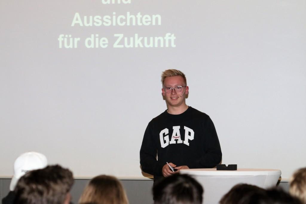 Nach einem Gong geht es weiter. Alexander Hentschel und Jonah Vösterling liefern sich auf der Bühne einen Kampf. Mensch gegen Pflanze. Umweltschützer gegen Schädling. Und das in Verkleidungen. Das Fazit: Wir können die Herkulespflanze nicht besiegen. Weniger witzig gestalteten sich die nächsten Themen. Dadurch sind sie aber nicht weniger interessant. Dustin Liß und Kjell Völzke reden darüber, wie sich rechtes Gedankengut früher verbreitet hat – und heute noch verbreitet. Und setzen ein klares Statement: „So weit wie im Dritten Reich darf es nie wieder kommen.“