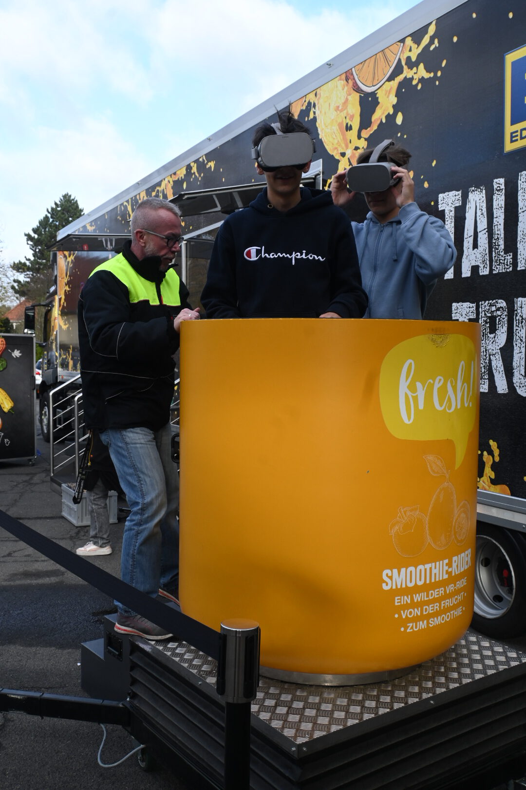 Ein Highlight war natürlich die virtuelle Orange, die sich zu einem Smoothie verarbeiten ließ. Mit 3D-Brille stieg man da in einen beweglichen Mixer und dann ging es – buchstäblich – rund! Da wird sich so manches Mitleid mit der Frucht entwickelt haben!