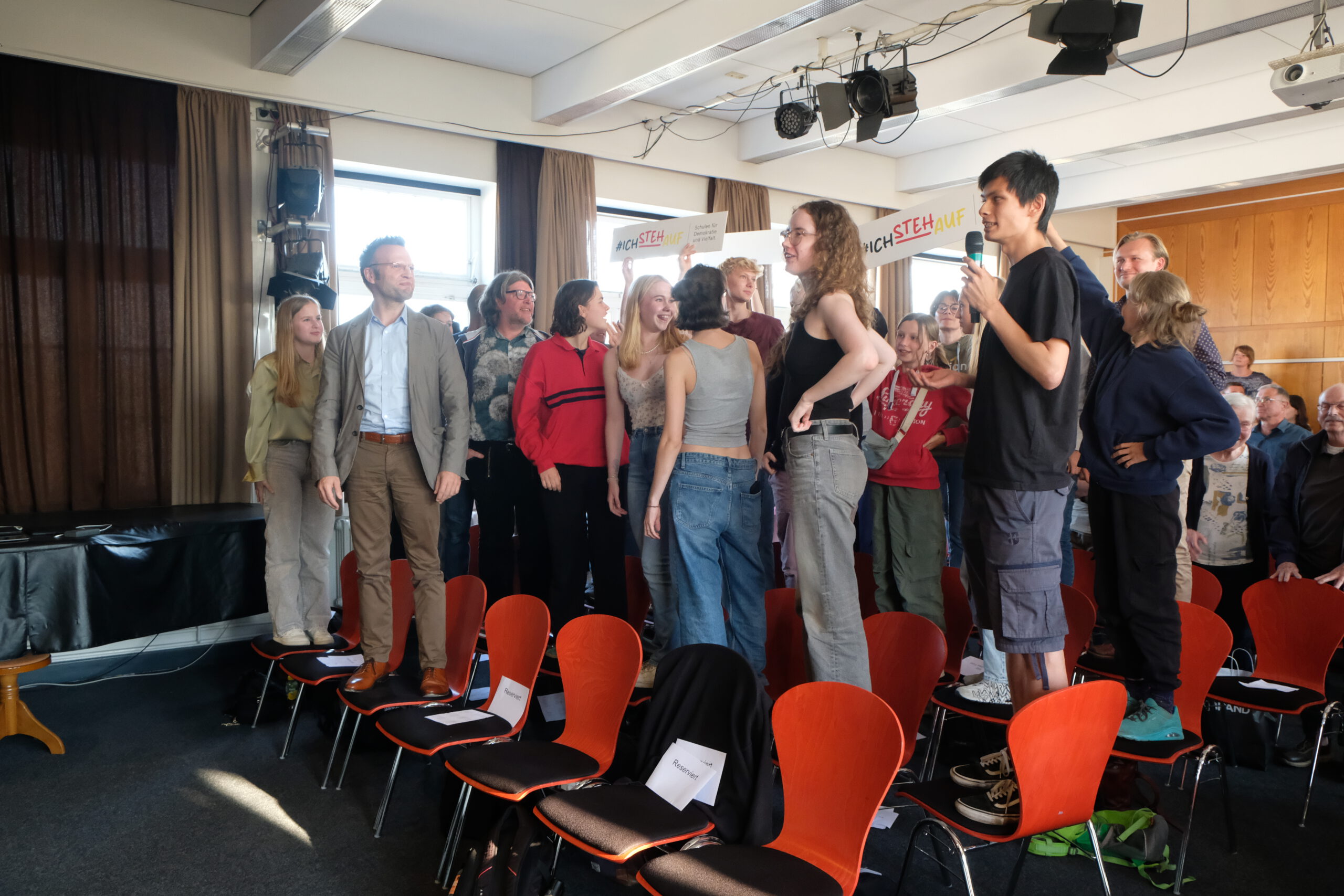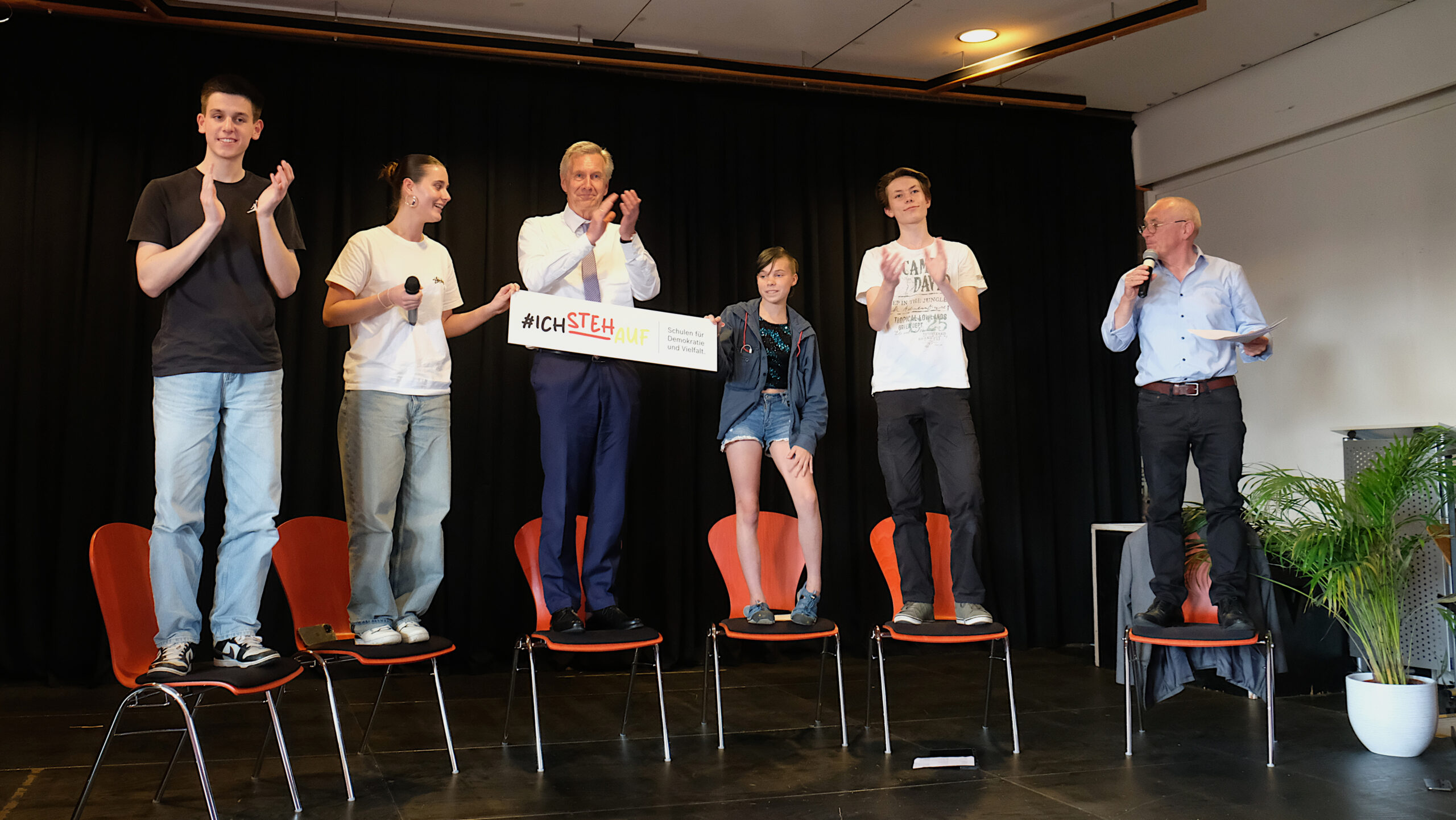 Zum Ende des Abends stand Jamil aus unserem SV-Team auf einem Stuhl und rief alle dazu auf, es ihm gleichzutun. Die Idee dahinter stammt von der Aktion ,,#IchStehAuf für Demokratie und Vielfalt“, welche am 6. Juni 2024 stattfindet und bei der Schüler:innen in ganz Deutschland dazu aufgerufen sind, gemeinsam als Klasse aufzustehen und somit ein Zeichen für Demokratie zu setzen, wie Jamil auf dem Stuhl stehend erklärte. Insbesondere jetzt, kurz vor der Europawahl, bei der erstmals auch Schüler:innen ab 16 Jahren wählen dürfen, ist dies ein starkes Symbol. Alle Teilnehmer:innen in der voll besetzten Aula, also auch der ehemalige Budespräsident Christian Wulff, nahmen die Einladung an und stellten sich auf ihren Stuhl – ein voller Erfolg!