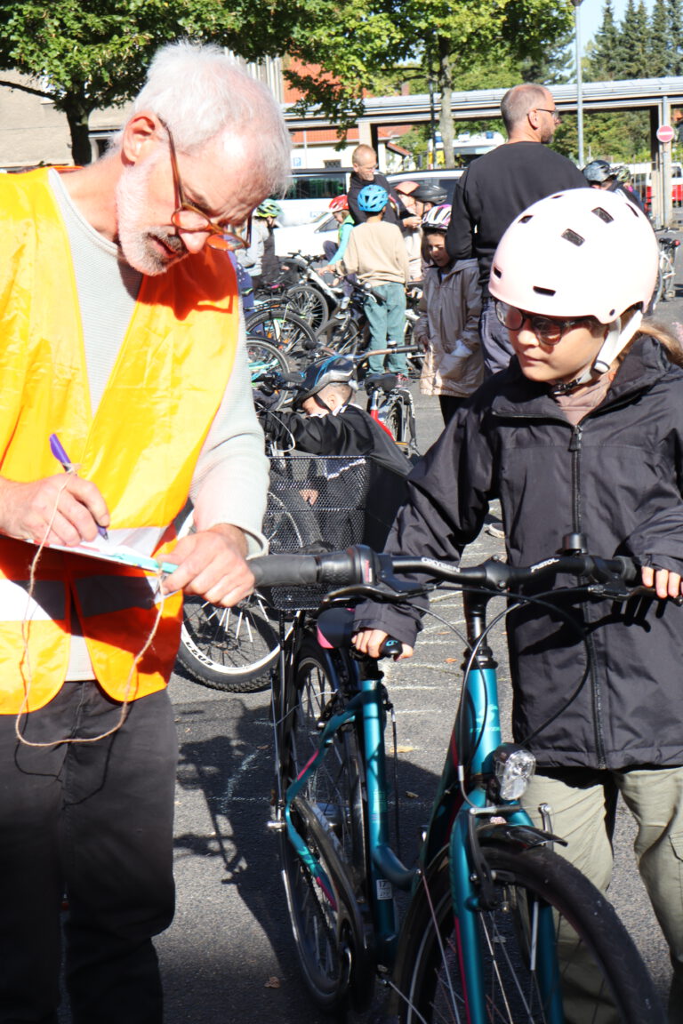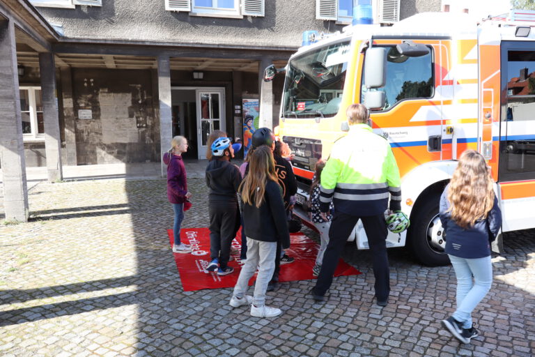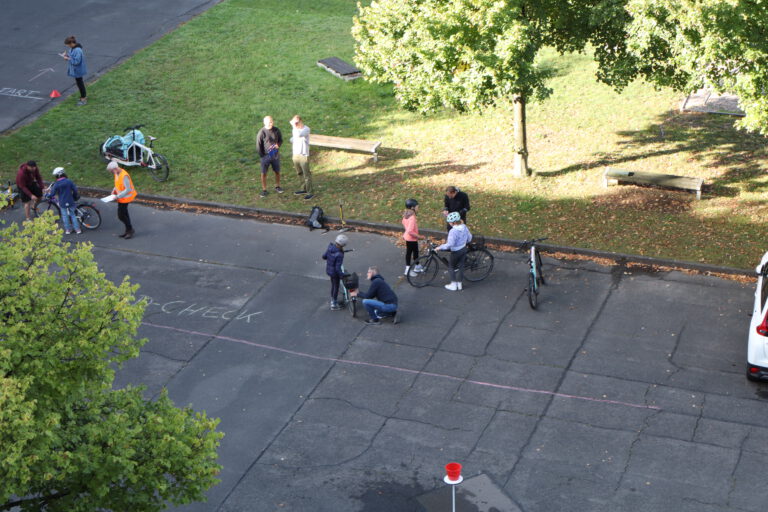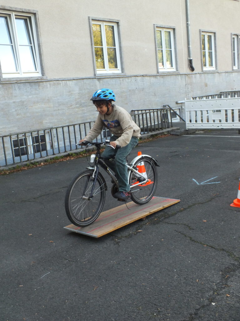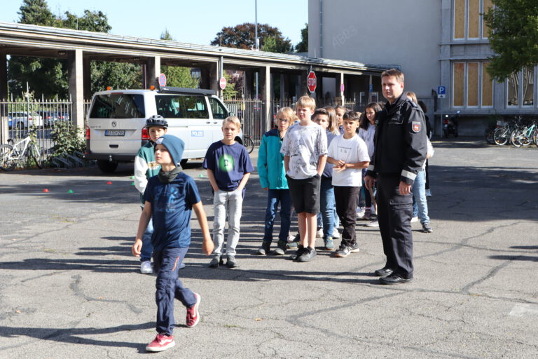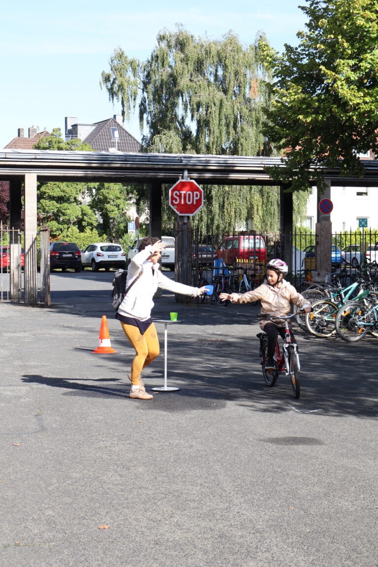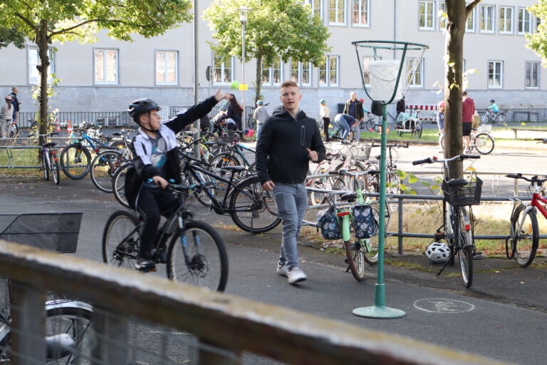 An vier Stationen konnten die Jugendlichen ihr Wissen und Können auf zwei Rädern beweisen. Kann ich mit meinem verkehrssicheren Fahrrad Slalom fahren, eine Wippe überqueren, während der Fahrt einen Ball fangen und in einen Basketballkorb treffen, einen Becher Wasser aufnehmen und in einen Eimer leeren? Kann ich kleinere Verletzungen behandeln? Gelingt mir der sichere Halt in einer brenzligen Verkehrssituation? Erkenne ich den toten Winkel im Spiegel eines LKW-Fahrers? Diese Fragen klärten sich an einem vergnüglichen Vormittag. Unser Dank gilt besonders allen fleißigen Helfer:innen aus der neuen Elternschaft, den Sozialpädagog:innen, der Berufsfeuerwehr, dem Präventionsteam der Polizei und dem ASB. Ohne diese Hilfe wäre eine solche Aktion nicht möglich. KLASSE!