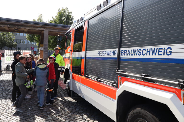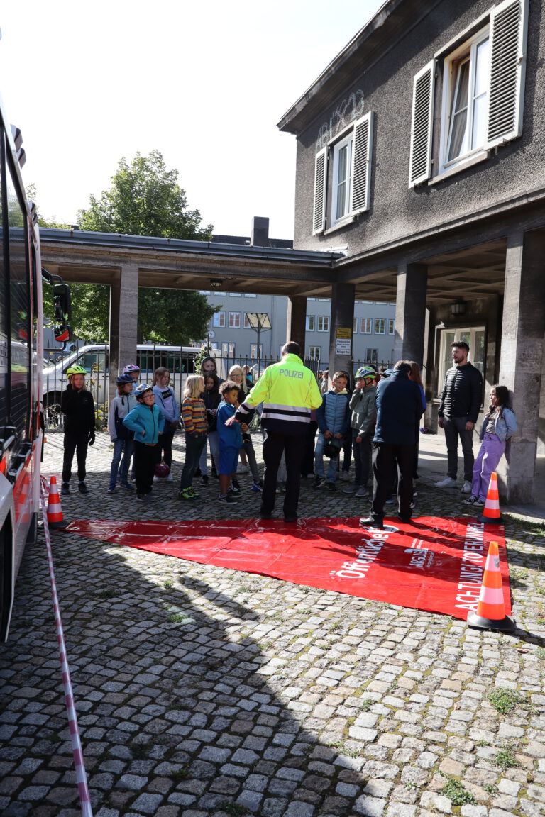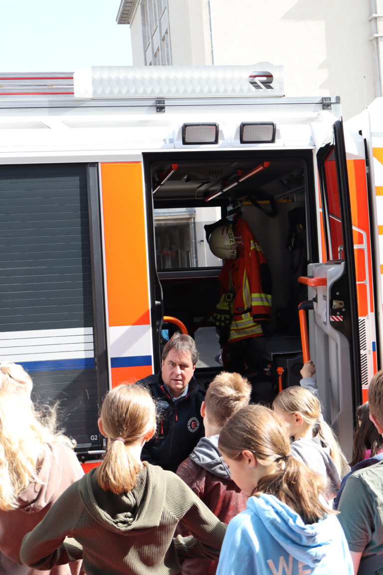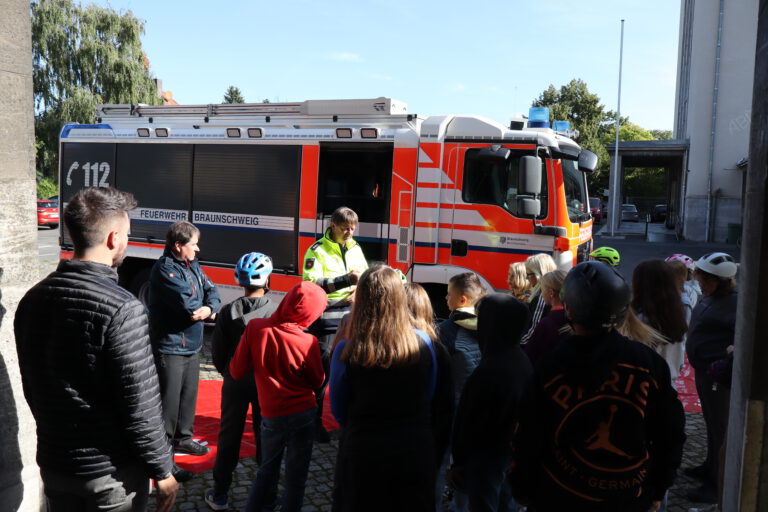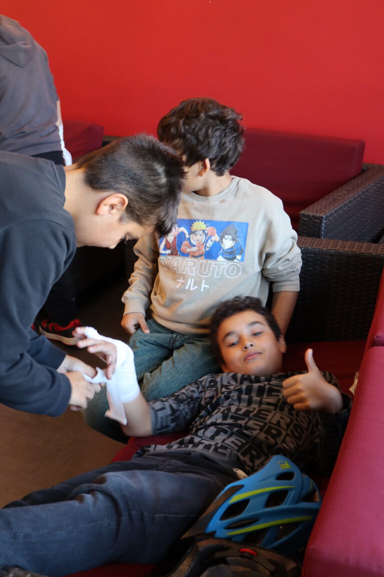 An vier Stationen konnten die Jugendlichen ihr Wissen und Können auf zwei Rädern beweisen. Kann ich mit meinem verkehrssicheren Fahrrad Slalom fahren, eine Wippe überqueren, während der Fahrt einen Ball fangen und in einen Basketballkorb treffen, einen Becher Wasser aufnehmen und in einen Eimer leeren? Kann ich kleinere Verletzungen behandeln? Gelingt mir der sichere Halt in einer brenzligen Verkehrssituation? Erkenne ich den toten Winkel im Spiegel eines LKW-Fahrers? Diese Fragen klärten sich an einem vergnüglichen Vormittag. Unser Dank gilt besonders allen fleißigen Helfer:innen aus der neuen Elternschaft, den Sozialpädagog:innen, der Berufsfeuerwehr, dem Präventionsteam der Polizei und dem ASB. Ohne diese Hilfe wäre eine solche Aktion nicht möglich. KLASSE!