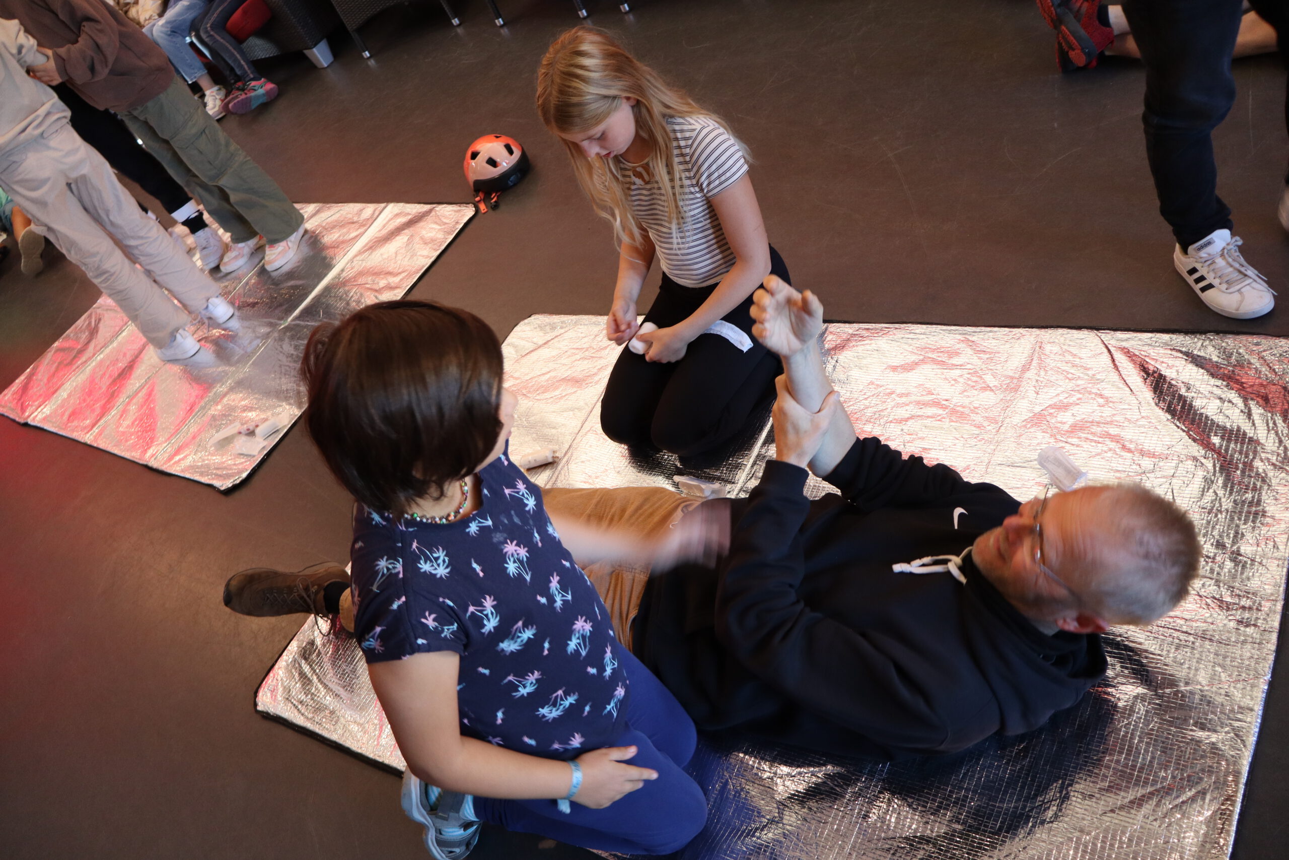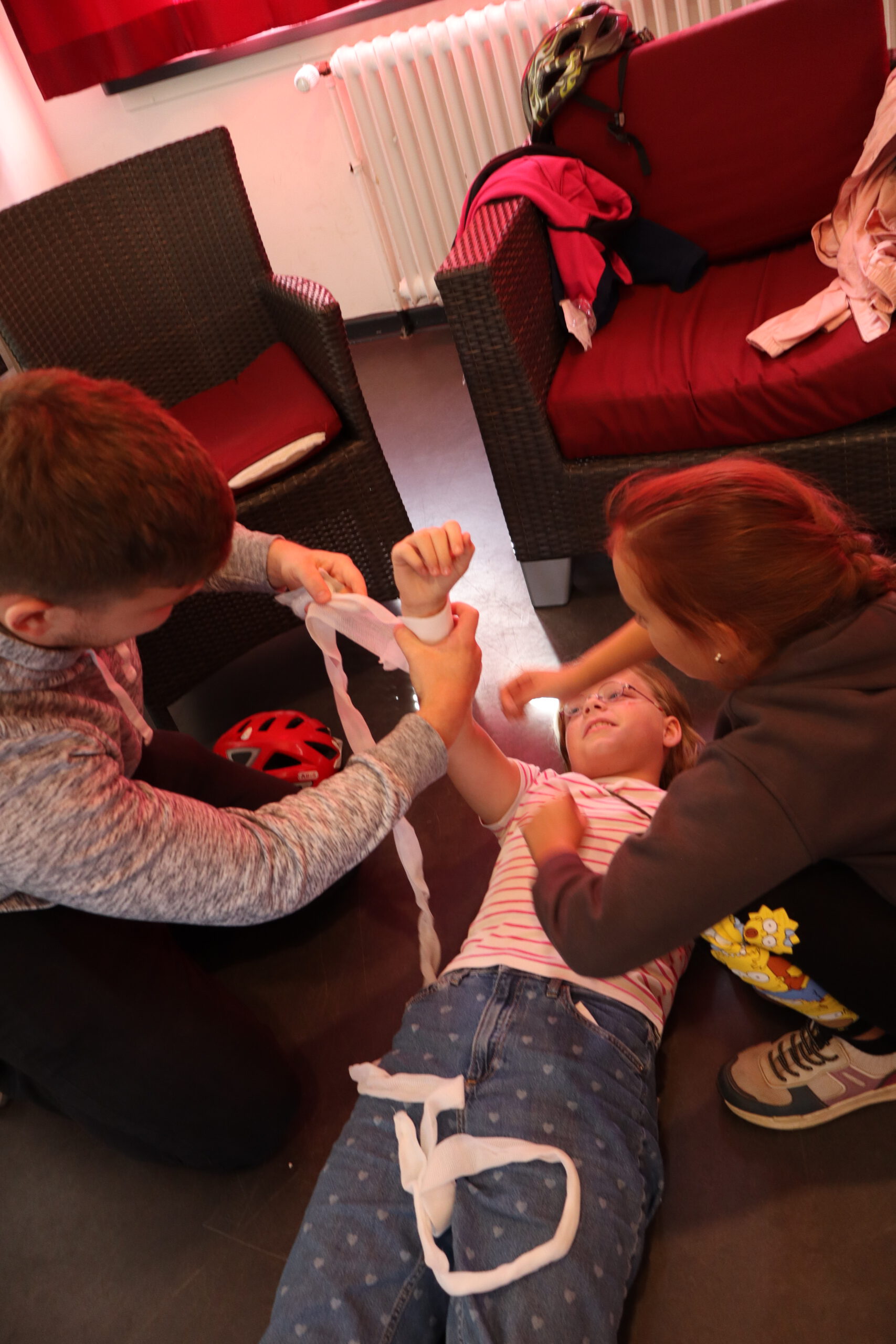 An vier Stationen konnten die Jugendlichen ihr Wissen und Können auf zwei Rädern beweisen. Kann ich mit meinem verkehrssicheren Fahrrad Slalom fahren, eine Wippe überqueren, während der Fahrt einen Ball fangen und in einen Basketballkorb treffen, einen Becher Wasser aufnehmen und in einen Eimer leeren? Kann ich kleinere Verletzungen behandeln? Gelingt mir der sichere Halt in einer brenzligen Verkehrssituation? Erkenne ich den toten Winkel im Spiegel eines LKW-Fahrers? Diese Fragen klärten sich an einem vergnüglichen Vormittag. Unser Dank gilt besonders allen fleißigen Helfer:innen aus der neuen Elternschaft, den Sozialpädagog:innen, der Berufsfeuerwehr, dem Präventionsteam der Polizei und dem ASB. Ohne diese Hilfe wäre eine solche Aktion nicht möglich. KLASSE!