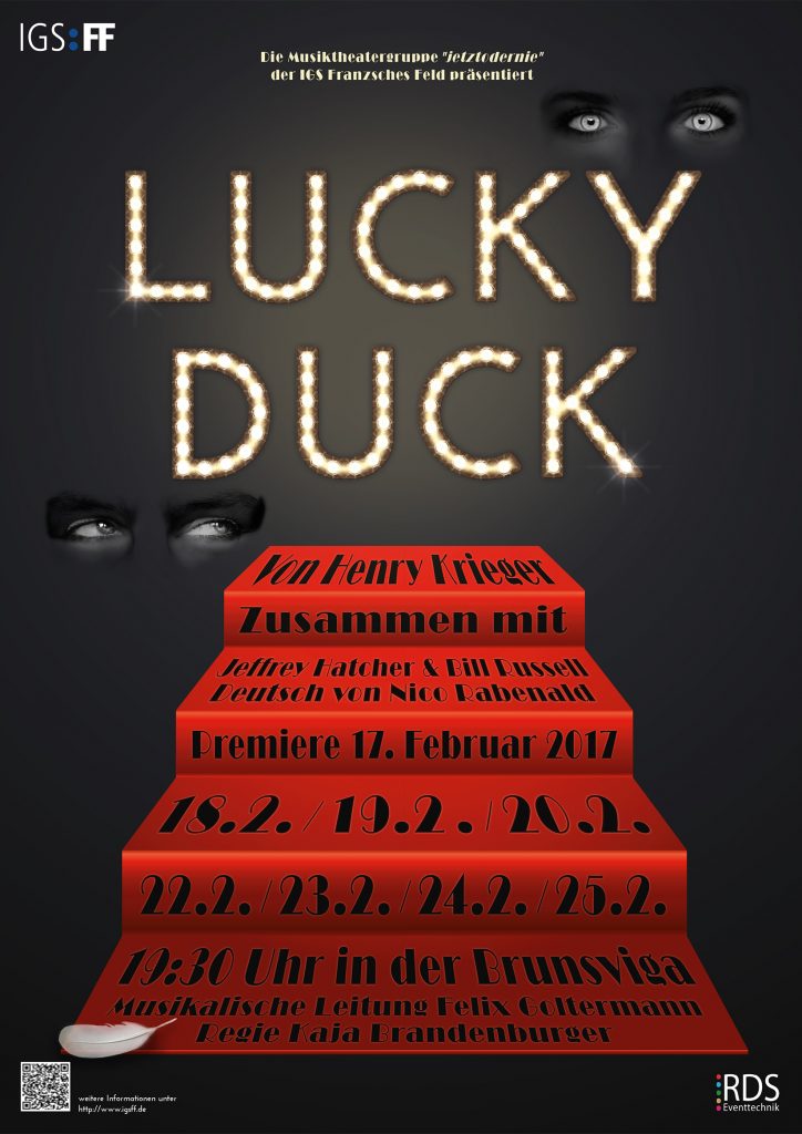 jetztodernie, die Musiktheatergruppe der IGS Franzsches Feld, stellt sich – nach den erfolgreichen Produktionen Shockheaded Peter, Scuderi, Zum Sterben Schön, Alice im Wunderland und Tom Sawyer und Huckleberry Finn – nun der Herausforderung, die deutsche Erstaufführung von LUCKY DUCK auf die Bühne zu bringen. „jetztodernie“ sind Schülerinnen und Schüler, Freunde und Unterstützer, Helfer und Förderer der IGS Franzsches Feld unter der Leitung von Kaja Brandenburger (Regie) und Felix Goltermann (Musikalische Leitung).