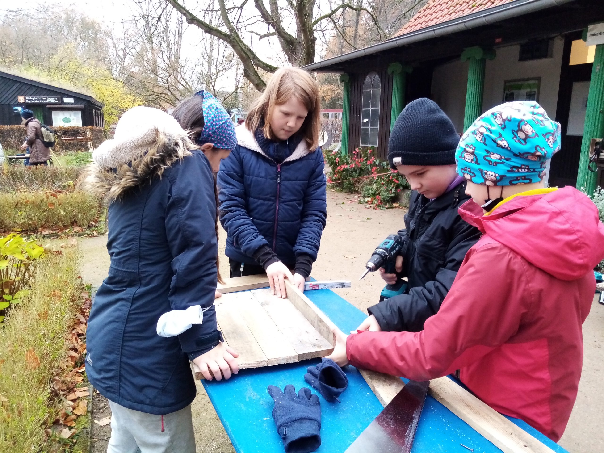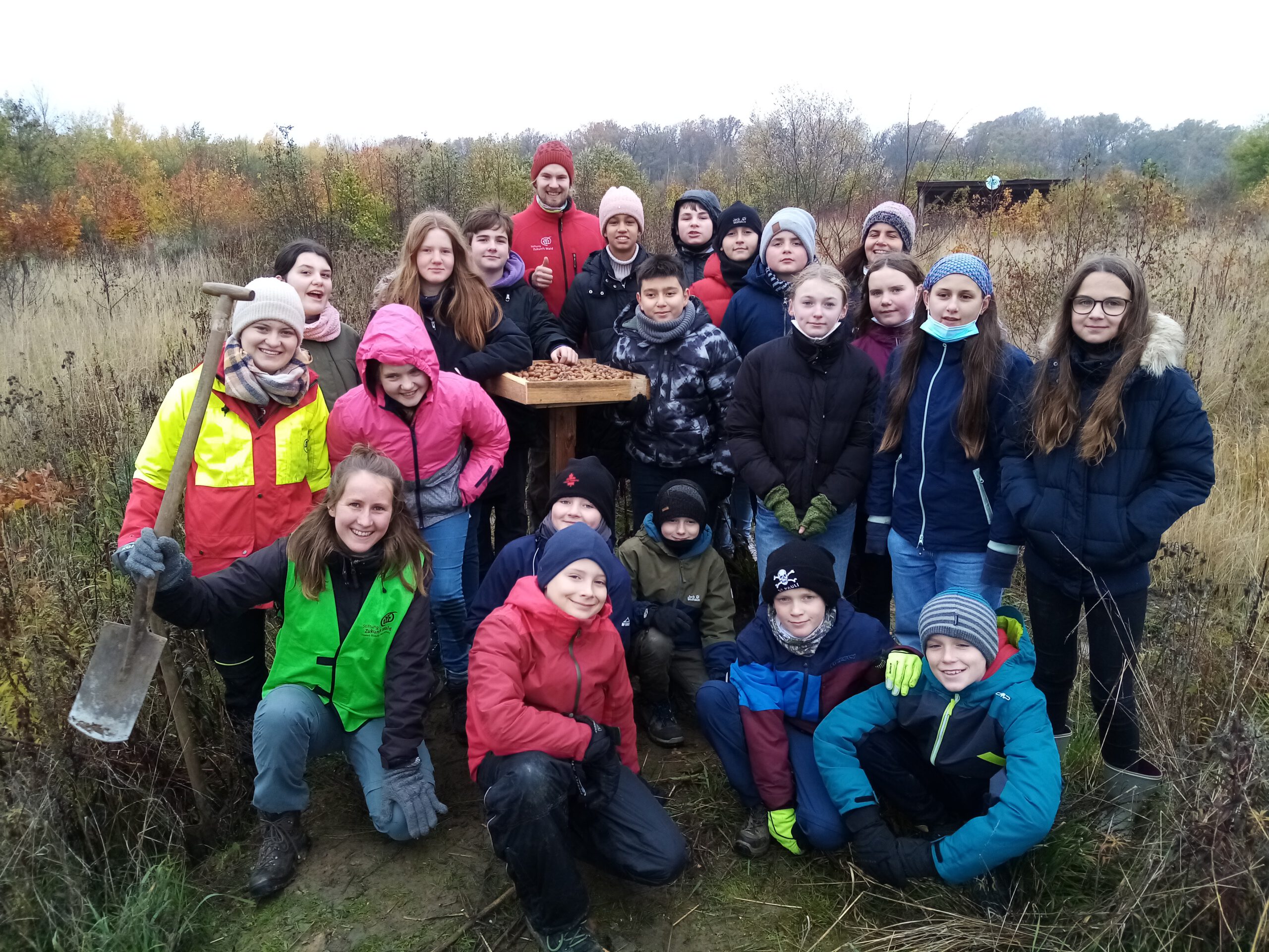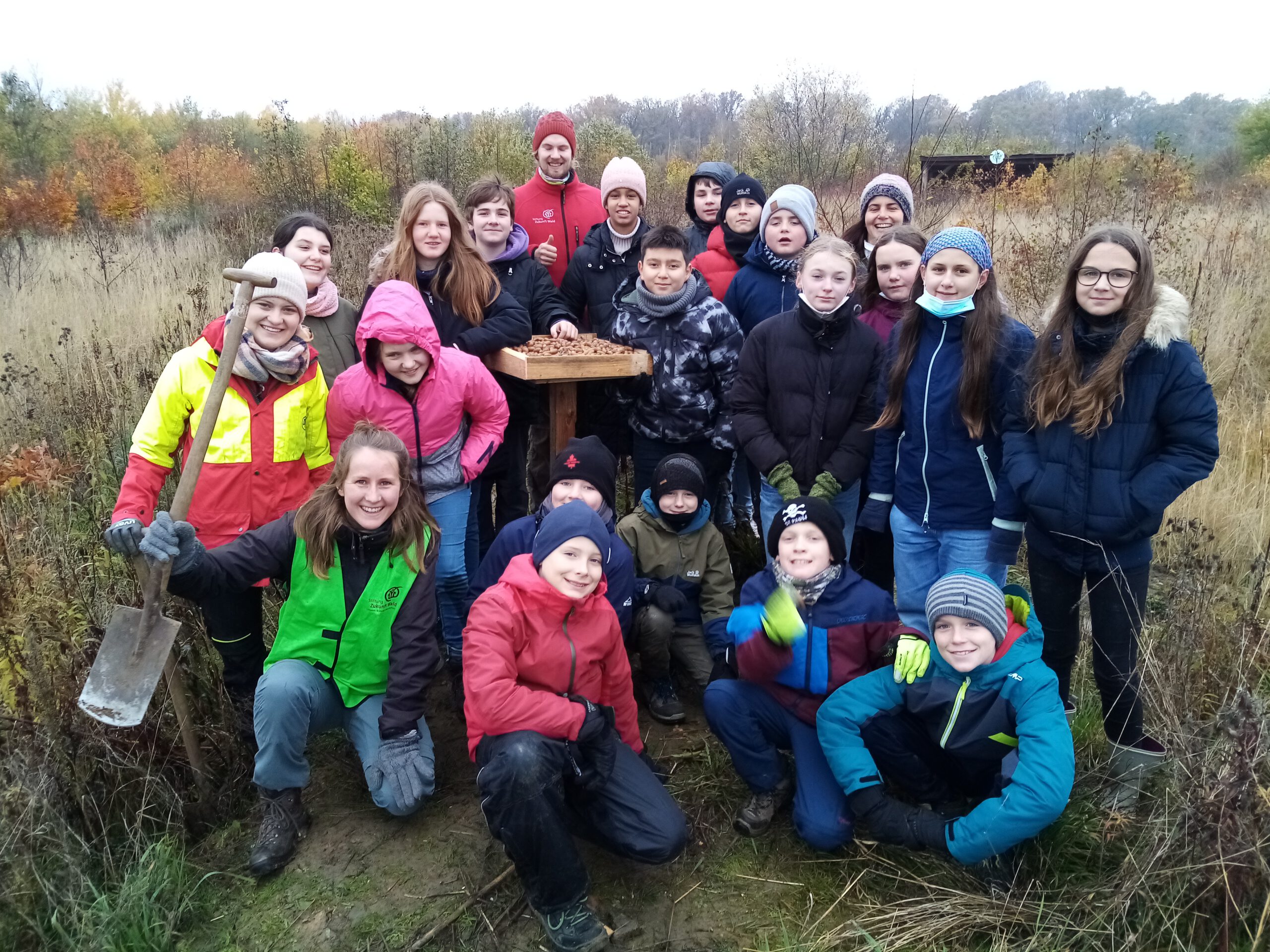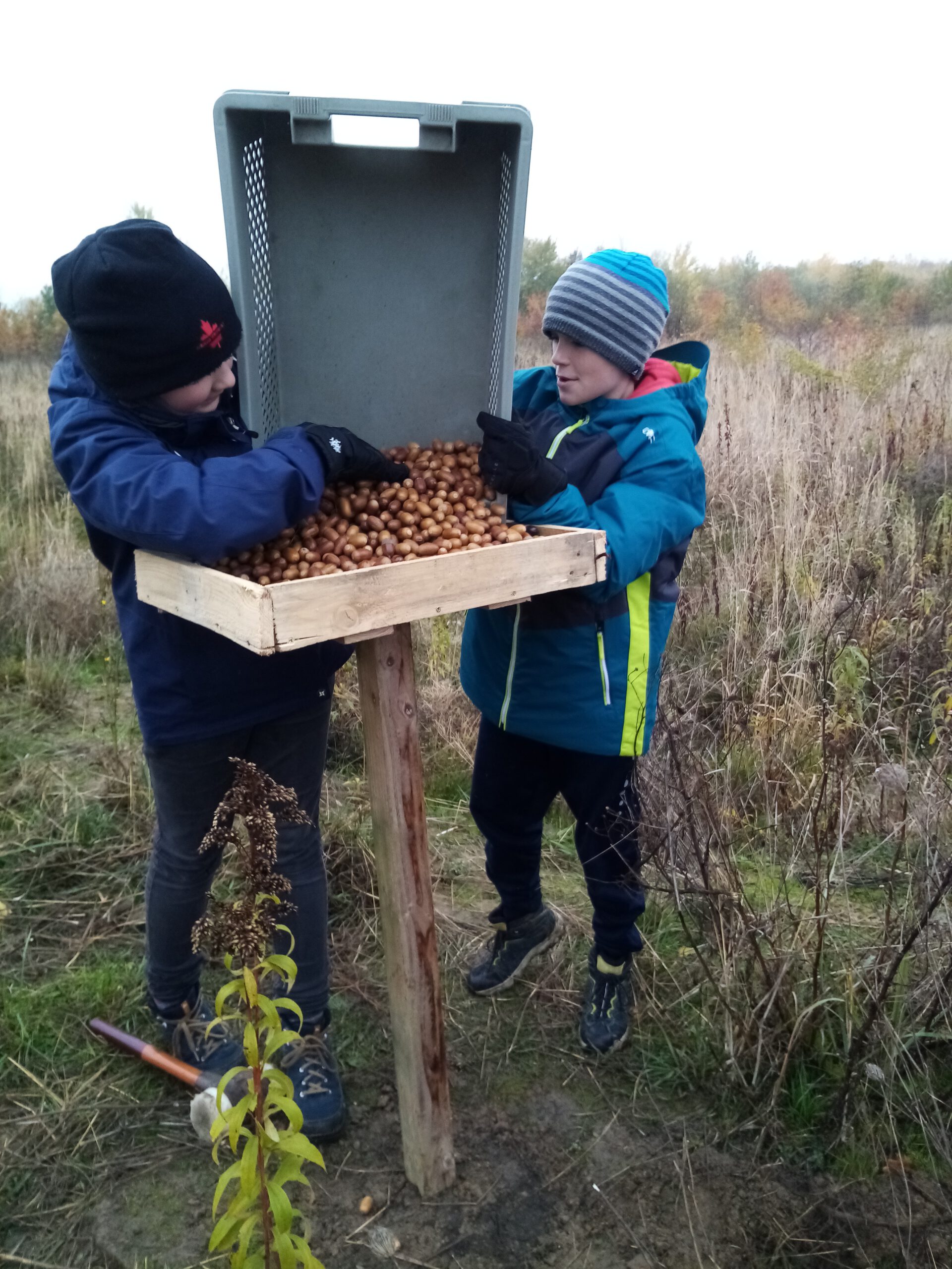 24. November 2022Nachdem Teil 1 der Aktion bereits am 19.11.2021 stattfand, konnte das Projekt der Klasse von Frau Sittler und Herrn Baptist (5.2 bzw. 6.2) am 18.11.2022 vollendet werden. Das Projekt zielt darauf ab die Eigenschaft des Eichelhähers Eicheln als Nahrungsvorräte zu verstecken (ähnlich wie ein Eichhörnchen) sich zu Nutze zu machen und die Ausbreitung der Eichen in unserem Schulwald in Hondelage zu unterstützen. Hierbei bekamen wir wieder viel Unterstützung von unserm Schulwald-Partner, der Stiftung Zukunft Wald. 2021 baute Paula Machunze mit den damals 5. Klässler:innen aus Palettenresten tatkräftig sogenannte „Häher-Tische“ zusammen. Diese Aktion fand am Regionalen UmweltbildungsZentrum Dowesee statt und wir man auf den Bildern erkennen kann, hat es allen riesigen Spaß gemacht. 2021 gab es aber kaum Eicheln in den Wäldern, sodass das Projekt zweitgeteilt werden musste. Diesen Herbst gab es hingegen ein regelrechtes „Eichelmastjahr“ und die mittlerweile 6. Klässler:innen sammelten über mehrere Wochen fleißig Eicheln in der Umgebung unserer Schule und ihren Wohnorten. Teil 2 der Aktion fand direkt im Schulwald Hondelage statt. Trotz der niedrigen Außentemperaturen von knapp 2 Grad Celsius stellten sich 18 mutige und willige Schüler:innen sich der Aufgabe die im Vorjahr zusammengebauten „Häher-Tische“ im Schulwald aufzustellen. Der Niederschlag blieb zum Glück am Vormittag aus. Vor Ort trafen wir wieder auf die Mitarbeiter:innen der Stiftung Zukunft Wald Johannes Wiese, Anneke Hoppe und Sonja Kopp, welche Holz und alles andere Notwendige dabei hatten und mit den Kindern in kleinen Arbeitsgruppen die fünf Eichelhähertische standfest aufbauten, die im Anschluss mit den zuvor gesammelten Eicheln befüllt wurden (siehe Bilder). Für einige Schüler:innen ohne passendes Schuhwerk standen Gummistiefel im Container vor Ort. Ein „Spezial-Team“ pflanzte gleichzeitig einen „Klassenbaum“ ein, einen Gingko, sowie im Anschluss noch einige Ligustersträucher und kleine Ahorne, die Herr Hettwer aus dem Schulgarten der IGS FF spendiert hatte. Alles in allem eine rundum gelungene Aktion und auch die Mitarbeiter:innen der Stiftung Zukunft Wald waren voll des Lobes.