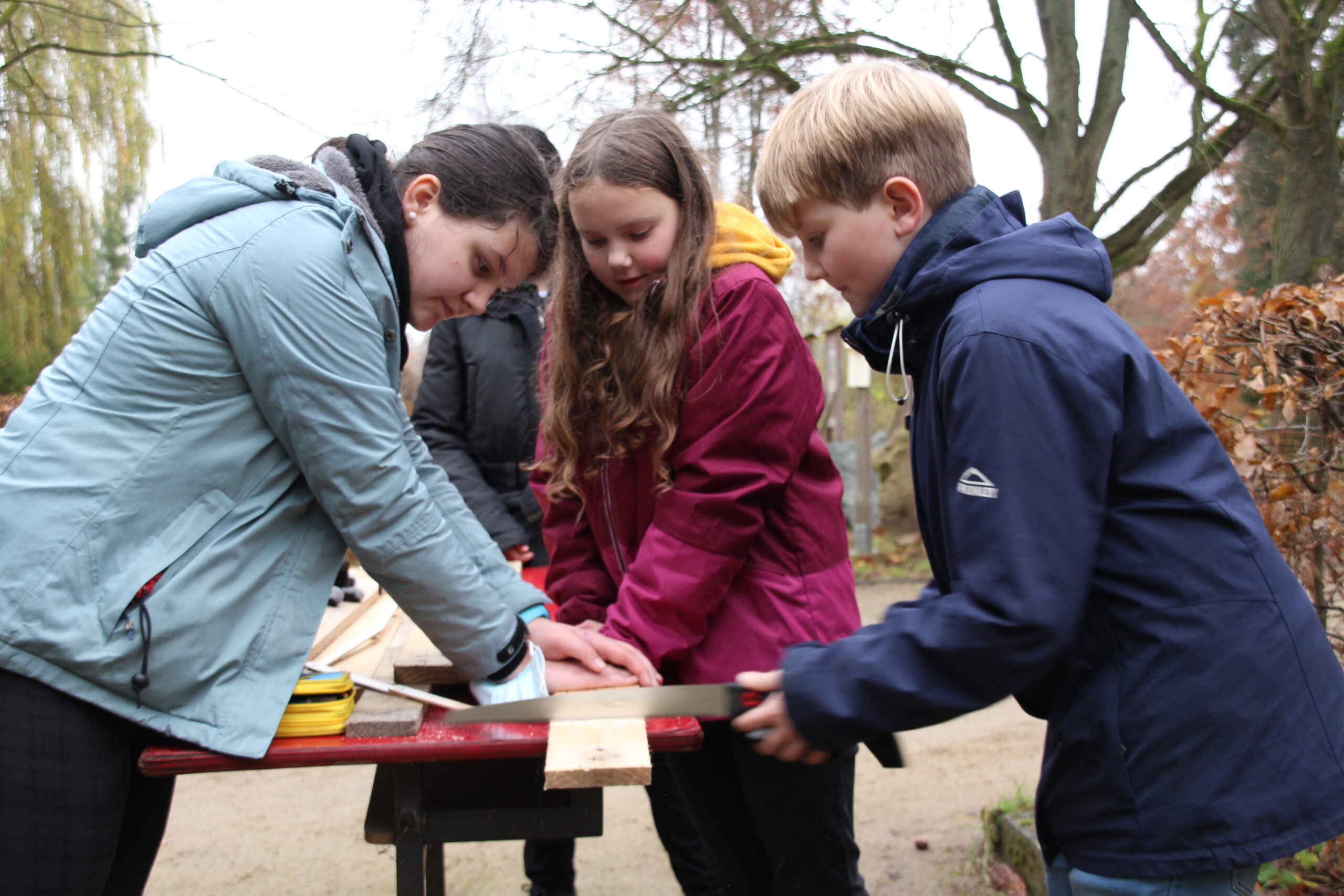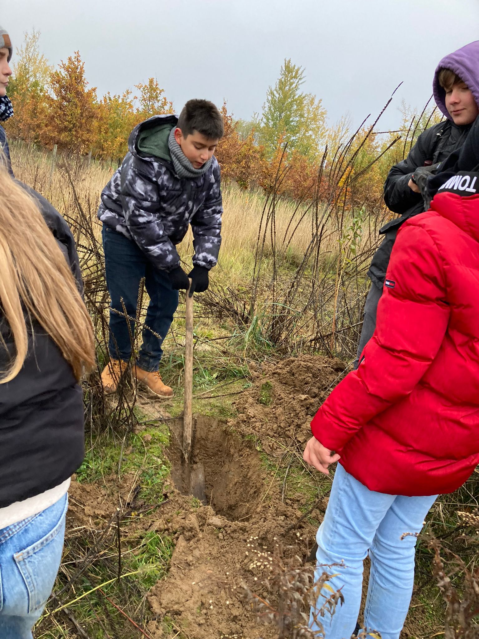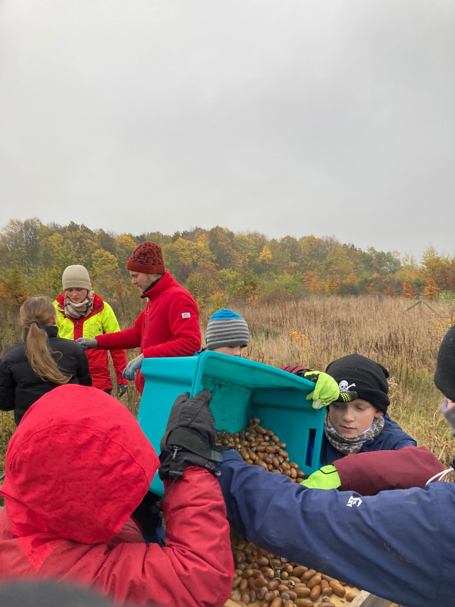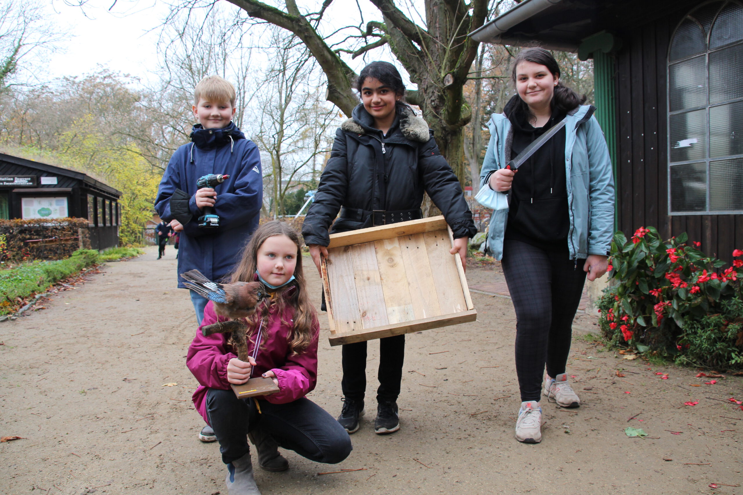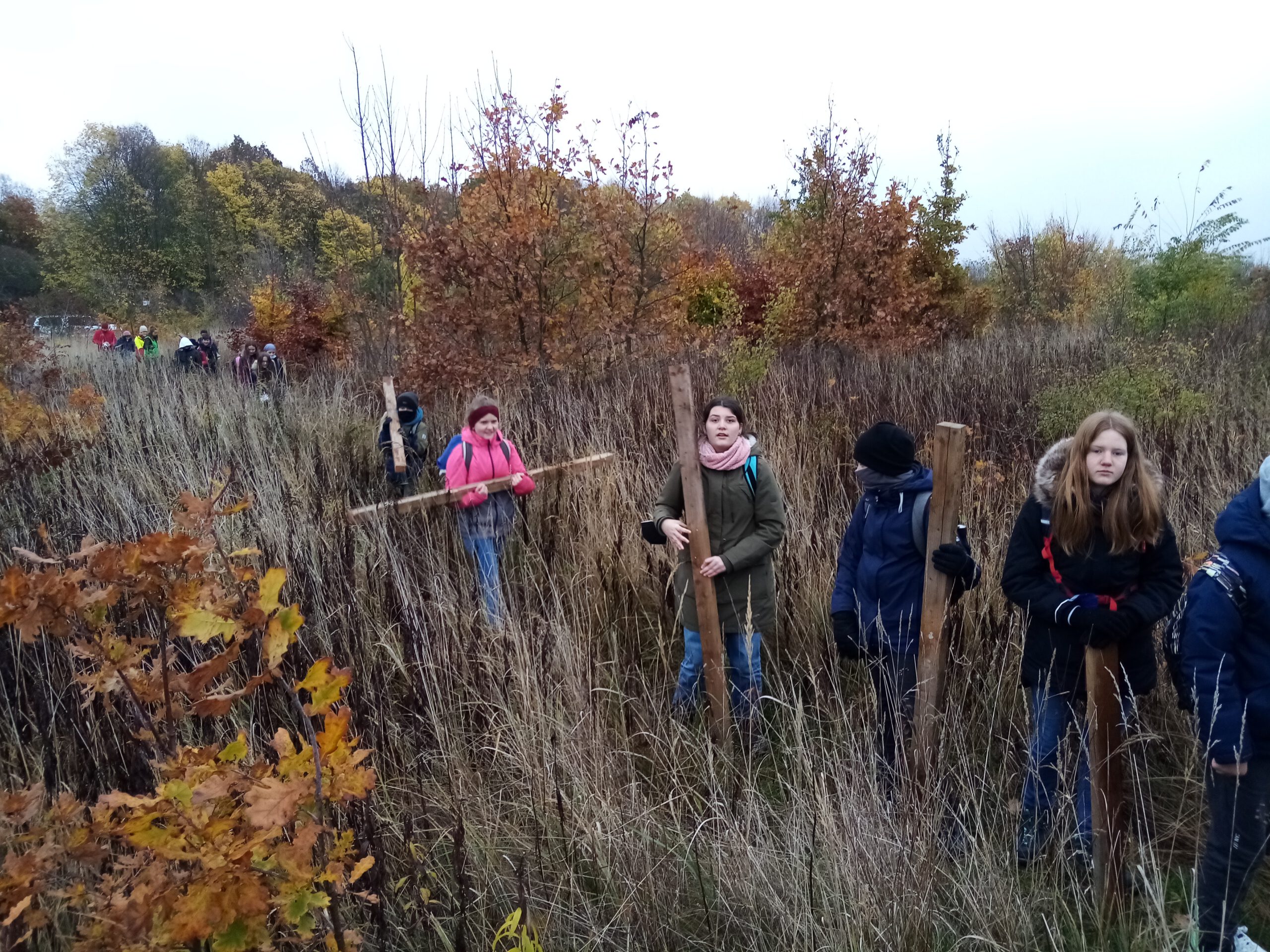 24. November 2022Nachdem Teil 1 der Aktion bereits am 19.11.2021 stattfand, konnte das Projekt der Klasse von Frau Sittler und Herrn Baptist (5.2 bzw. 6.2) am 18.11.2022 vollendet werden. Das Projekt zielt darauf ab die Eigenschaft des Eichelhähers Eicheln als Nahrungsvorräte zu verstecken (ähnlich wie ein Eichhörnchen) sich zu Nutze zu machen und die Ausbreitung der Eichen in unserem Schulwald in Hondelage zu unterstützen. Hierbei bekamen wir wieder viel Unterstützung von unserm Schulwald-Partner, der Stiftung Zukunft Wald. 2021 baute Paula Machunze mit den damals 5. Klässler:innen aus Palettenresten tatkräftig sogenannte „Häher-Tische“ zusammen. Diese Aktion fand am Regionalen UmweltbildungsZentrum Dowesee statt und wir man auf den Bildern erkennen kann, hat es allen riesigen Spaß gemacht. 2021 gab es aber kaum Eicheln in den Wäldern, sodass das Projekt zweitgeteilt werden musste. Diesen Herbst gab es hingegen ein regelrechtes „Eichelmastjahr“ und die mittlerweile 6. Klässler:innen sammelten über mehrere Wochen fleißig Eicheln in der Umgebung unserer Schule und ihren Wohnorten. Teil 2 der Aktion fand direkt im Schulwald Hondelage statt. Trotz der niedrigen Außentemperaturen von knapp 2 Grad Celsius stellten sich 18 mutige und willige Schüler:innen sich der Aufgabe die im Vorjahr zusammengebauten „Häher-Tische“ im Schulwald aufzustellen. Der Niederschlag blieb zum Glück am Vormittag aus. Vor Ort trafen wir wieder auf die Mitarbeiter:innen der Stiftung Zukunft Wald Johannes Wiese, Anneke Hoppe und Sonja Kopp, welche Holz und alles andere Notwendige dabei hatten und mit den Kindern in kleinen Arbeitsgruppen die fünf Eichelhähertische standfest aufbauten, die im Anschluss mit den zuvor gesammelten Eicheln befüllt wurden (siehe Bilder). Für einige Schüler:innen ohne passendes Schuhwerk standen Gummistiefel im Container vor Ort. Ein „Spezial-Team“ pflanzte gleichzeitig einen „Klassenbaum“ ein, einen Gingko, sowie im Anschluss noch einige Ligustersträucher und kleine Ahorne, die Herr Hettwer aus dem Schulgarten der IGS FF spendiert hatte. Alles in allem eine rundum gelungene Aktion und auch die Mitarbeiter:innen der Stiftung Zukunft Wald waren voll des Lobes.