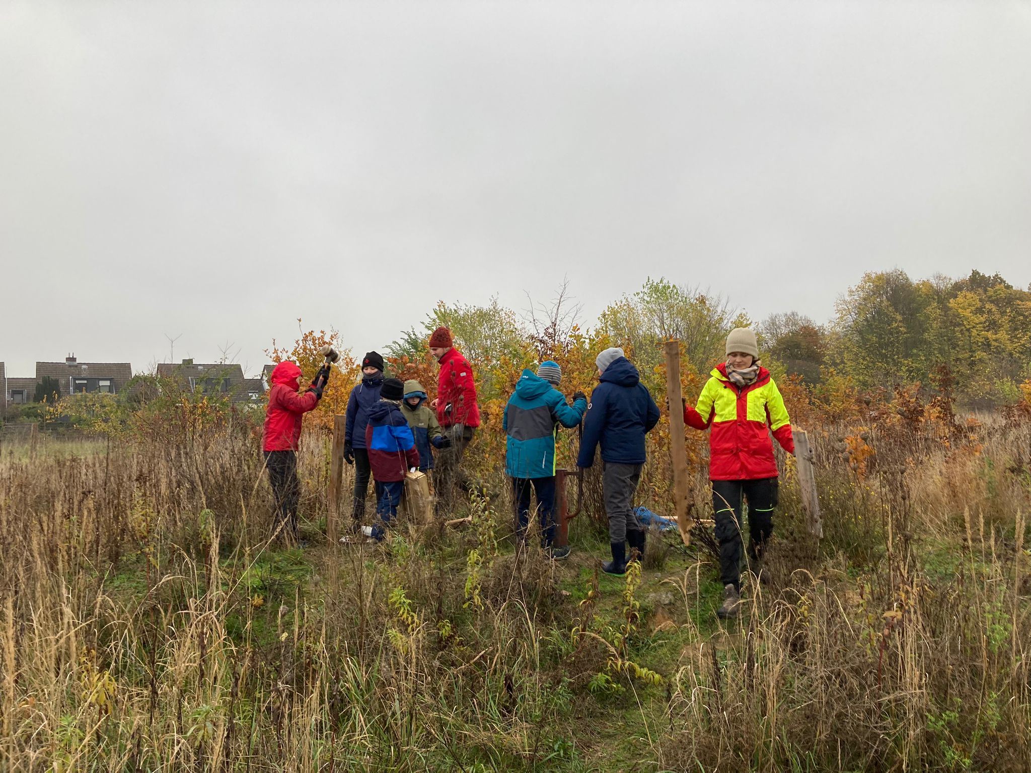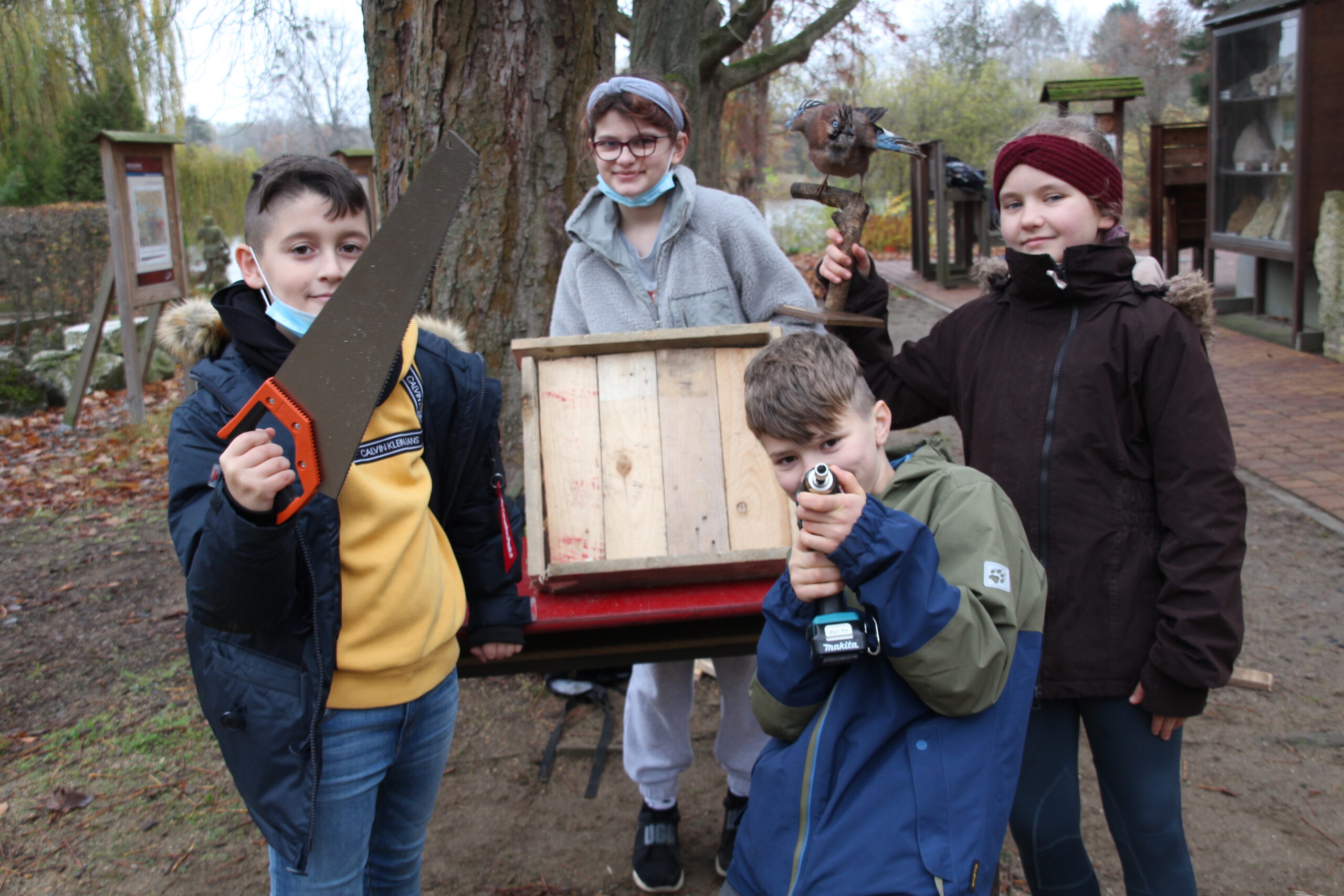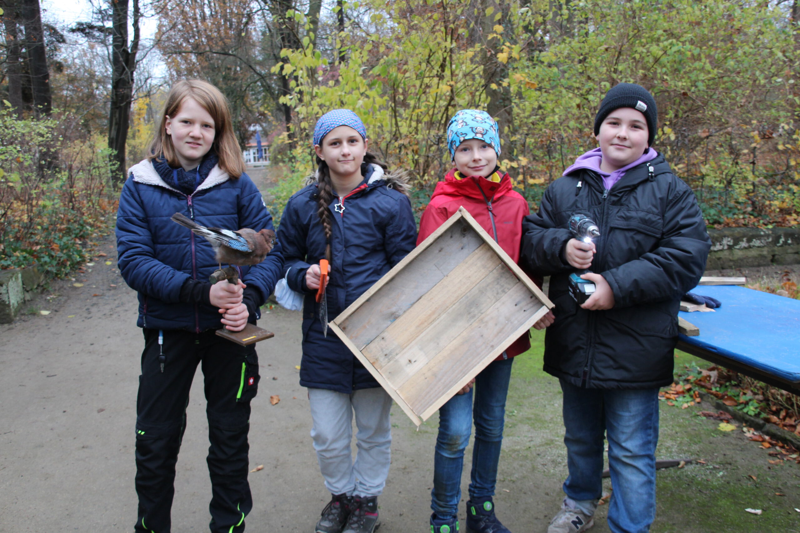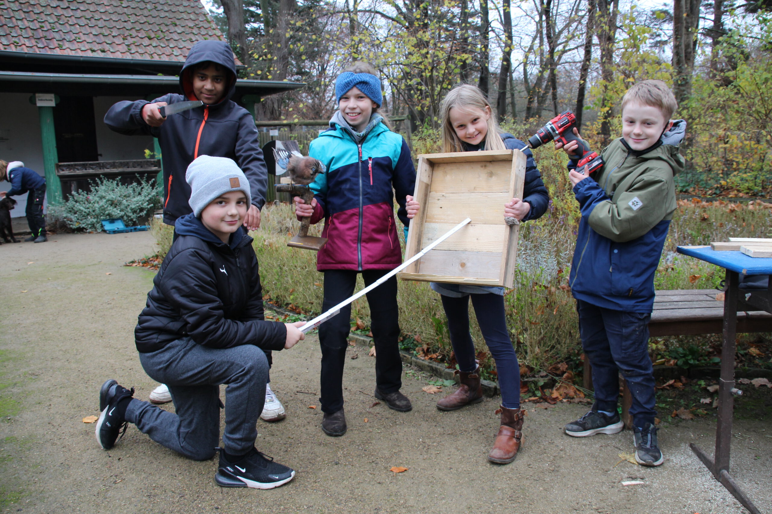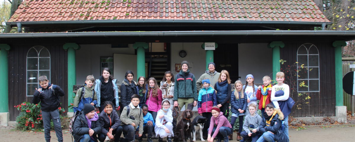 24. November 2022Nachdem Teil 1 der Aktion bereits am 19.11.2021 stattfand, konnte das Projekt der Klasse von Frau Sittler und Herrn Baptist (5.2 bzw. 6.2) am 18.11.2022 vollendet werden. Das Projekt zielt darauf ab die Eigenschaft des Eichelhähers Eicheln als Nahrungsvorräte zu verstecken (ähnlich wie ein Eichhörnchen) sich zu Nutze zu machen und die Ausbreitung der Eichen in unserem Schulwald in Hondelage zu unterstützen. Hierbei bekamen wir wieder viel Unterstützung von unserm Schulwald-Partner, der Stiftung Zukunft Wald. 2021 baute Paula Machunze mit den damals 5. Klässler:innen aus Palettenresten tatkräftig sogenannte „Häher-Tische“ zusammen. Diese Aktion fand am Regionalen UmweltbildungsZentrum Dowesee statt und wir man auf den Bildern erkennen kann, hat es allen riesigen Spaß gemacht. 2021 gab es aber kaum Eicheln in den Wäldern, sodass das Projekt zweitgeteilt werden musste. Diesen Herbst gab es hingegen ein regelrechtes „Eichelmastjahr“ und die mittlerweile 6. Klässler:innen sammelten über mehrere Wochen fleißig Eicheln in der Umgebung unserer Schule und ihren Wohnorten. Teil 2 der Aktion fand direkt im Schulwald Hondelage statt. Trotz der niedrigen Außentemperaturen von knapp 2 Grad Celsius stellten sich 18 mutige und willige Schüler:innen sich der Aufgabe die im Vorjahr zusammengebauten „Häher-Tische“ im Schulwald aufzustellen. Der Niederschlag blieb zum Glück am Vormittag aus. Vor Ort trafen wir wieder auf die Mitarbeiter:innen der Stiftung Zukunft Wald Johannes Wiese, Anneke Hoppe und Sonja Kopp, welche Holz und alles andere Notwendige dabei hatten und mit den Kindern in kleinen Arbeitsgruppen die fünf Eichelhähertische standfest aufbauten, die im Anschluss mit den zuvor gesammelten Eicheln befüllt wurden (siehe Bilder). Für einige Schüler:innen ohne passendes Schuhwerk standen Gummistiefel im Container vor Ort. Ein „Spezial-Team“ pflanzte gleichzeitig einen „Klassenbaum“ ein, einen Gingko, sowie im Anschluss noch einige Ligustersträucher und kleine Ahorne, die Herr Hettwer aus dem Schulgarten der IGS FF spendiert hatte. Alles in allem eine rundum gelungene Aktion und auch die Mitarbeiter:innen der Stiftung Zukunft Wald waren voll des Lobes.