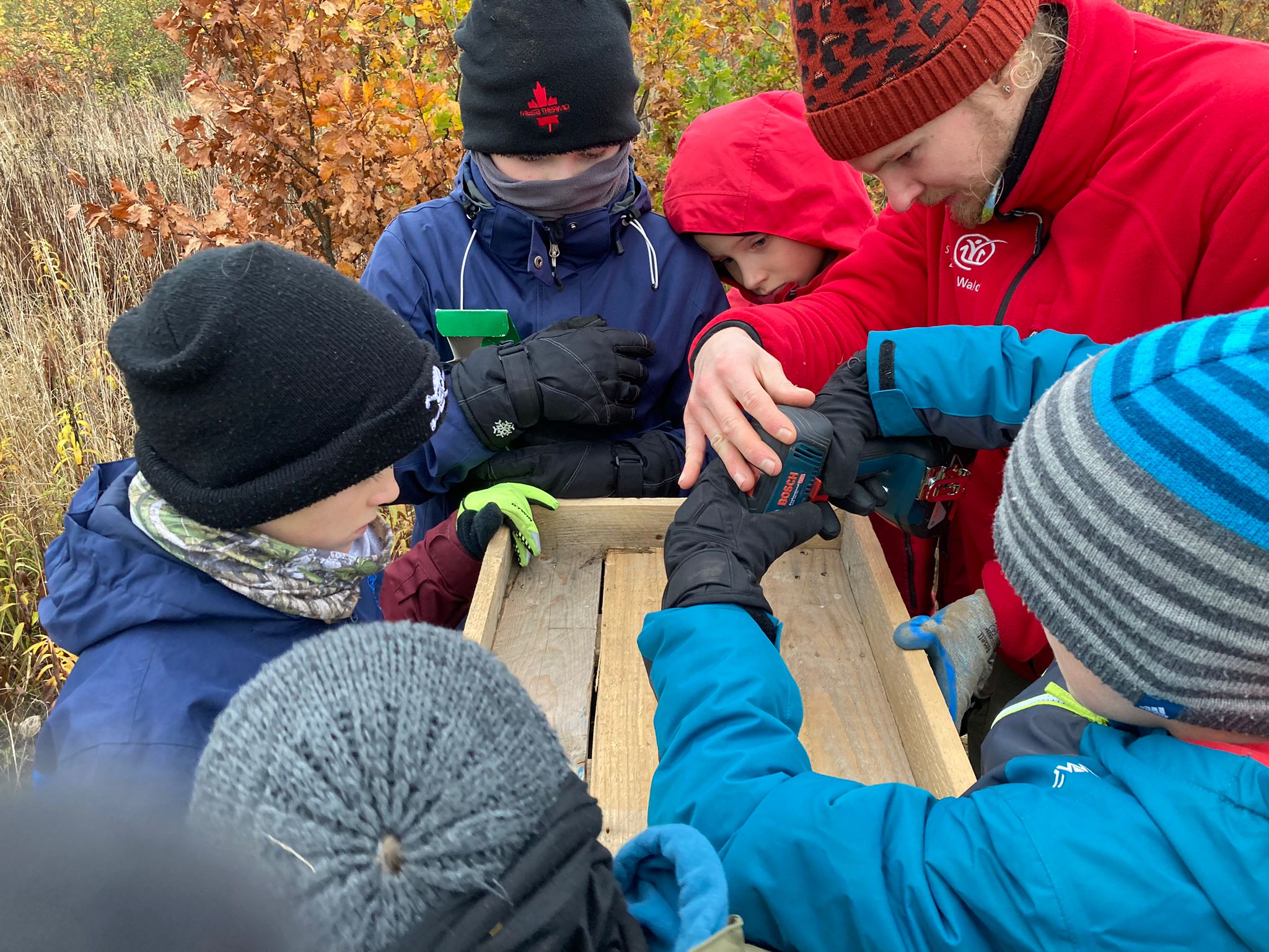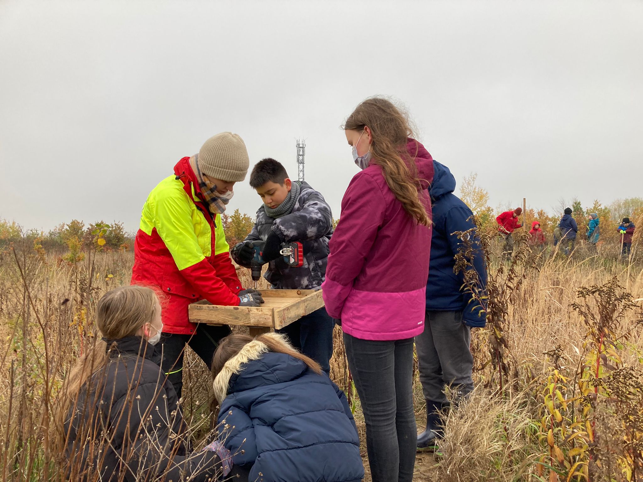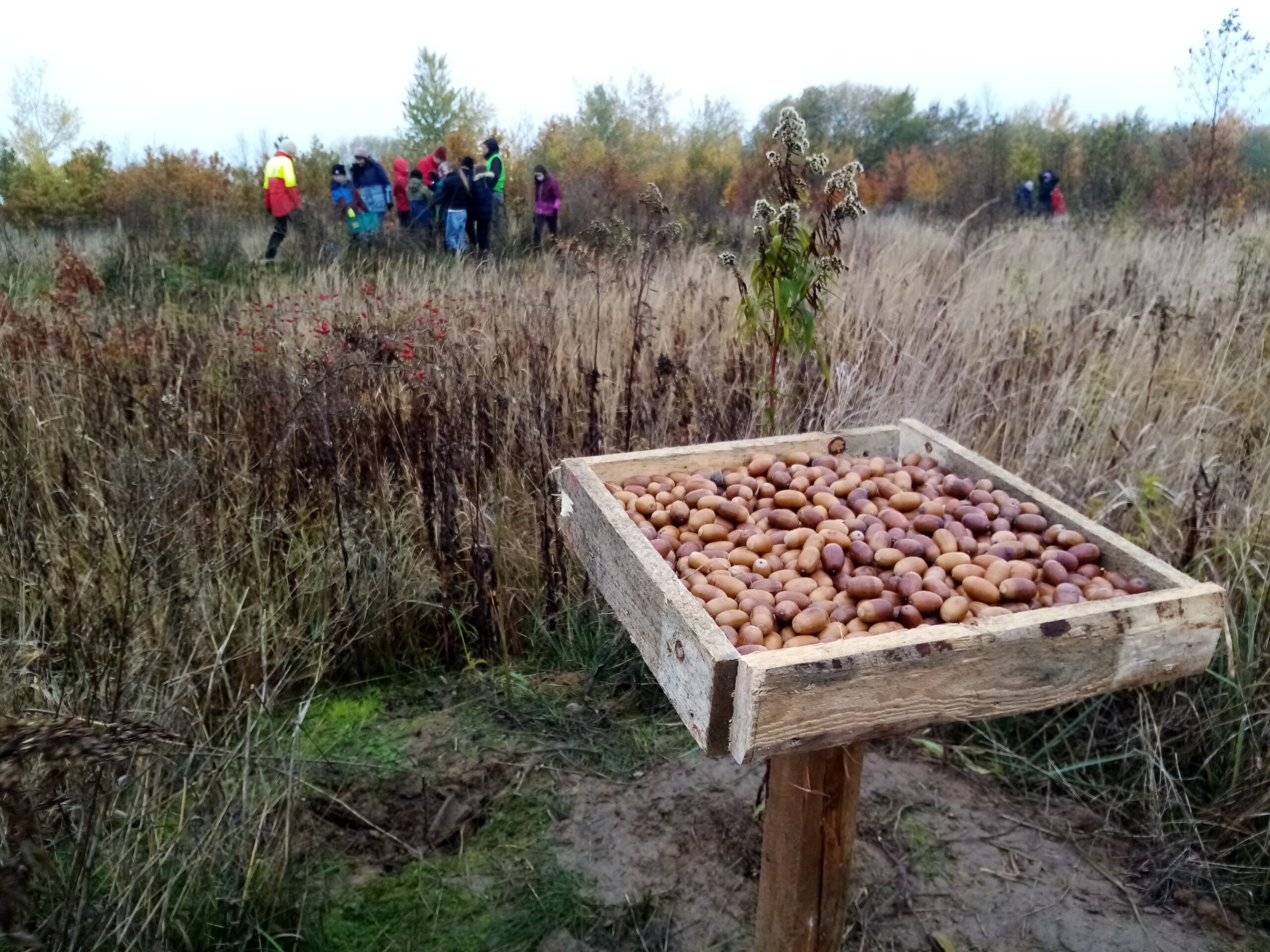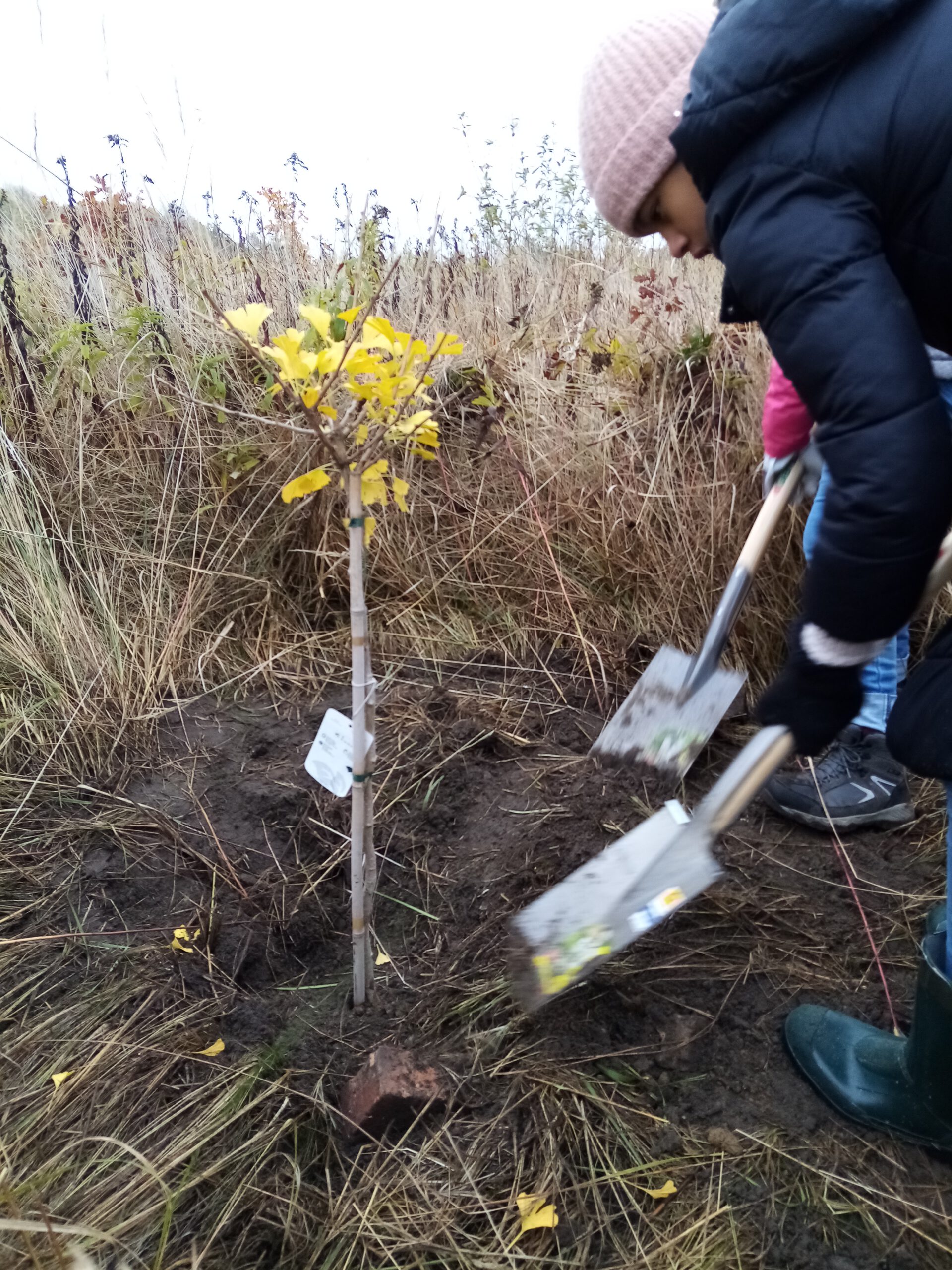 24. November 2022Nachdem Teil 1 der Aktion bereits am 19.11.2021 stattfand, konnte das Projekt der Klasse von Frau Sittler und Herrn Baptist (5.2 bzw. 6.2) am 18.11.2022 vollendet werden. Das Projekt zielt darauf ab die Eigenschaft des Eichelhähers Eicheln als Nahrungsvorräte zu verstecken (ähnlich wie ein Eichhörnchen) sich zu Nutze zu machen und die Ausbreitung der Eichen in unserem Schulwald in Hondelage zu unterstützen. Hierbei bekamen wir wieder viel Unterstützung von unserm Schulwald-Partner, der Stiftung Zukunft Wald. 2021 baute Paula Machunze mit den damals 5. Klässler:innen aus Palettenresten tatkräftig sogenannte „Häher-Tische“ zusammen. Diese Aktion fand am Regionalen UmweltbildungsZentrum Dowesee statt und wir man auf den Bildern erkennen kann, hat es allen riesigen Spaß gemacht. 2021 gab es aber kaum Eicheln in den Wäldern, sodass das Projekt zweitgeteilt werden musste. Diesen Herbst gab es hingegen ein regelrechtes „Eichelmastjahr“ und die mittlerweile 6. Klässler:innen sammelten über mehrere Wochen fleißig Eicheln in der Umgebung unserer Schule und ihren Wohnorten. Teil 2 der Aktion fand direkt im Schulwald Hondelage statt. Trotz der niedrigen Außentemperaturen von knapp 2 Grad Celsius stellten sich 18 mutige und willige Schüler:innen sich der Aufgabe die im Vorjahr zusammengebauten „Häher-Tische“ im Schulwald aufzustellen. Der Niederschlag blieb zum Glück am Vormittag aus. Vor Ort trafen wir wieder auf die Mitarbeiter:innen der Stiftung Zukunft Wald Johannes Wiese, Anneke Hoppe und Sonja Kopp, welche Holz und alles andere Notwendige dabei hatten und mit den Kindern in kleinen Arbeitsgruppen die fünf Eichelhähertische standfest aufbauten, die im Anschluss mit den zuvor gesammelten Eicheln befüllt wurden (siehe Bilder). Für einige Schüler:innen ohne passendes Schuhwerk standen Gummistiefel im Container vor Ort. Ein „Spezial-Team“ pflanzte gleichzeitig einen „Klassenbaum“ ein, einen Gingko, sowie im Anschluss noch einige Ligustersträucher und kleine Ahorne, die Herr Hettwer aus dem Schulgarten der IGS FF spendiert hatte. Alles in allem eine rundum gelungene Aktion und auch die Mitarbeiter:innen der Stiftung Zukunft Wald waren voll des Lobes.