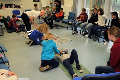 Im Erste-Hilfe-Kurs haben wir z.B. die stabile Seitenlage gelernt. Wir haben auch erfahren, was man beachten muss, wenn man einen Krankenwagen ruft. Man muss die 5 Ws beantworten (Wer ruft an? Was ist passiert? Wie viele Verletzte? Wo ist es passiert? Warten auf Rückfragen) und darf nicht auflegen. Die Person von der Notrufzentrale beendet das Gespräch.