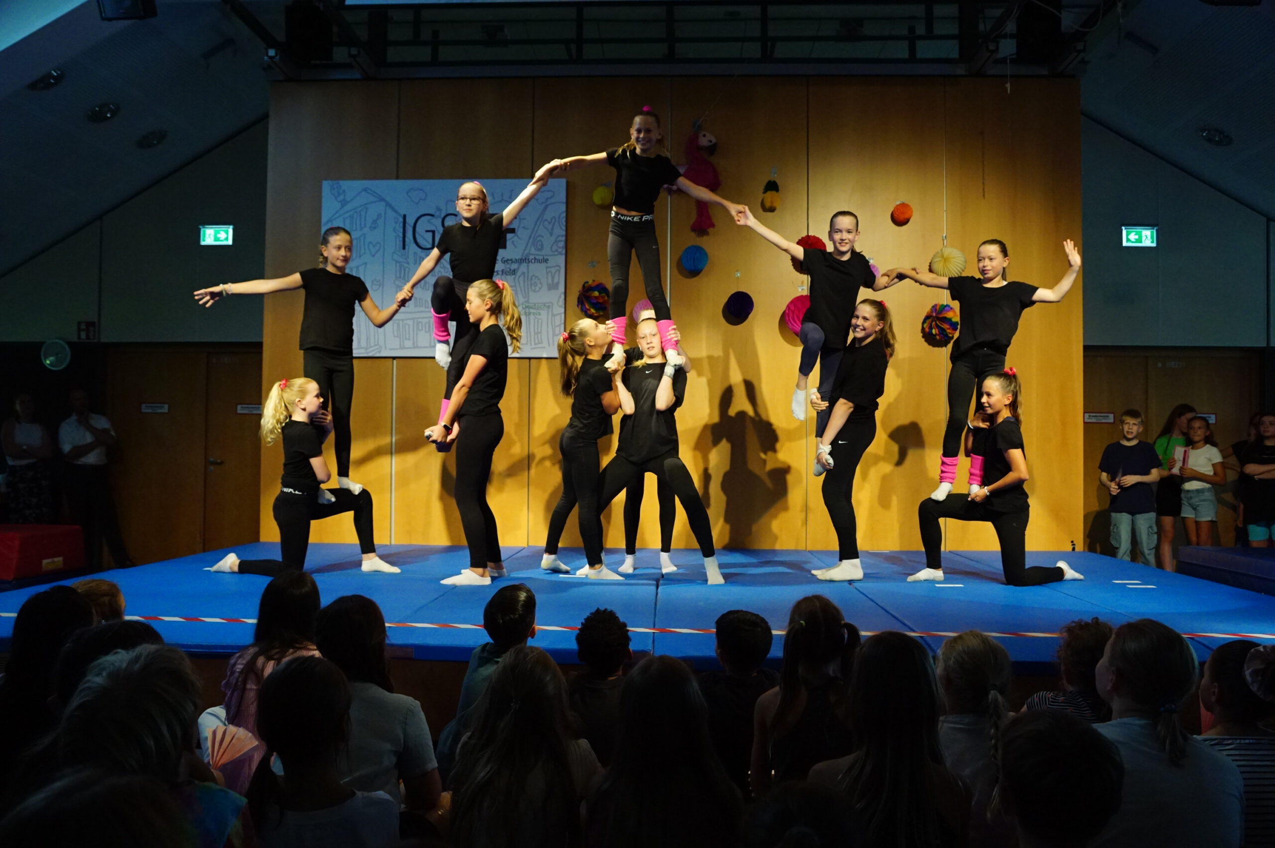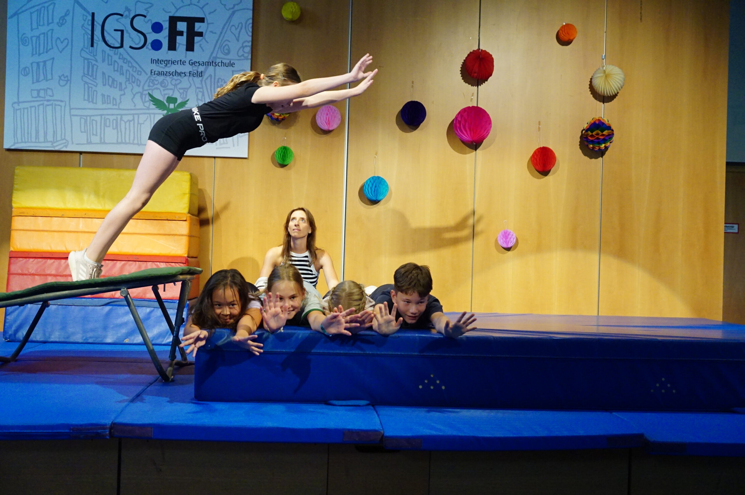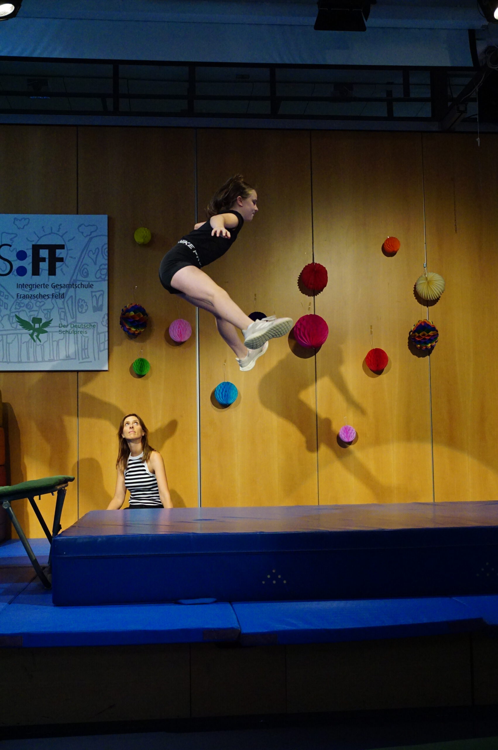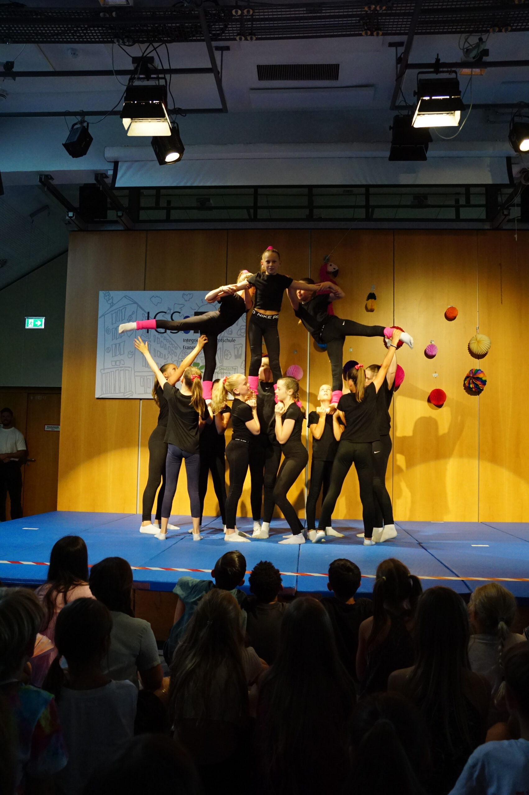 Die Darbietungen wurden durch aufregende Trampolinvorführungen ergänzt, die dem Publikum den Atem raubten. Ein besonderes Highlight war Fiete, der mit seinem Diabolo beeindruckte und trotz aller Aufregung die Nerven behielt. Eine Cheerleading-Einlage zu fetziger Musik rundete das bunte Programm ab und brachte die Stimmung zum Kochen. Nicht zu vergessen ist auch das „Flamingolied“, das sofort für gute Laune sorgte.