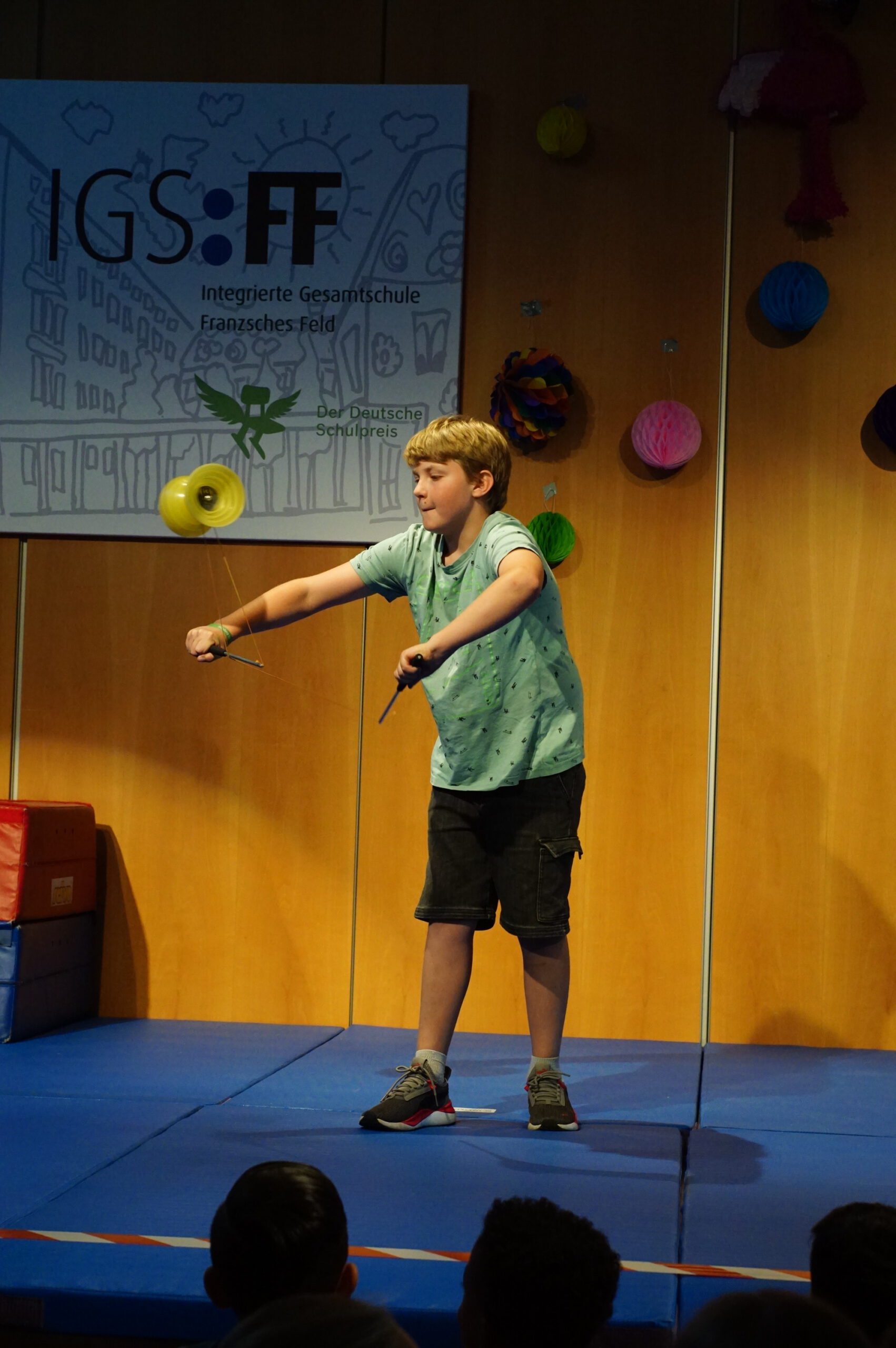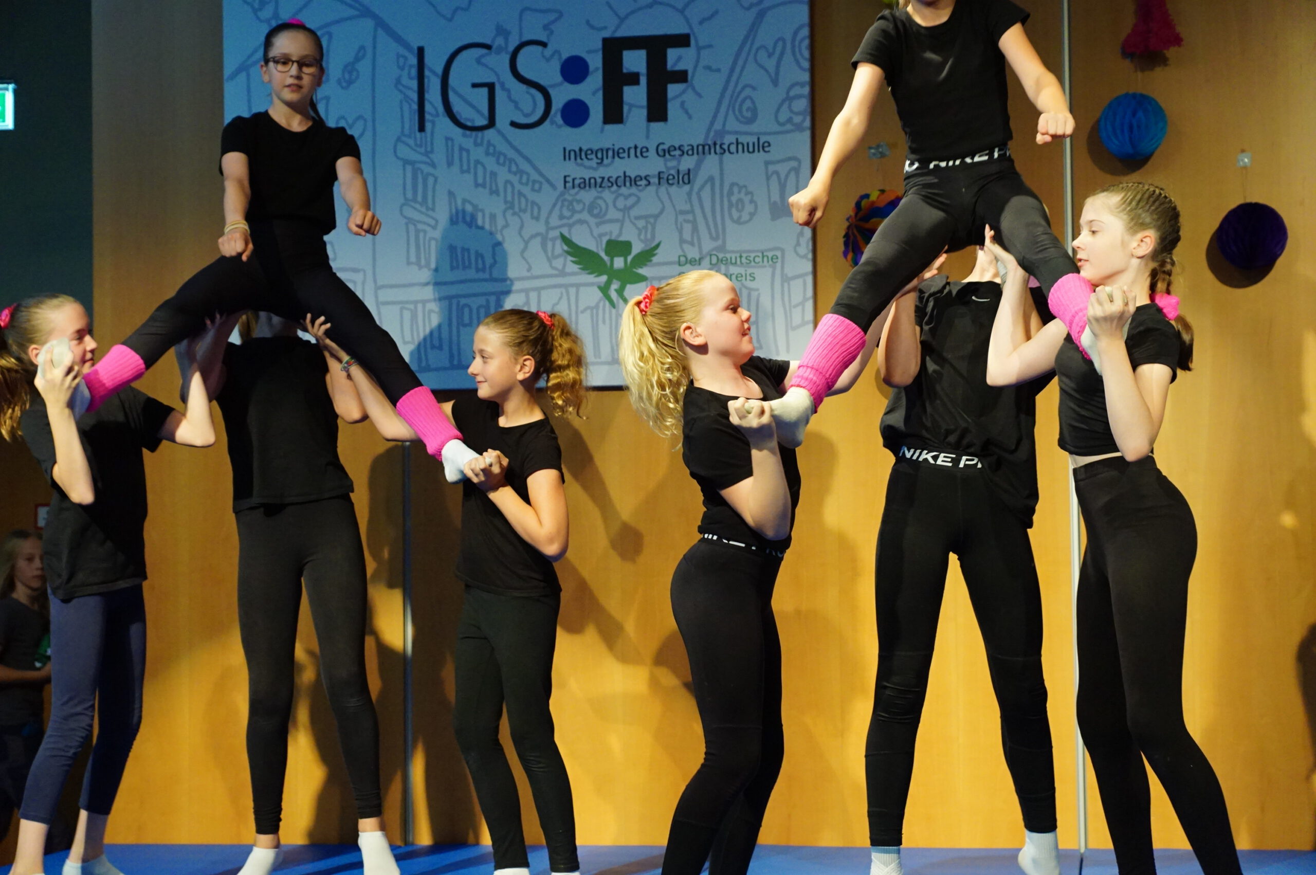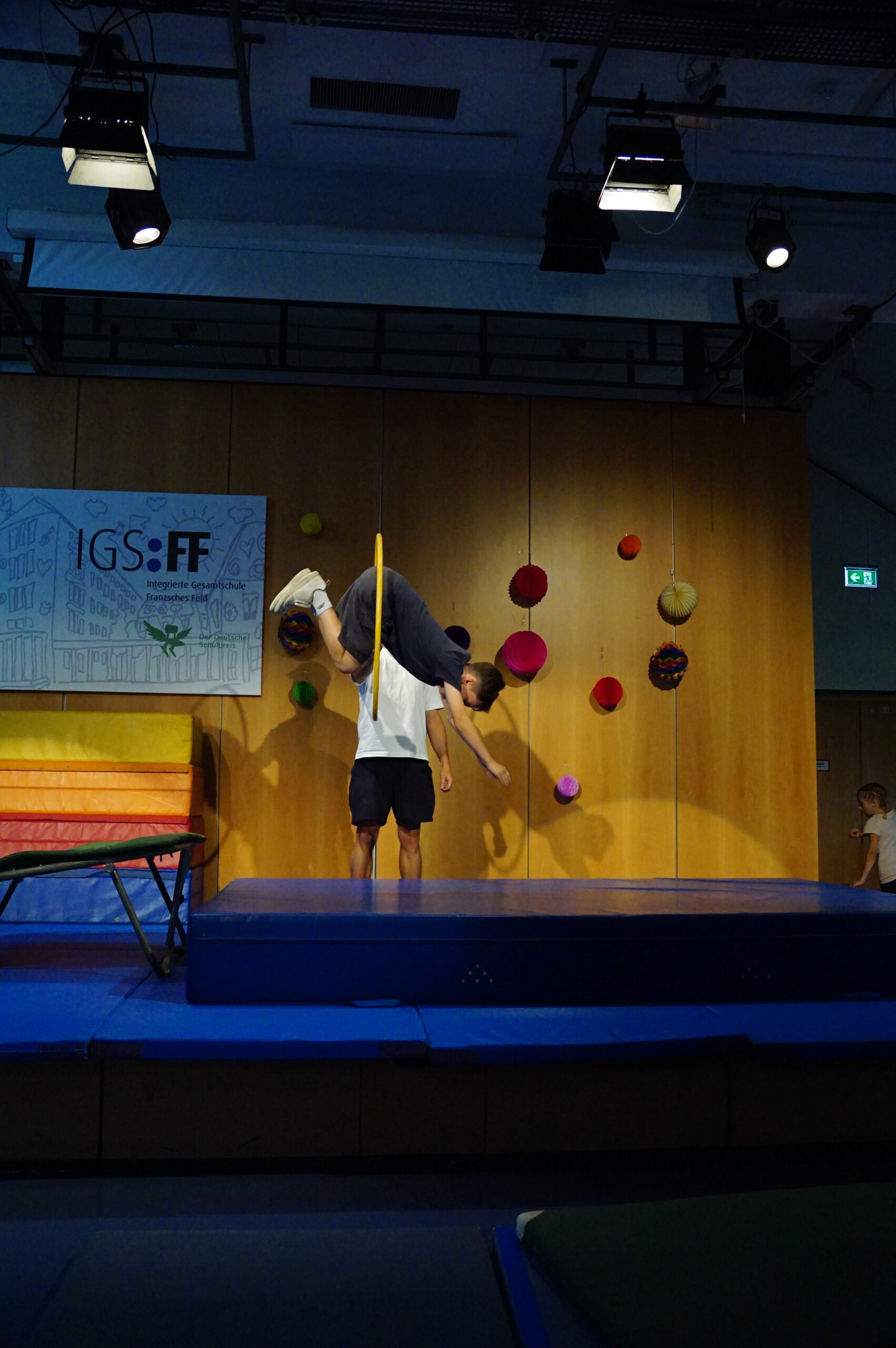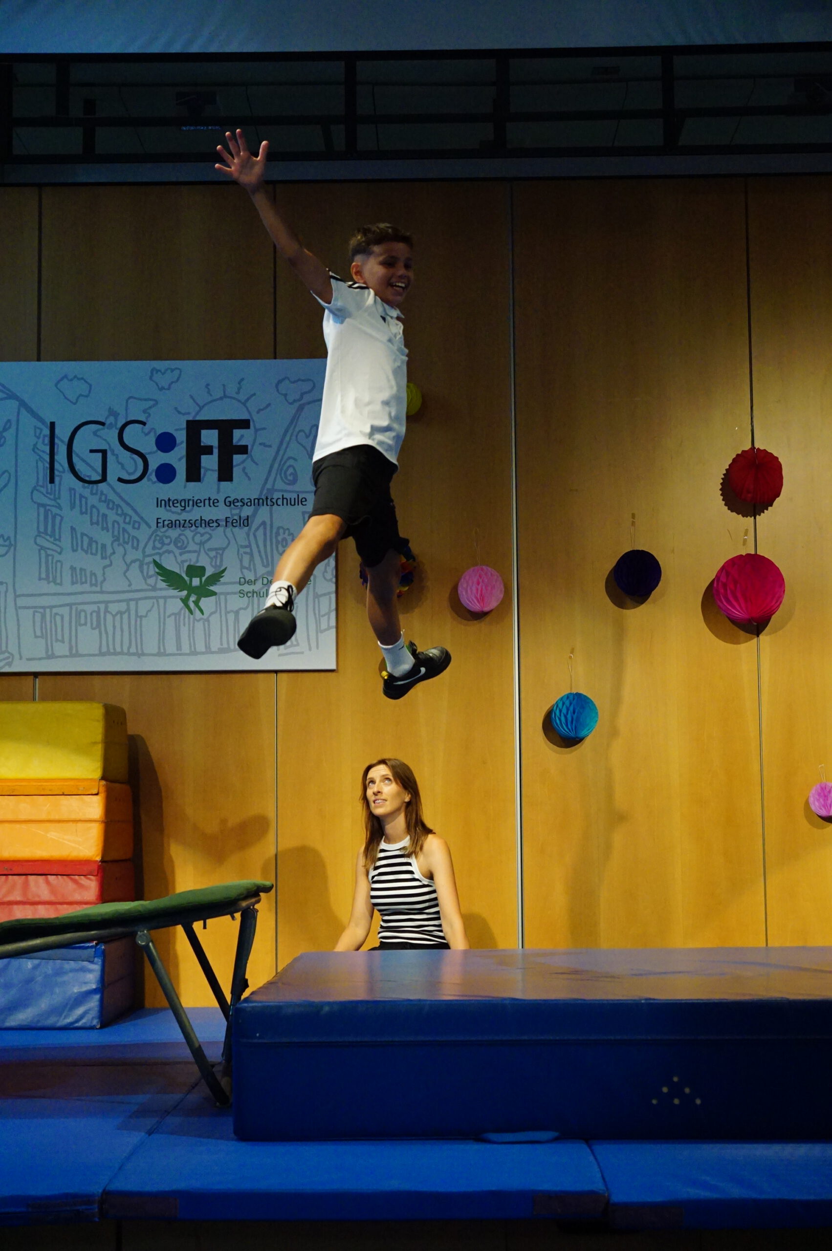 Die Darbietungen wurden durch aufregende Trampolinvorführungen ergänzt, die dem Publikum den Atem raubten. Ein besonderes Highlight war Fiete, der mit seinem Diabolo beeindruckte und trotz aller Aufregung die Nerven behielt. Eine Cheerleading-Einlage zu fetziger Musik rundete das bunte Programm ab und brachte die Stimmung zum Kochen. Nicht zu vergessen ist auch das „Flamingolied“, das sofort für gute Laune sorgte.