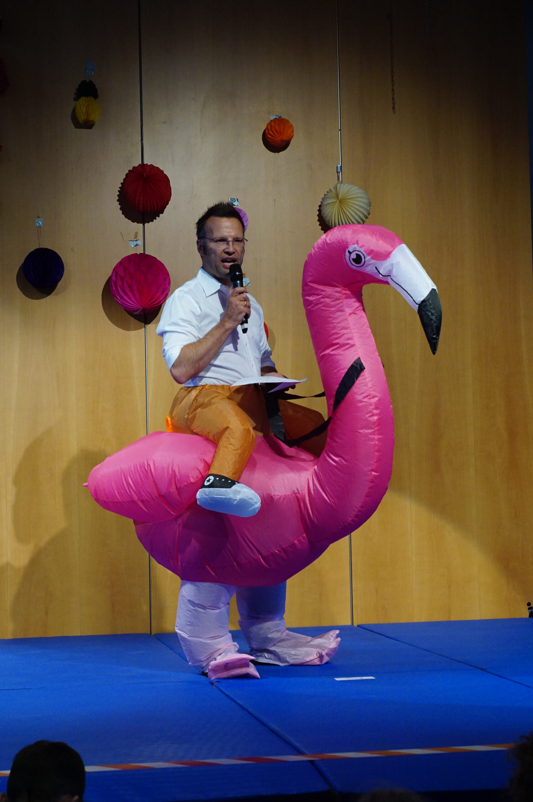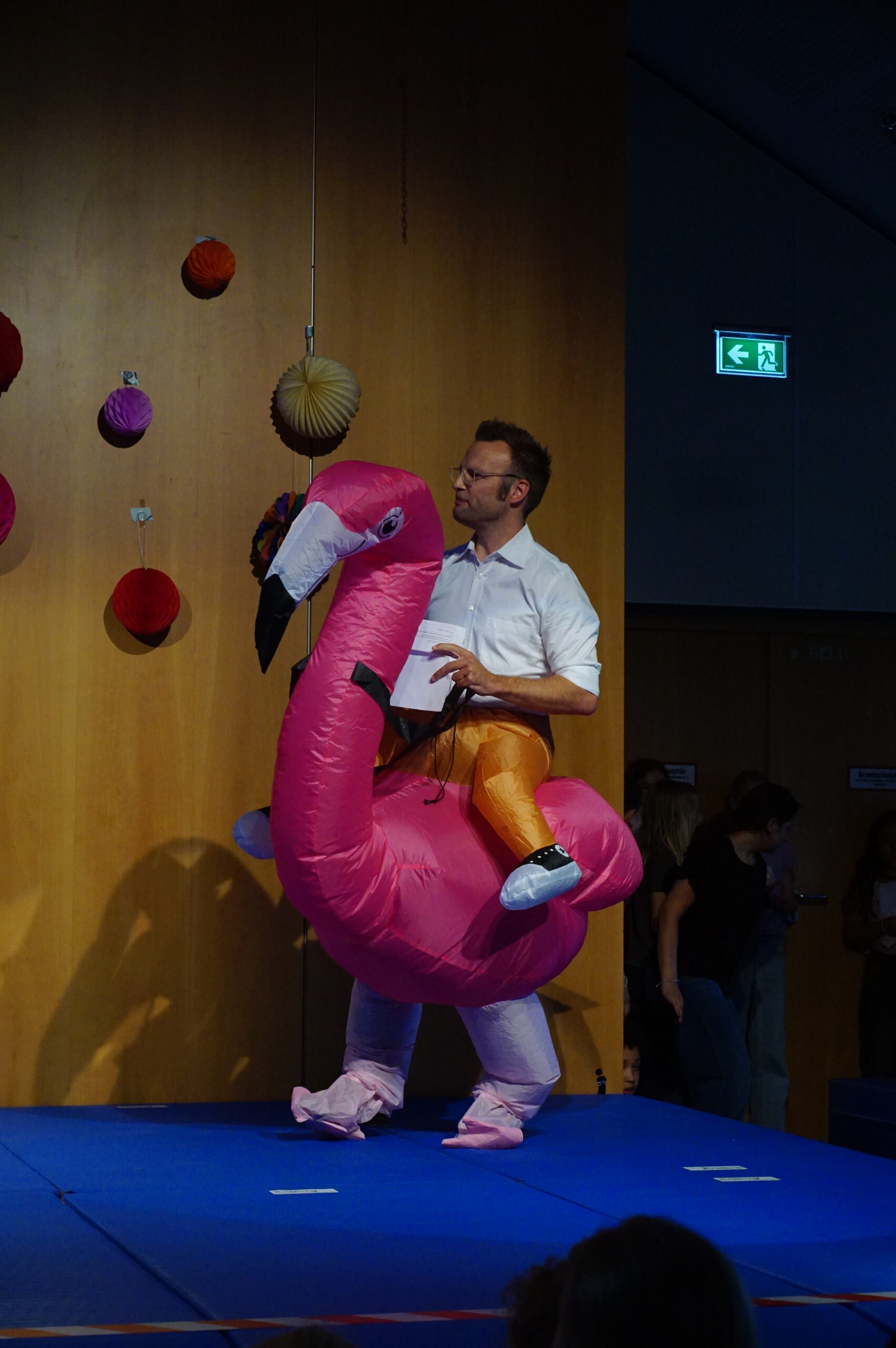 Ein weiterer Höhepunkt des Nachmittags war die offizielle Begrüßung durch unseren Schulleiter Benjamin Sauerland, der als Flamingoreiter verkleidet war und damit für Staunen und Schmunzeln bei Groß und Klein sorgte. Herr Eckelt, der Jahrgangsleiter, begrüßte die neuen Schülerinnen und Schüler ebenfalls herzlich und stellte fest, dass die Kinder schon ganz viel über das Thema „Flamingo“ wissen.