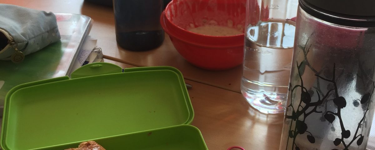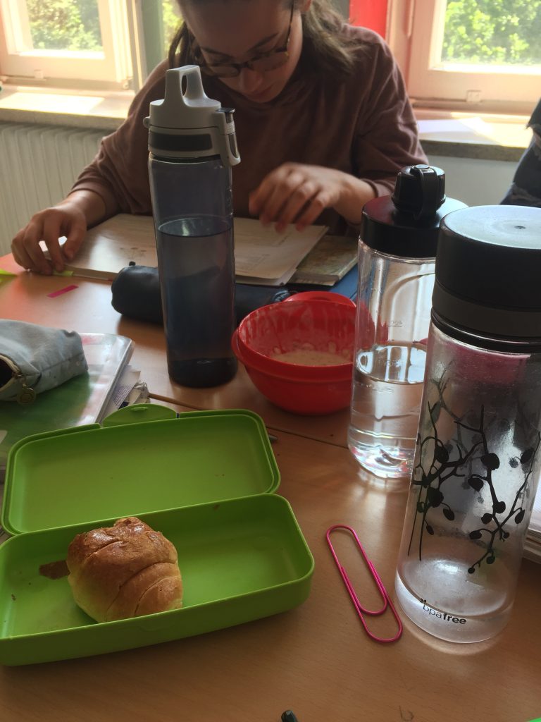 Unnötige Verpackungen wie Butterbrotpapier, Alu- und Plastikfolie wurden heute weggelassen- eine gute, alte Brotbox reicht! Andere wurden bei ihrer Verpflegung an sich kreativ: Smoothies und Joghurt in wiederverwendbaren Plastikbehältern standen heute auf dem Programm. Getrunken wurde natürlich aus Glas- und harten Wasserflaschen.