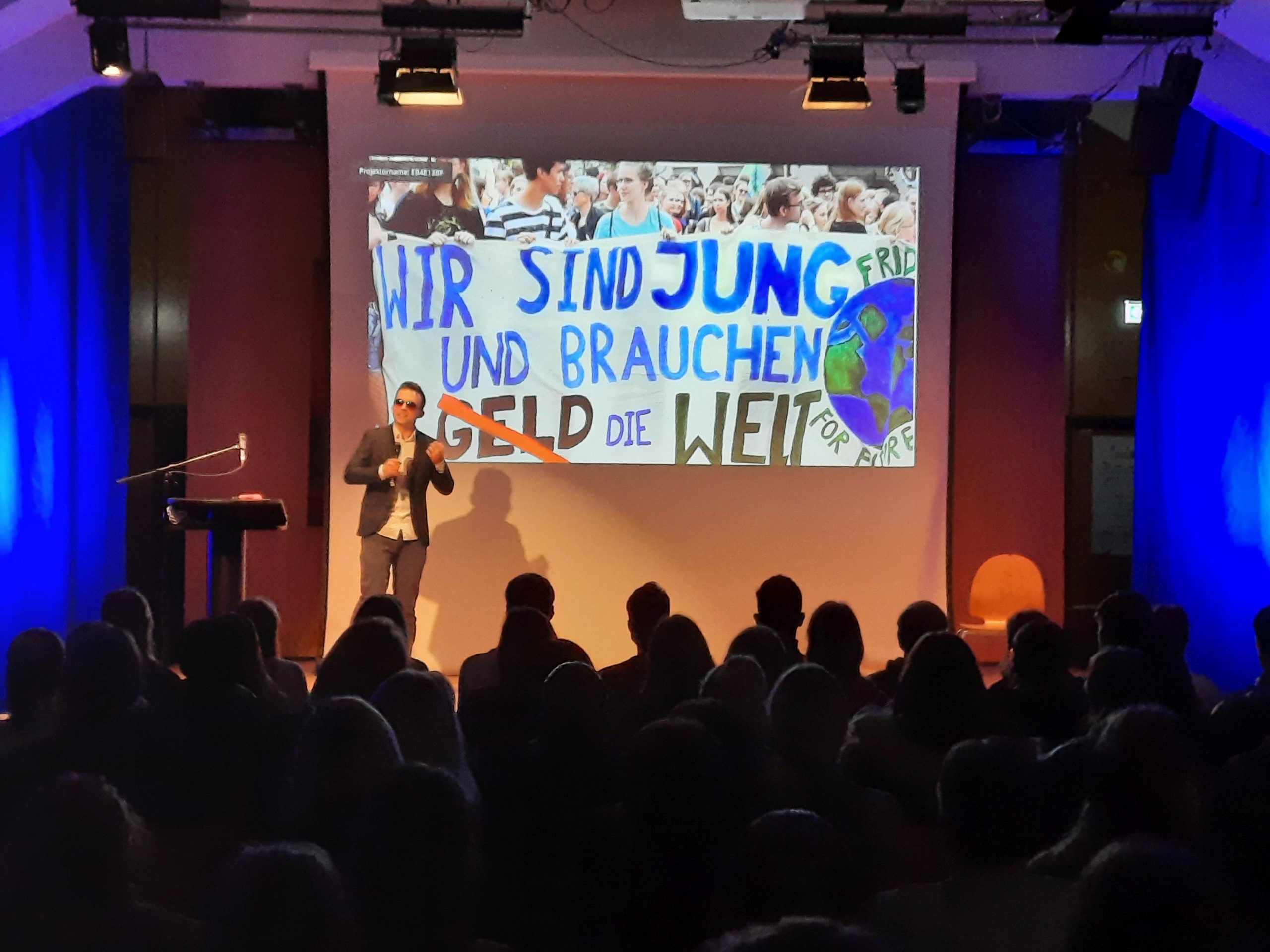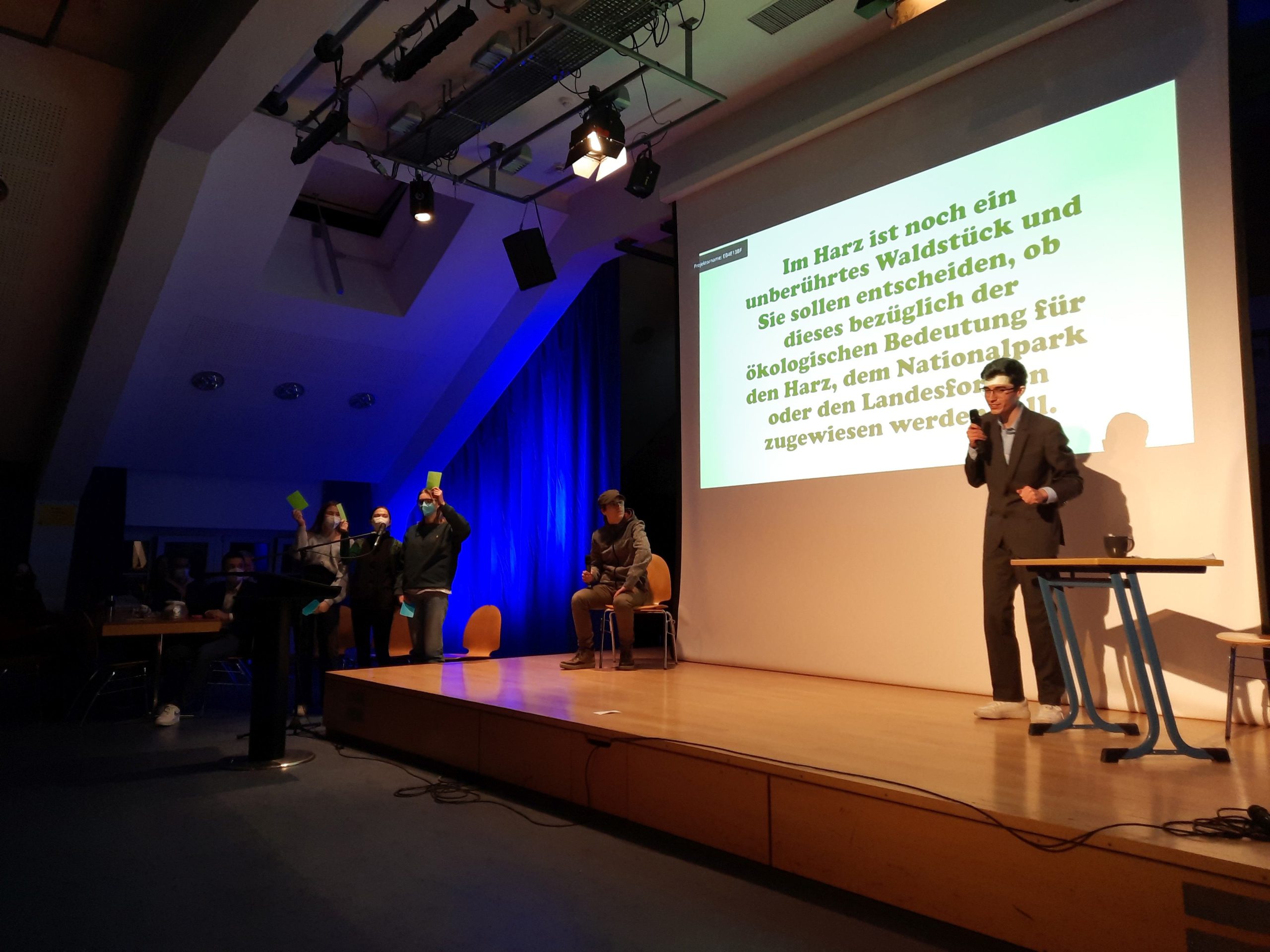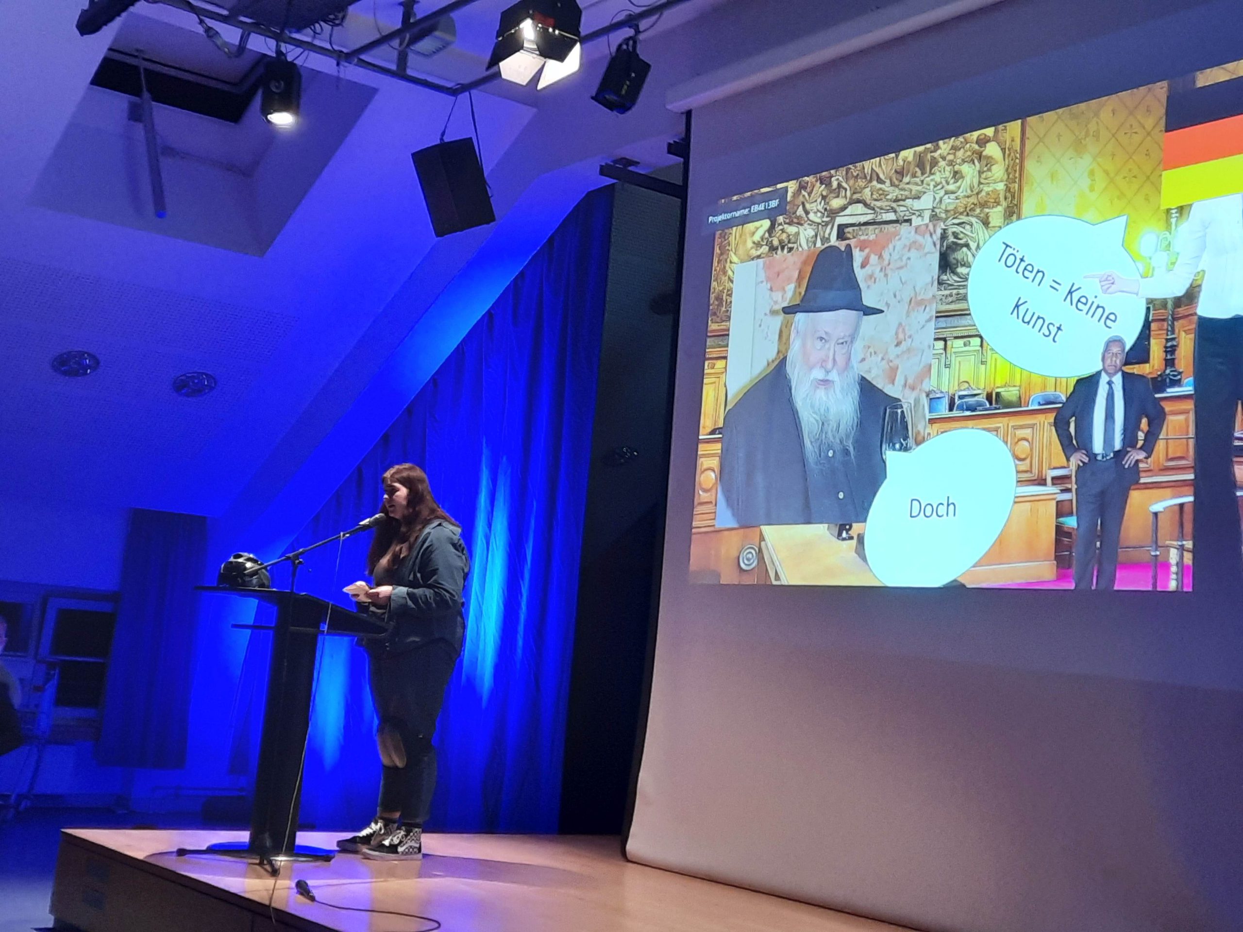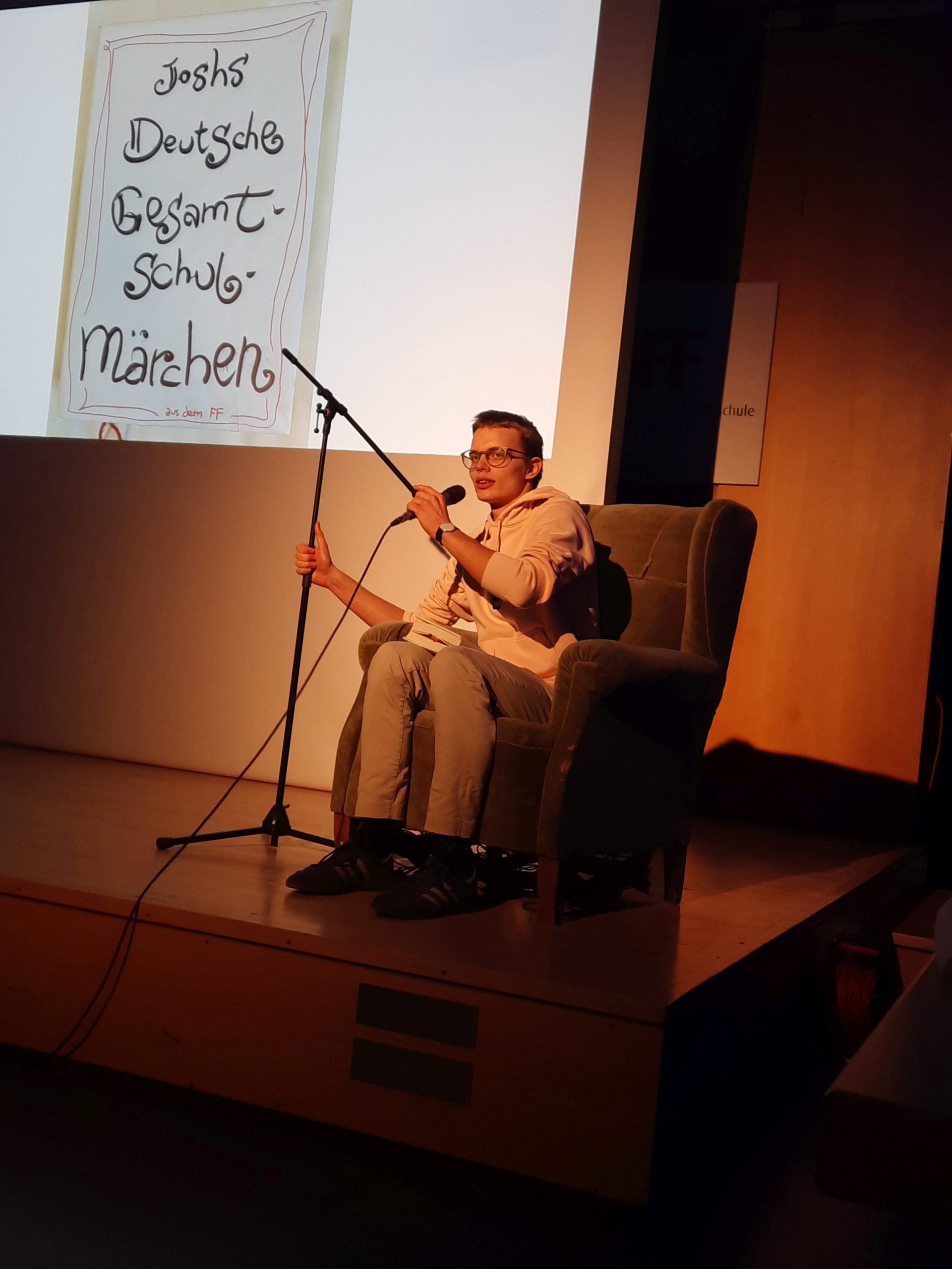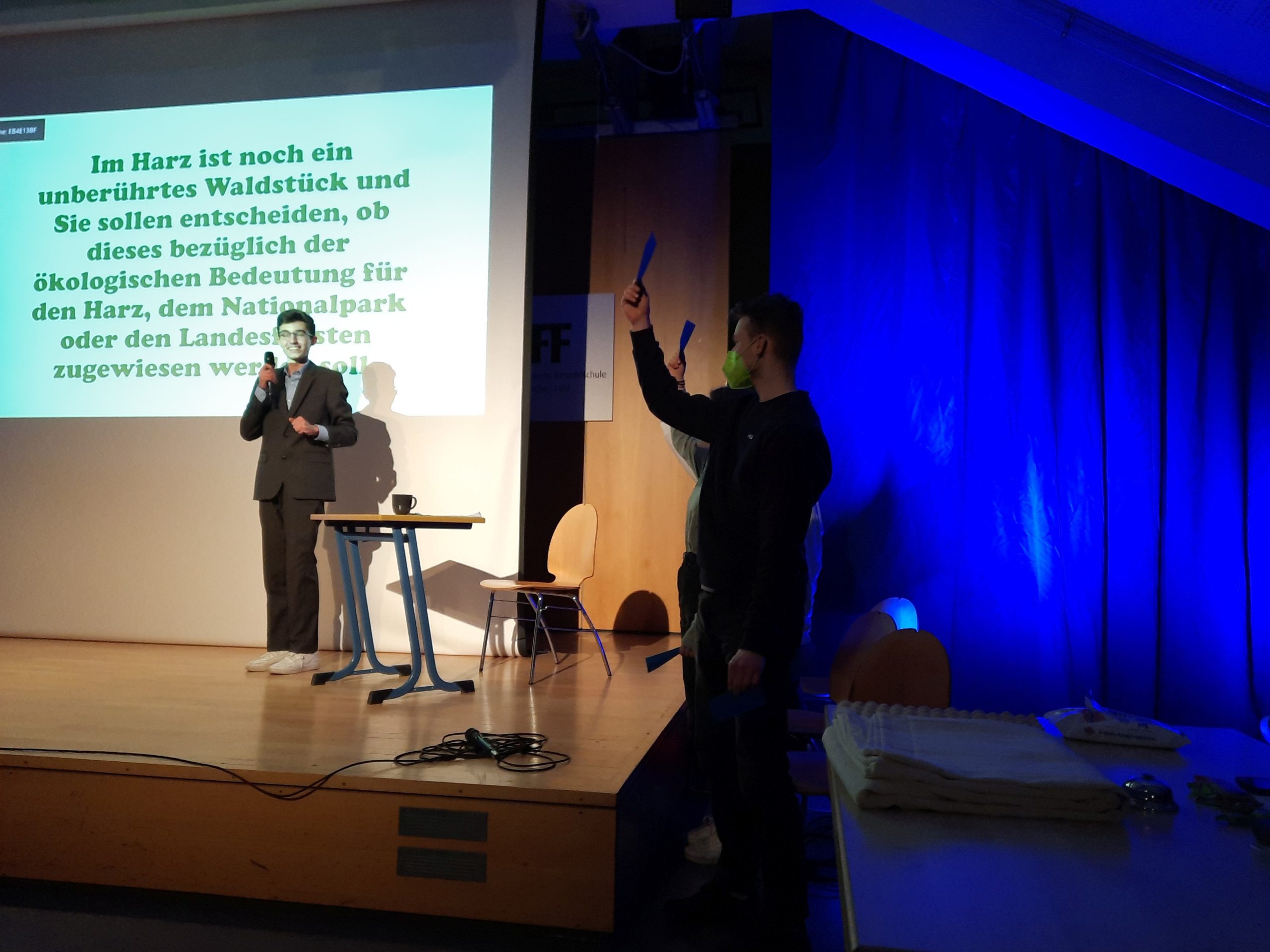 Los ging es mit einer Einführung in die Wertanlagestrategien. Jakob präsentierte dem Publikum Geheimnisse, die zum finanziellen Erfolg führen- allerdings auch mit dem Verweis darauf, dass eben Erfolgsstreben auch erhebliche Nachteile haben kann. Daraufhin stellte Adea dar, welche Gründe es für die Kinderarbeit im 19. Jahrhundert gegeben hat und weshalb auch wir heute nicht unbeteiligt daran sind, dass es noch Kinderarbeit z.B. in der Handyproduktion gibt. Wie man mit der Borkenkäfer- Plage im Harz umzugehen hat, stellten die diesjährigen Sieger des Facharbeitsslams Valton und Tom vor. Sie diskutierten in unterhaltsamer Weise, ob man den Käfer nun aktiv bekämpfen müsse oder ob man der Natur freien Lauf lassen solle. Gespickt waren die Informationen mit wissenschaftlichen Hintergrundinformationen. Zum „Scheitern im Leben“ und den Zusammenhängen in der gesellschaftlichen und medialen Inszenierung bekamen die ZuschauerInnen von Ella tiefere Einblicke. Ganz auf Englisch präsentierte dann Emma 10 min. lang ihre Erkenntnisse aus der Facharbeit. Man lernte viel über die Gender Roles im 19. Jahrhundert. Mathematisch anschaulich ging es dann weiter, als Josh dem Publikum näherbrachte, was im mathematischen Sinne „Matrizen“ darstellen. Dies erfolgte in Form eines Märchens, das zum Schmunzeln herausforderte. Am Ende schloss dann Lilli mit Ihrem eindrucksvollem Slam ab und stellte das Dilemma zwischen Kunstfreiheit und Ethik im Zusammenhang mit dem Künstler Hermann Nitsch vor.