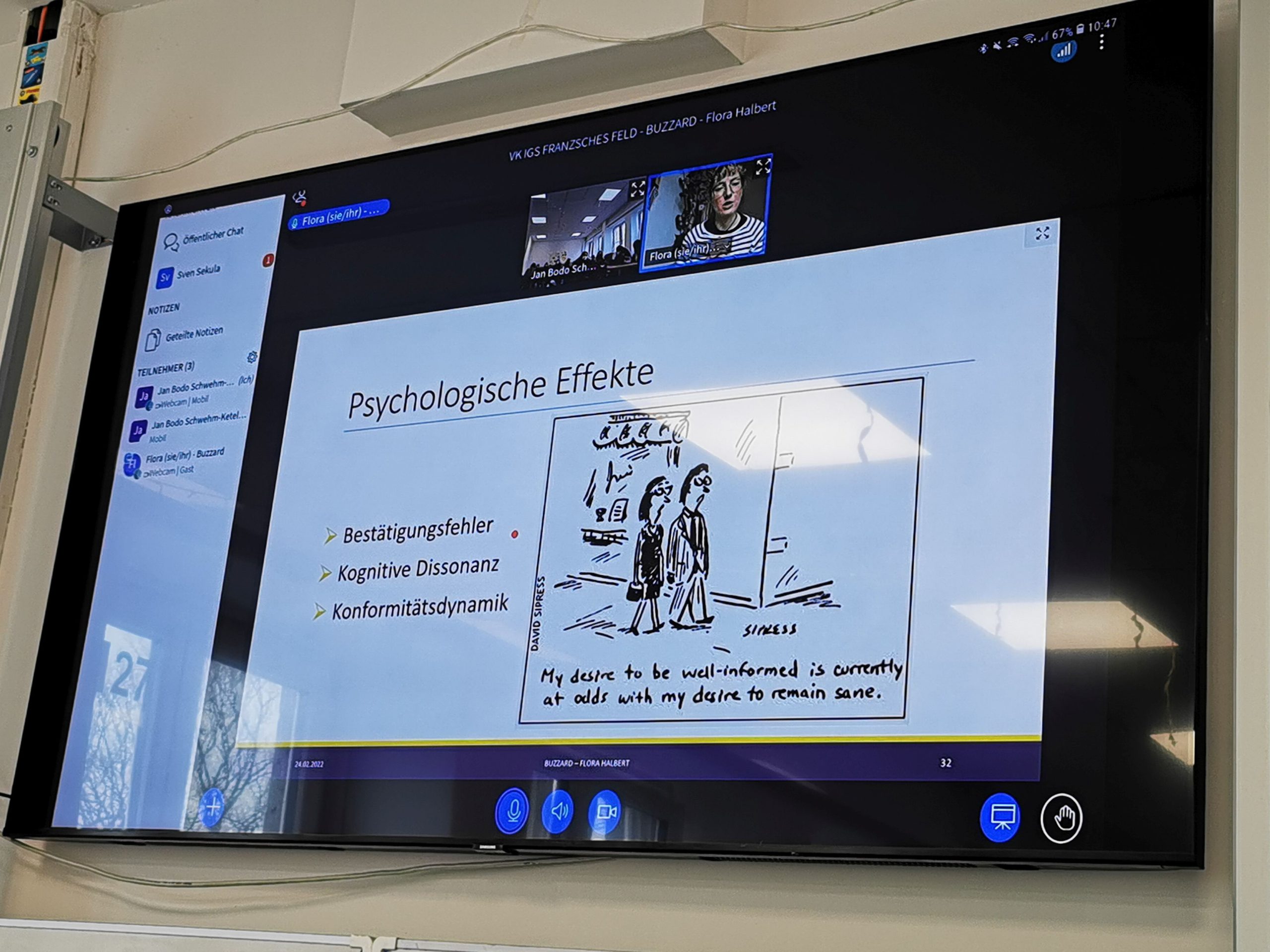 Am Nachmittag hatten unsere Schüler:innen die Gelegenheit beim Buzzard-Gründer Dario Nassal in einem online-Interview kritische Fragen zu stellen und sich weiter über die Ideen und Ziele der Jungunternehmer aus Berlin zu informieren. Das große Thema Medienethik ist einer der Schwerpunkte im Fach Deutsch in der Qualifikationsphase und im Schulcurriculum fest verankert.