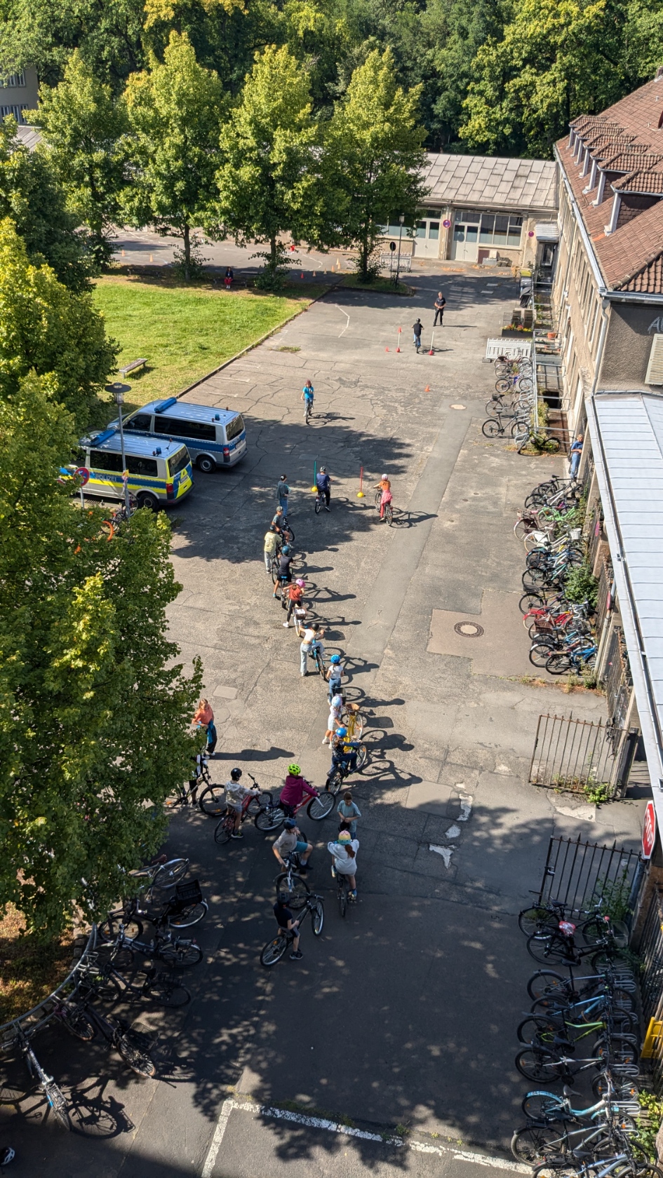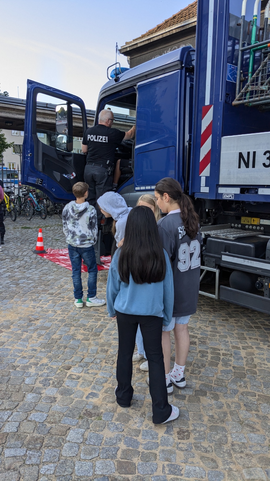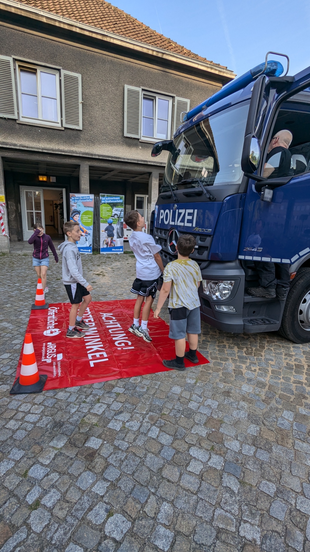 In einzelnen Stationen beschäftigten sich die Kinder der 5. Klassen mit zahlreichen Aspekten der Verkehrserziehung. Ein kleiner 1. Hilfe-Kurs ließ die Kinder kleinere Wunden versorgen. An einer anderen Stelle auf dem Schulhof ging es um die Sicherheit am Fahrrad. Dort wurden die Räder technisch auf Herz und Nieren untersucht. In einem Geschicklichkeits-Parcours, den sich unsere Praktikant:innen der Sozialpädagogik ausgedacht hatten, zeigten die Kinder ihre Fahrkünste. Wie lange ein Bremsweg und wie gefährlich der tote Winkel bei Lastkraftwagen ist, konnten die Kinder beim Präventionsteam der Polizei Braunschweig kennenlernen. Da staunten sie nicht schlecht! Eltern und die Jugendlichen der Mofa-AG checkten die Fahrräder technisch und auf Verkehrssicherheit. Vielen Dank an alle Helfer:innen, die die Aktion unterstützt haben. Ohne den LKW der Bereitschaftspolizei, unsere Sanitäter des ASB, der Verkehrswacht Braunschweig wäre Vieles nicht möglich gewesen und auch unsere engagierten Eltern trugen zu einem gelungenen Vormittag bei.