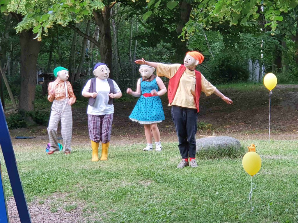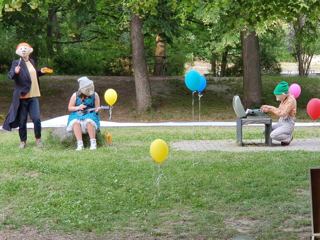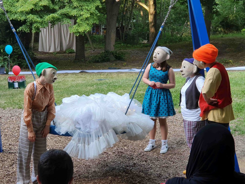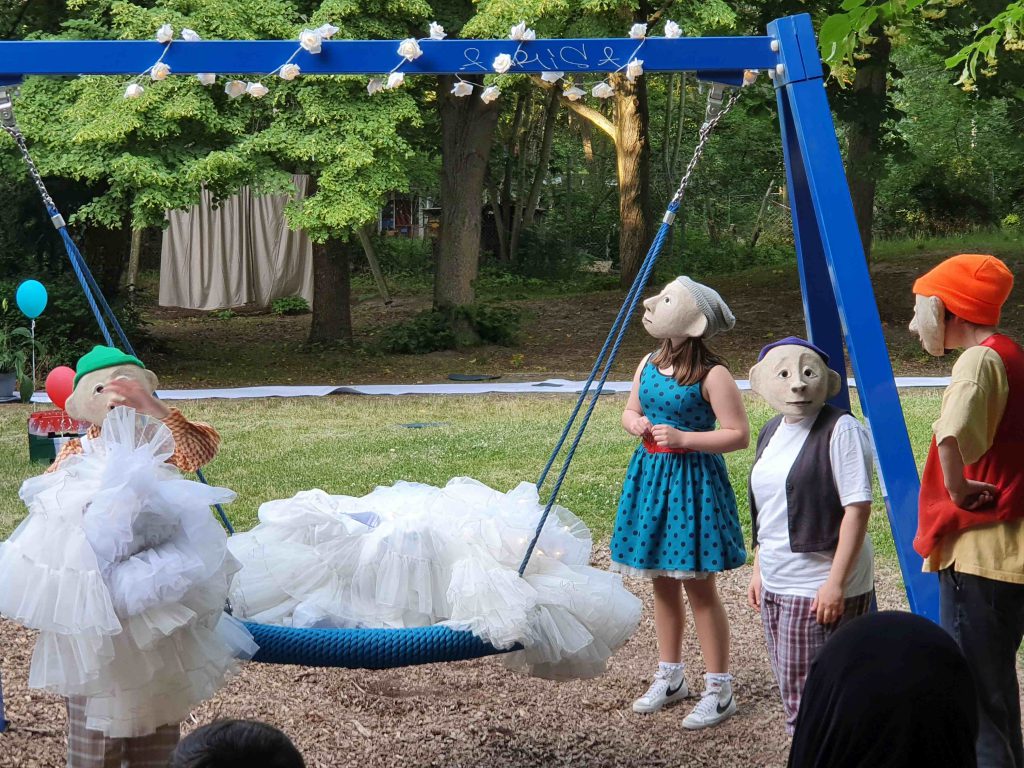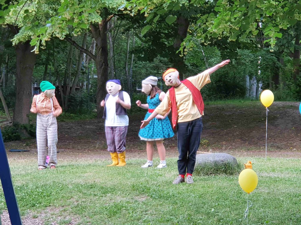 12. Juli 2021Vor sieben Wochen haben vier Schülerinnen unter den noch sehr eingeschränkten Umständen (unter Einhaltung der Hygieneregeln) der Corona Pandemie begonnen, das theatrale Maskenspiel in ihrer Freizeit zu erproben. Daraus ergab sich eine Stückentwicklung, die unter diesen sehr speziellen Umständen entwickelt wurde und abschließend am Sonntag 27. Juni 2021 zu einer kleinen Aufführung auf dem Schulhof kam. Die Schülerinnen haben in kleinem Rahmen dieses Maskenspiel liebevoll präsentiert und sehr viel professionellen Umgang, als auch Fantasie bewiesen.