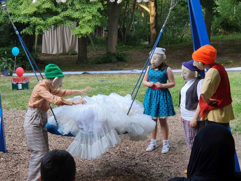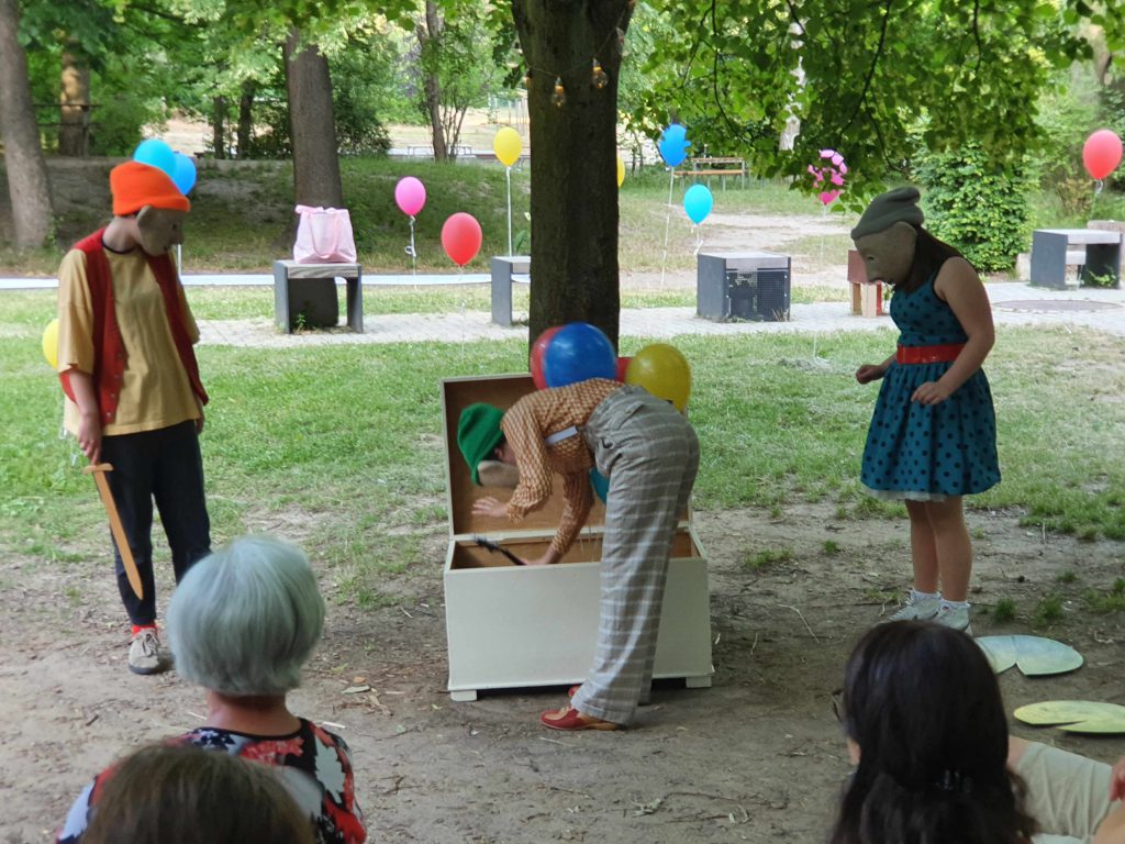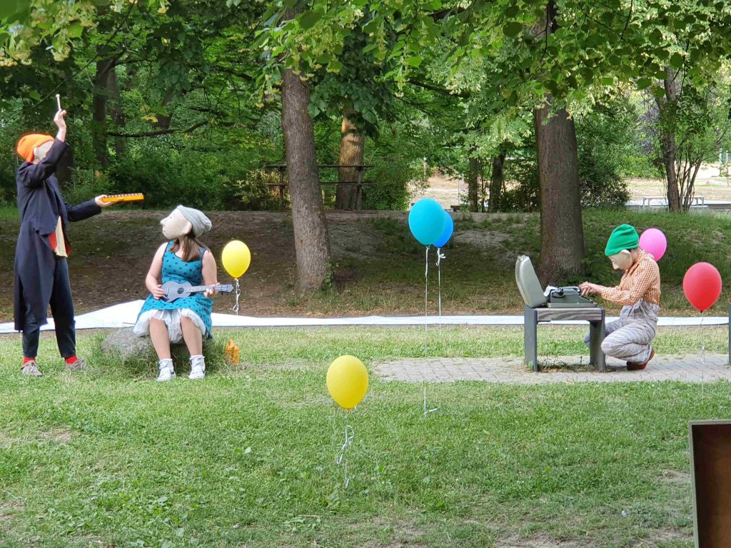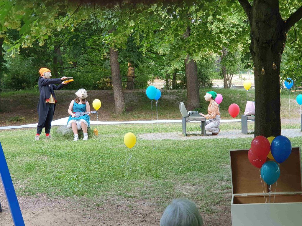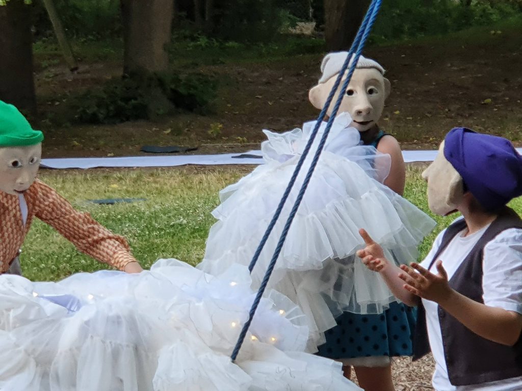 12. Juli 2021Vor sieben Wochen haben vier Schülerinnen unter den noch sehr eingeschränkten Umständen (unter Einhaltung der Hygieneregeln) der Corona Pandemie begonnen, das theatrale Maskenspiel in ihrer Freizeit zu erproben. Daraus ergab sich eine Stückentwicklung, die unter diesen sehr speziellen Umständen entwickelt wurde und abschließend am Sonntag 27. Juni 2021 zu einer kleinen Aufführung auf dem Schulhof kam. Die Schülerinnen haben in kleinem Rahmen dieses Maskenspiel liebevoll präsentiert und sehr viel professionellen Umgang, als auch Fantasie bewiesen.