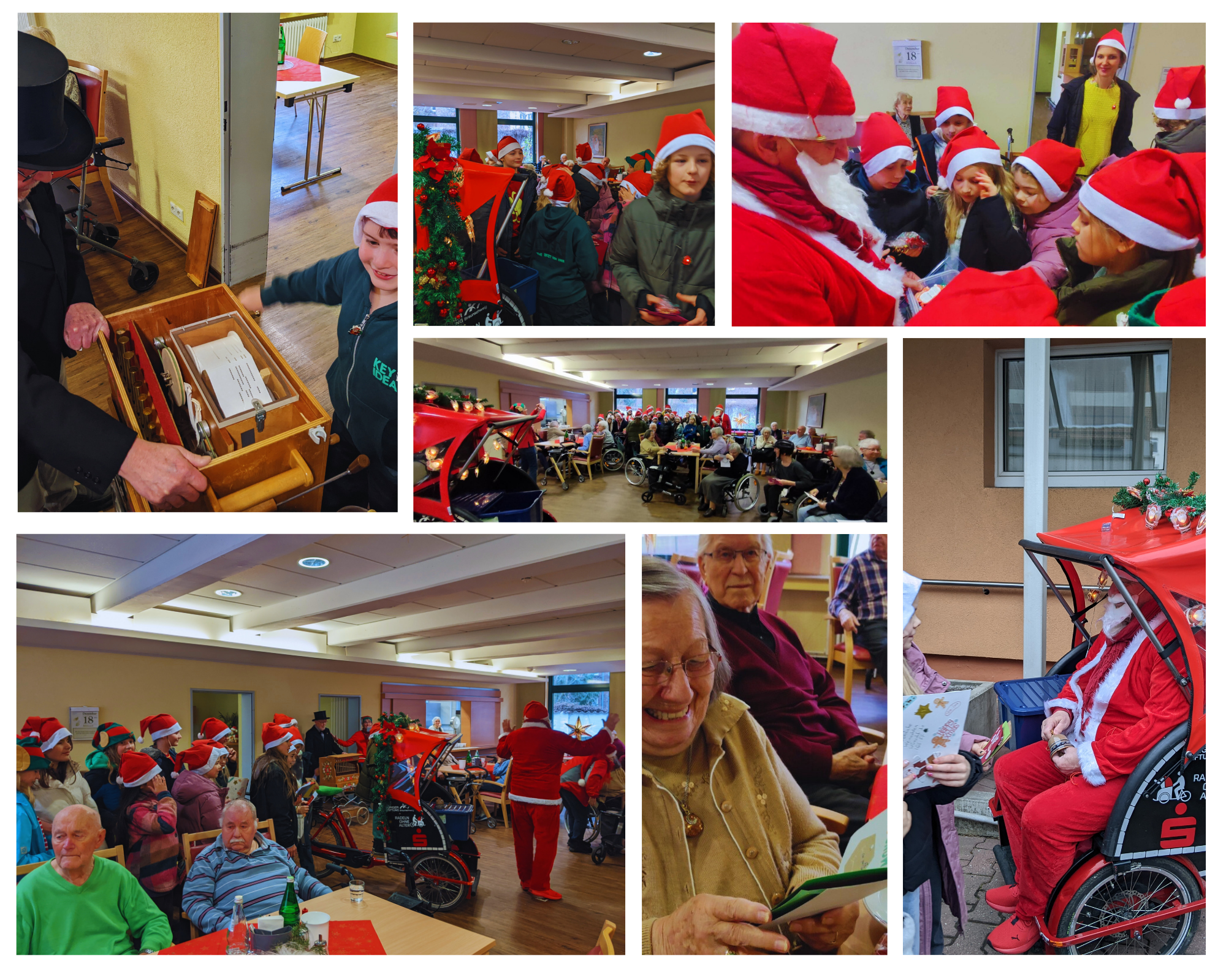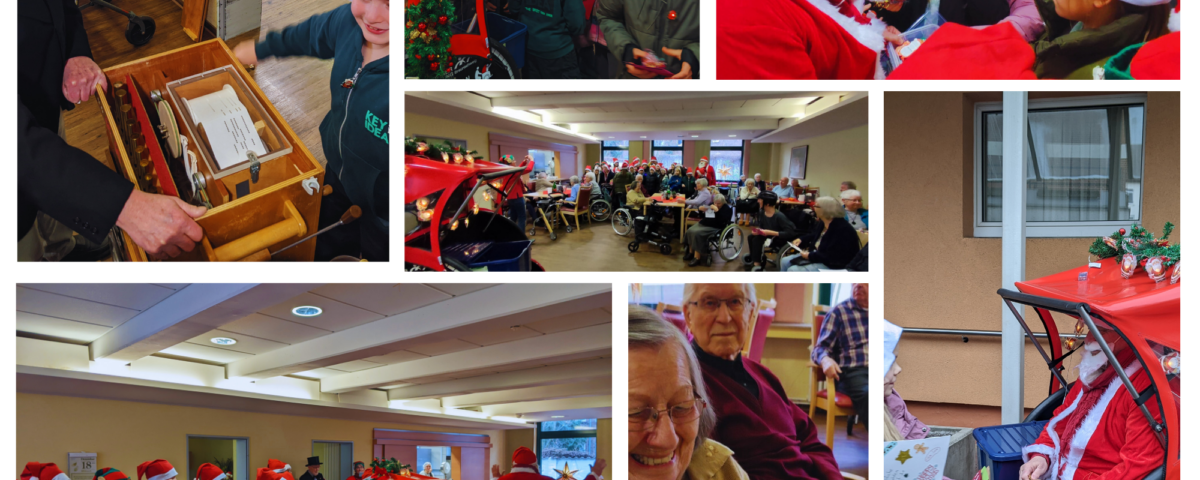 Im vollen Speisesaal warten rund 80 Senior:innen auf ihr Mittagessen. Doch dann kommt Überraschungsbesuch: der Weihnachtsmann wird mit einer Rikscha der Bürgerstiftung Braunschweig direkt in den Saal gefahren, gefolgt von den Schüler:innen der Klasse 5.1 der IGS:FF, in den Händen selbstgebastelte Weihnachtskarten und kleine süße Überraschungen. Untermalt wird die Szene von Dietmar Niedzwezky, der seine Drehorgel spielt.