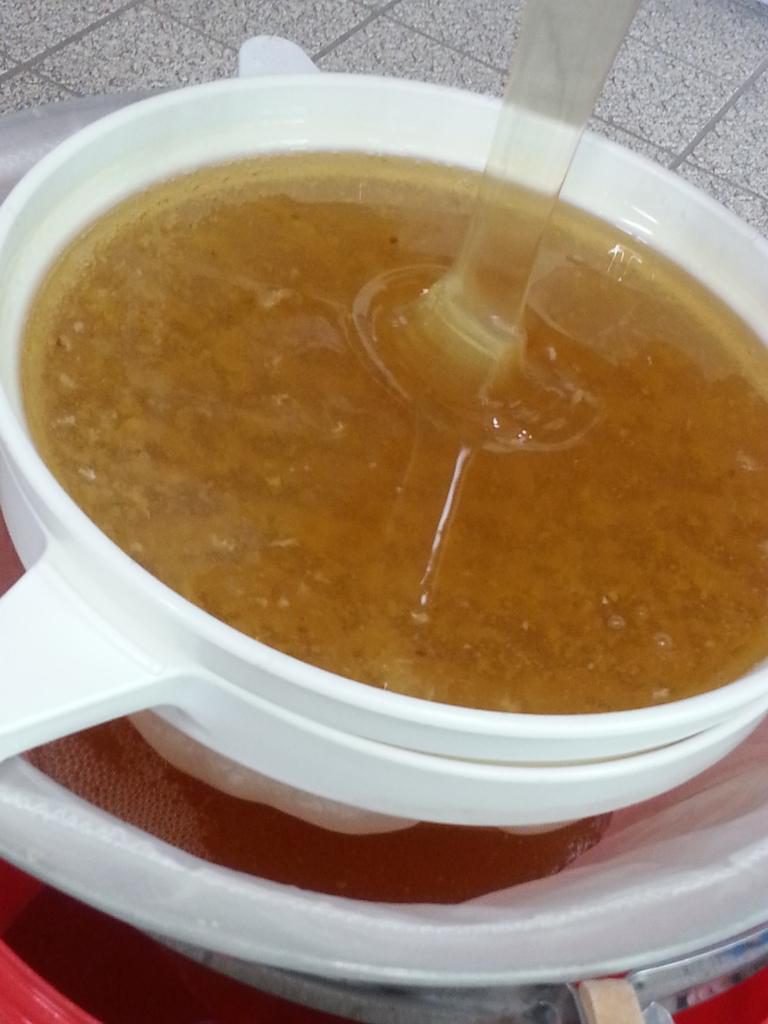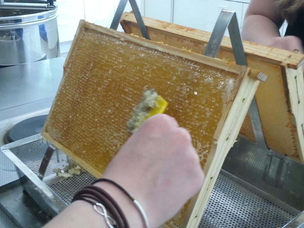 Die Waben wurden in Handarbeit „entdeckelt“ und danach geschleudert. Nach getaner Arbeit blieb noch genug Zeit um den verlockenden Honig zu probieren und die leeren Gefäße „auszuschlecken“.