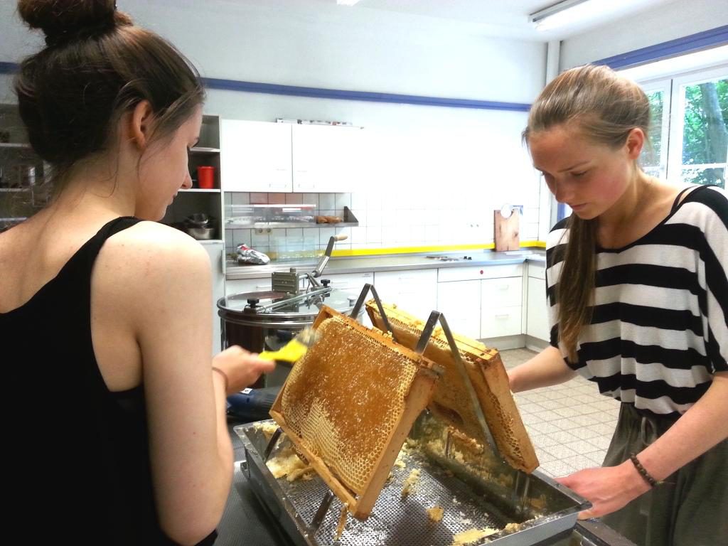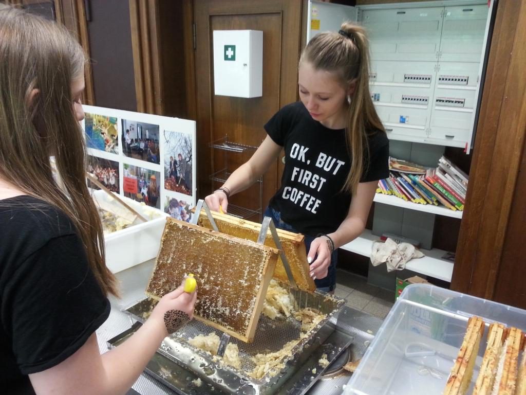 Am Wochenende hat eine Gruppe von Schülerinnen des 9. und 8. Jahrgangs einen Teil des Honigs unserer Schulbienen geerntet. Die Arbeit war bei den hohen Temperaturen mühsam, hat aber allen viel Spaß gemacht.