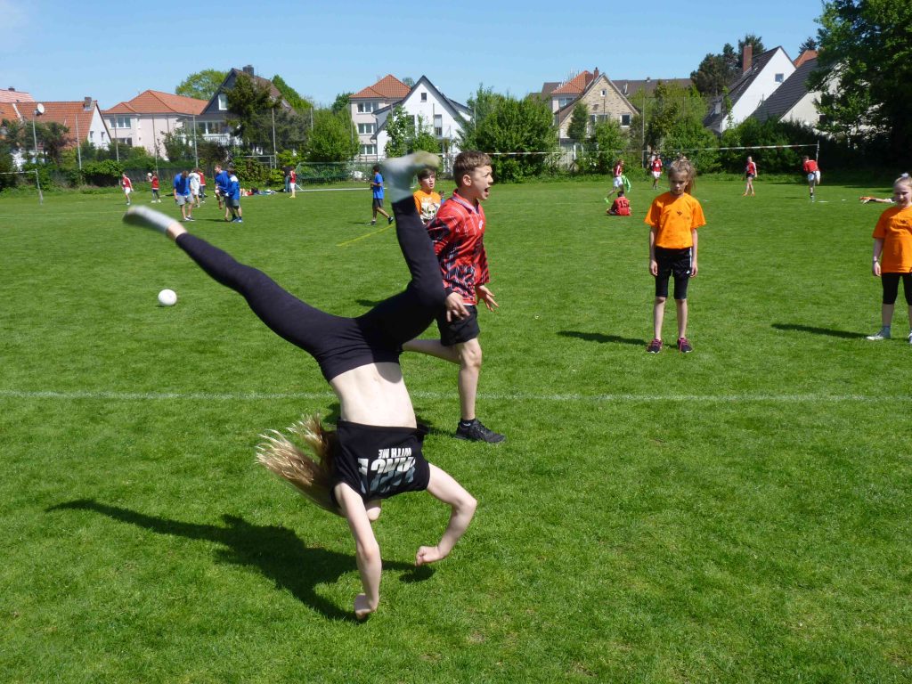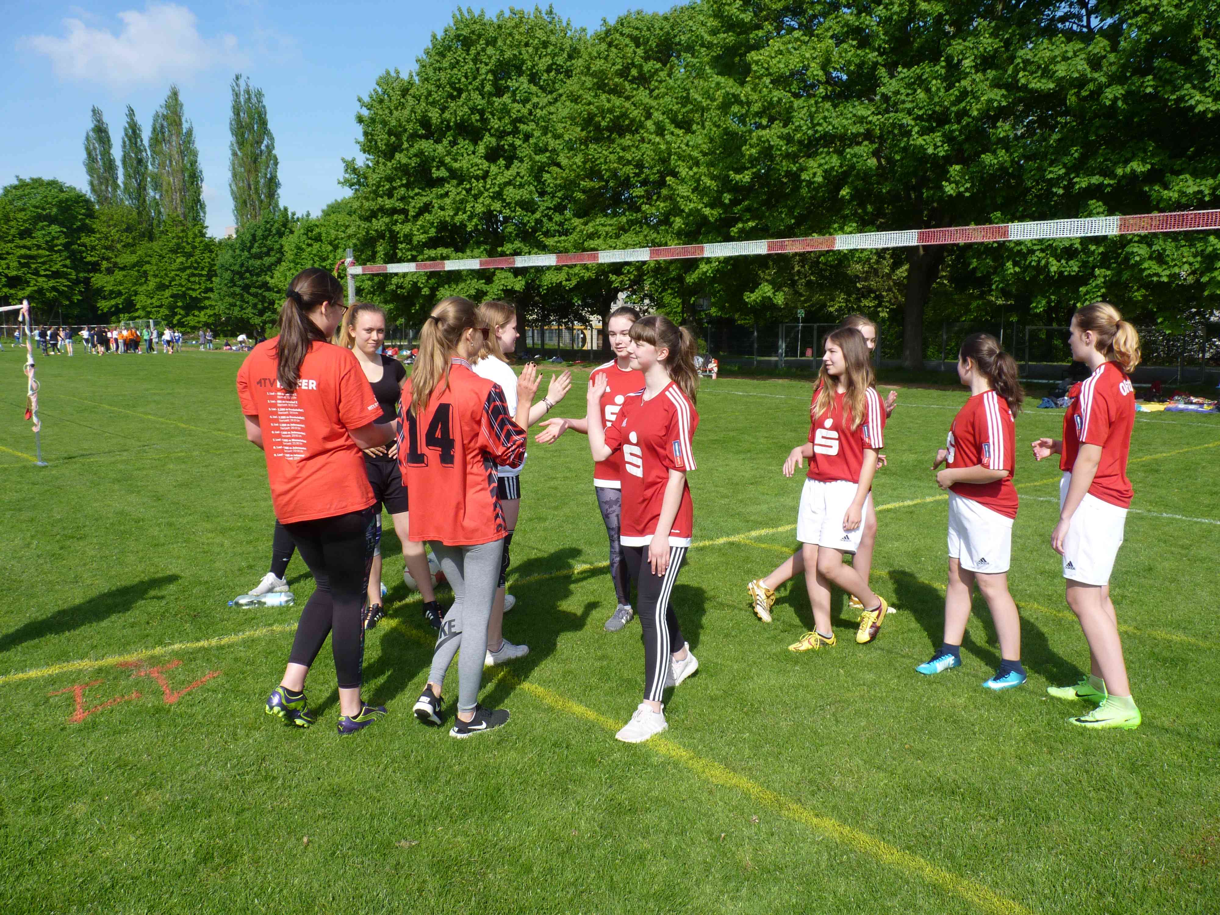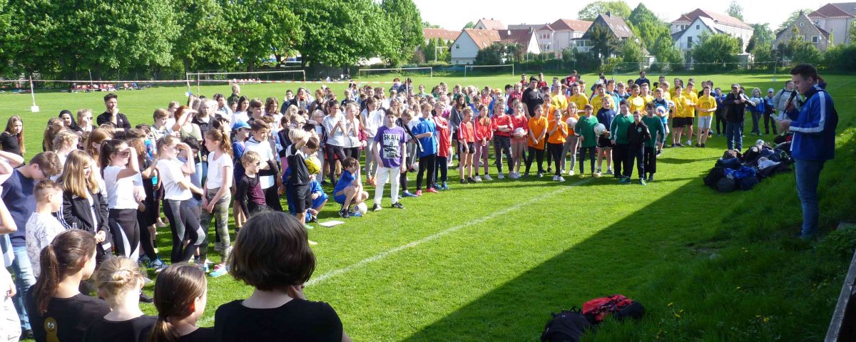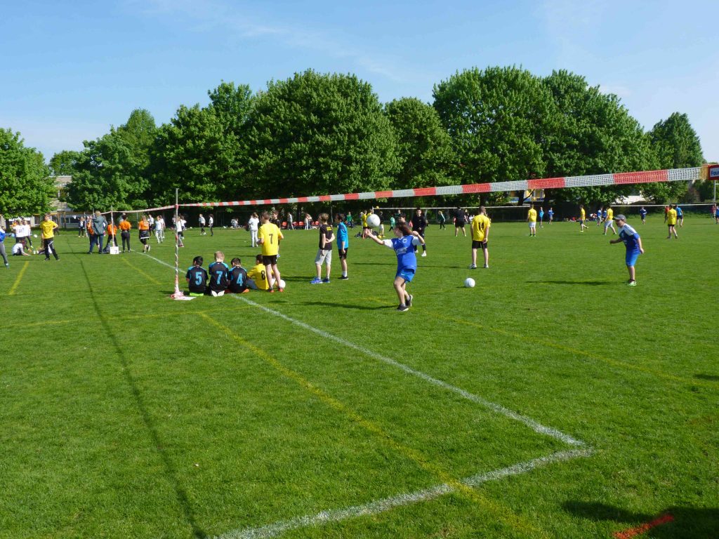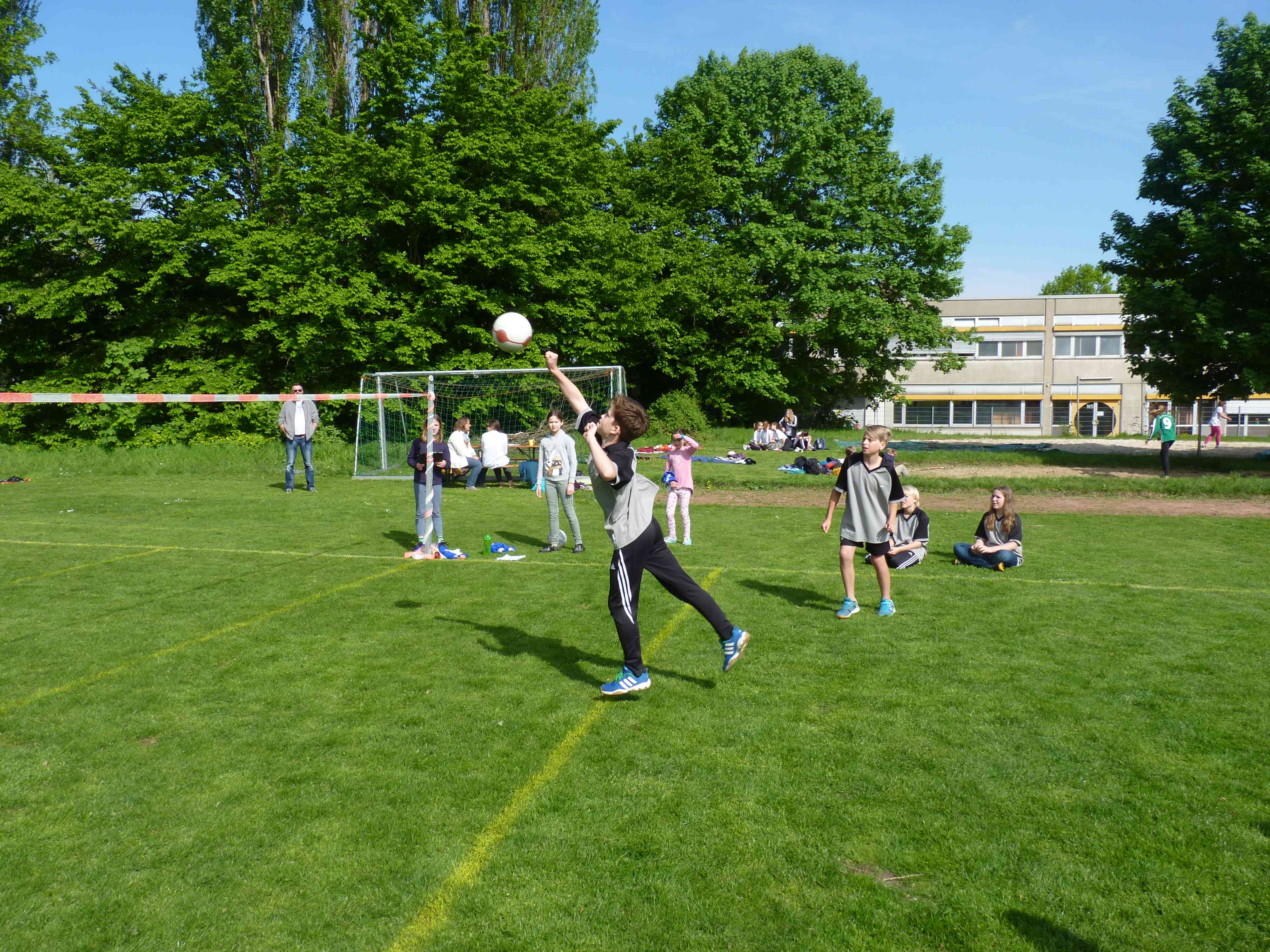 Bei super Sonnenwetter und guter Stimmung auf dem Sportplatz an der Berliner Straße gab es von 10.00 bis 15.00 Uhr viele spannende Faustballspiele zu sehen. Mit viel Eifer konnten sich die Schülerinnen und Schüler in diesem Mannschaftsspiel bewähren, wobei es ebenfalls eine große Herausforderung war, als Schiedsrichter ein Wettkampfspiel zu leiten. Besonders wenn bei lauten Anfeuerungsrufen die Emotionen hoch schwappten, war es nicht immer eine leichte Aufgabe.