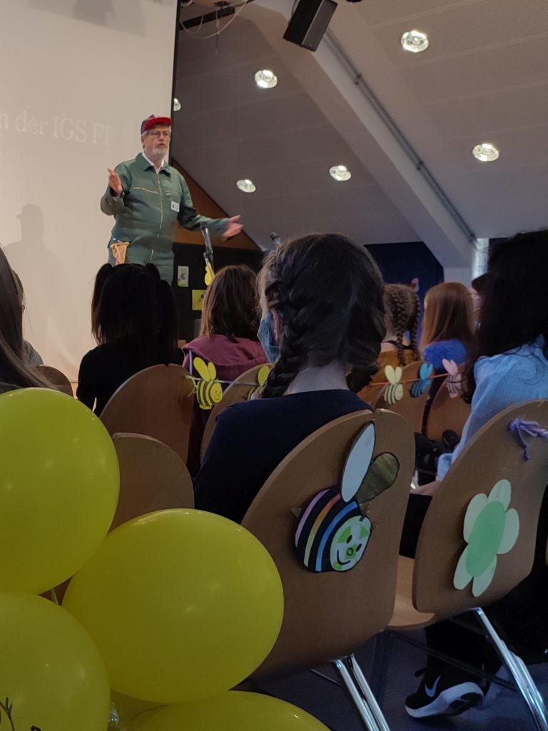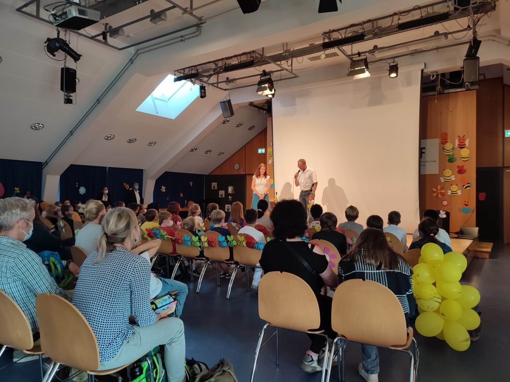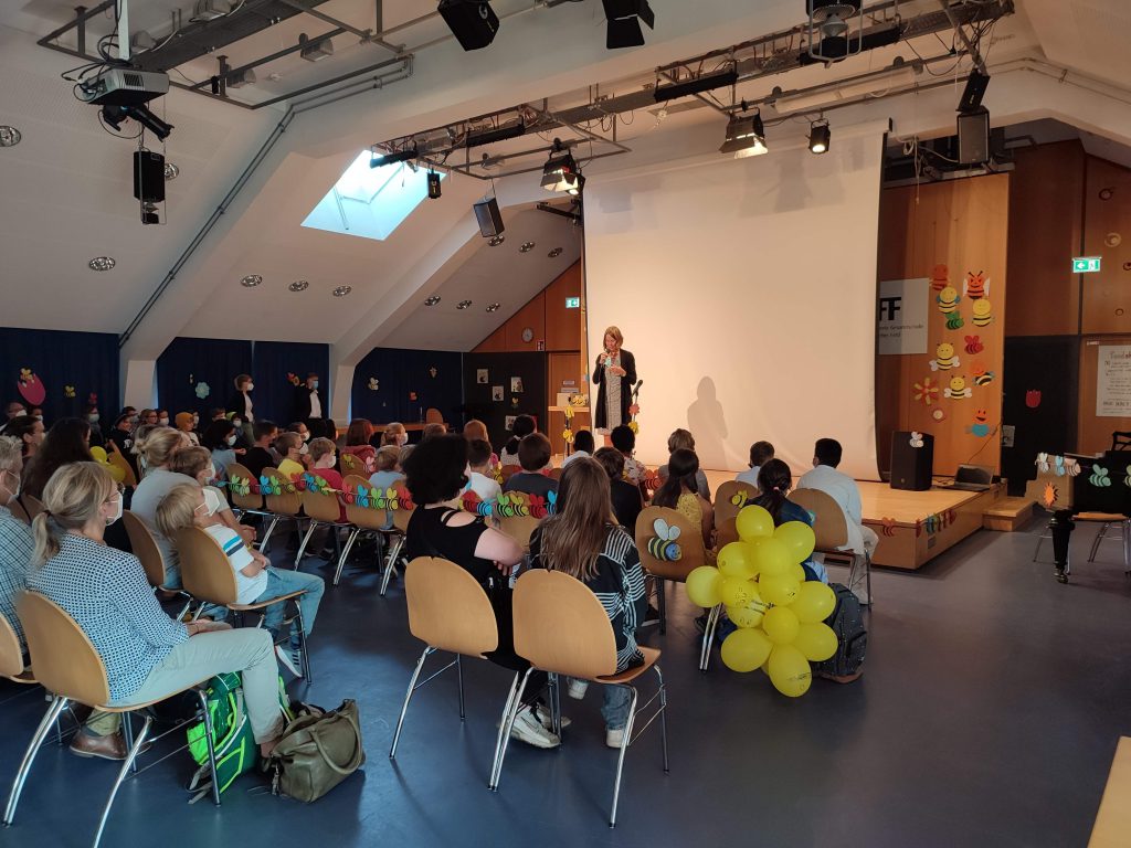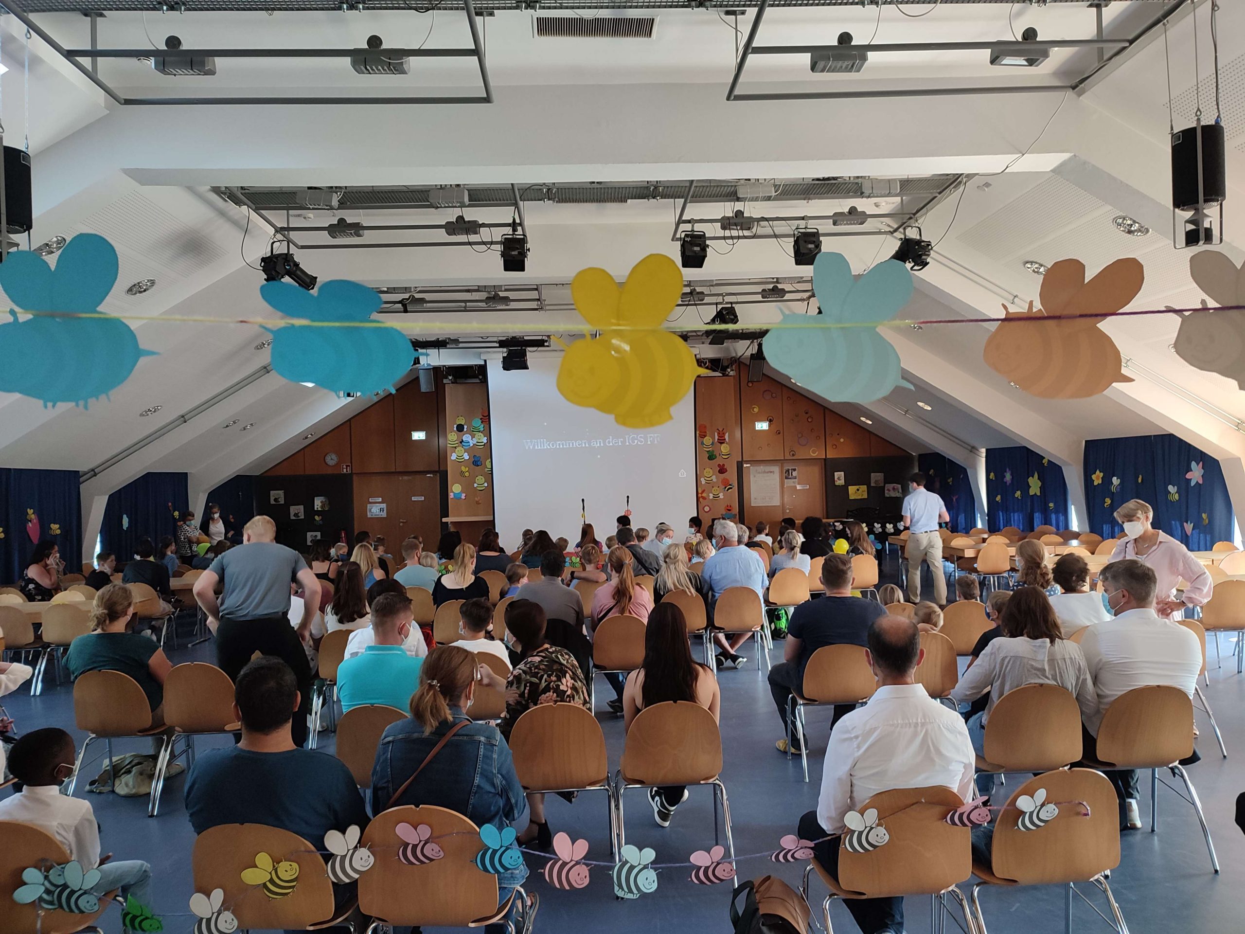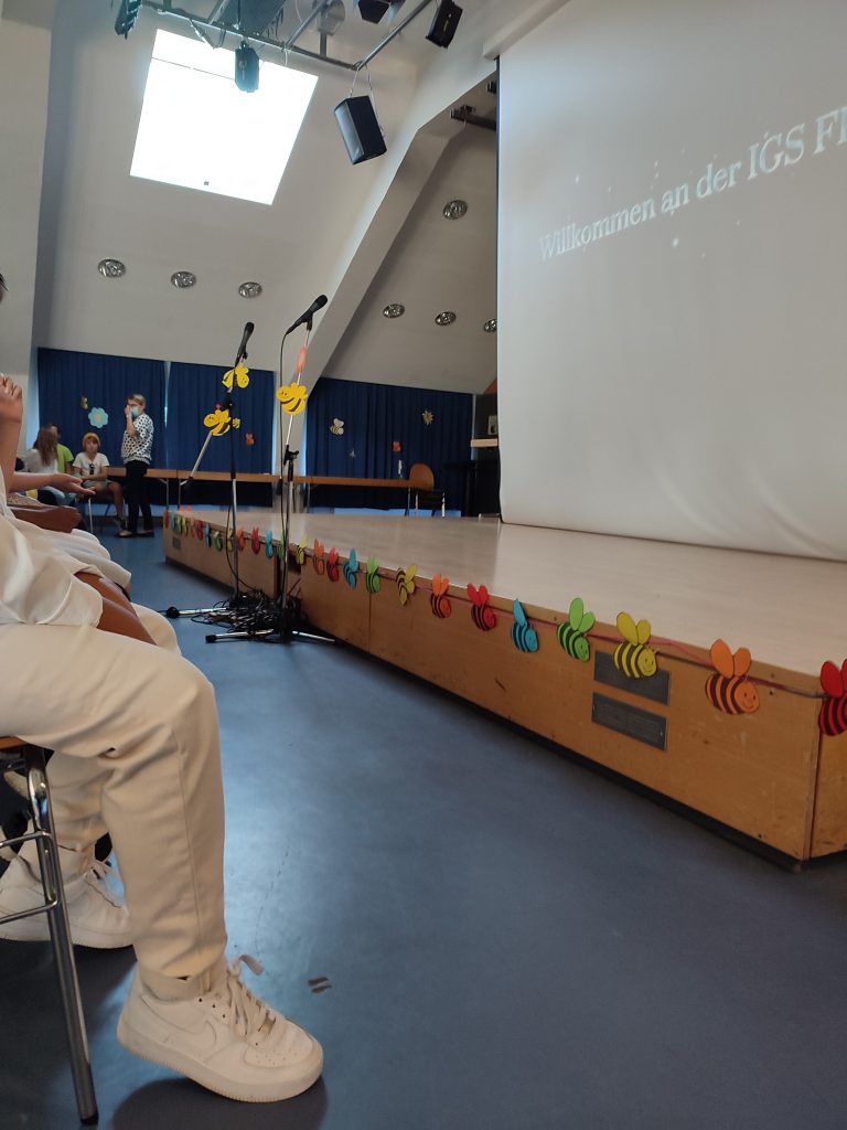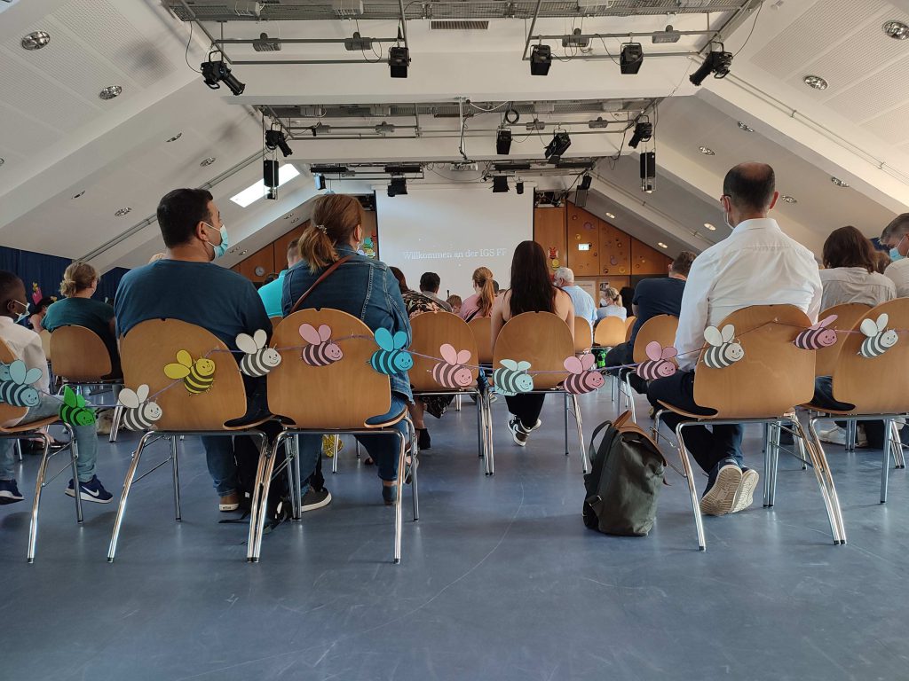 18. September 2021Am Nachmittag des 3. Septembers war es wieder soweit: ein neuer fünfter Jahrgang, der Jahrgang der „Hummeln“, wurde an der IGS:FF begrüßt. Unter Einhaltung der immer noch zu beachtenden Hygienevorschriften kamen die neuen Schüler:innen klassenweise mit ihren Eltern in die Aula. Sie wurden von der Jahrgangsleitung Birte Rothe und einem Moderatorenteam aus Schüler:innen des sechsten Jahrgangs begrüßt. Insgesamt wurde die Einschulungsfeier sehr liebevoll vom sechsten Jahrgang vorbereitet. So gab es auch musikalische Einlagen am Flügel von Sechstklässler:innen. Schulleiter Andreas Meisner sprach als „Tierpfleger“ zu den Neuen und und auch die Eltern wurden aktiv dabei einbezogen. Darauf folgte ein kleiner Film, in dem die jetzigen Sechstklässler:innen beschrieben, wie es ihnen vor einem Jahr ging, als sie als Neue in der Mensa saßen – und sie machten Mut, dass es eine gute Entscheidung gewesen sei, an die IGS:FF zu gehen.