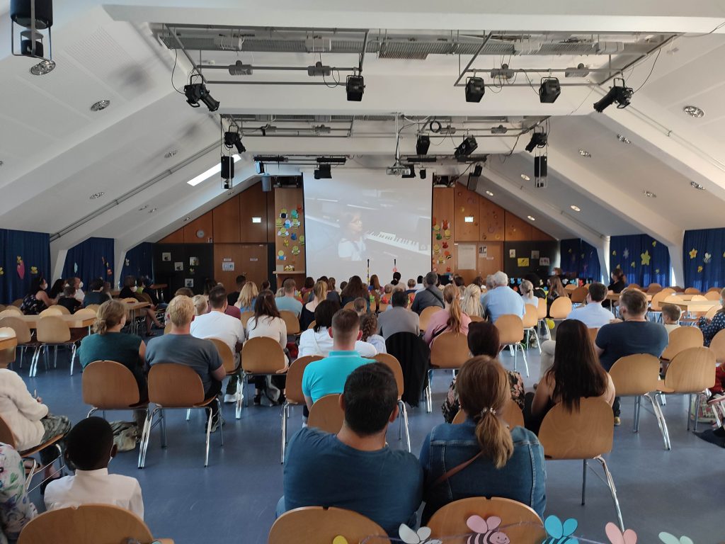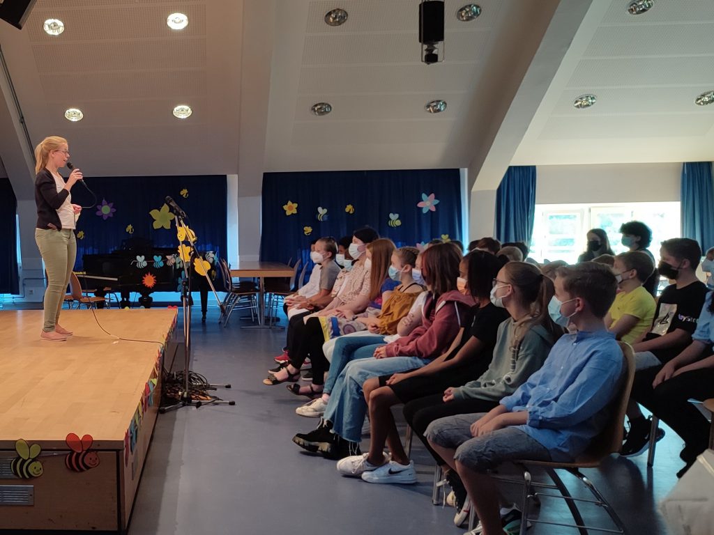Die Jahrgangsleitung des neuen fünften Jahrgangs, Andrea Warncke, leitete dann zur Vorstellung der jeweiligen Tutoren über, die dann ihre Schüler:innen auf der Bühne begrüßten und diese anschließend in den Klassenraum zu einer ersten Unterrichtsstunde begleiteten. Die Eltern konnten in dieser Zeit sich gegenseitig und Eltern aus dem sechsten Jahrgang bei bestem Wetter auf dem grünen Schulhof bei Kaffee und Kuchen kennenlernen und im Anschluss an die Unterrichtsstunde ihre Kinder wieder in Empfang nehmen.