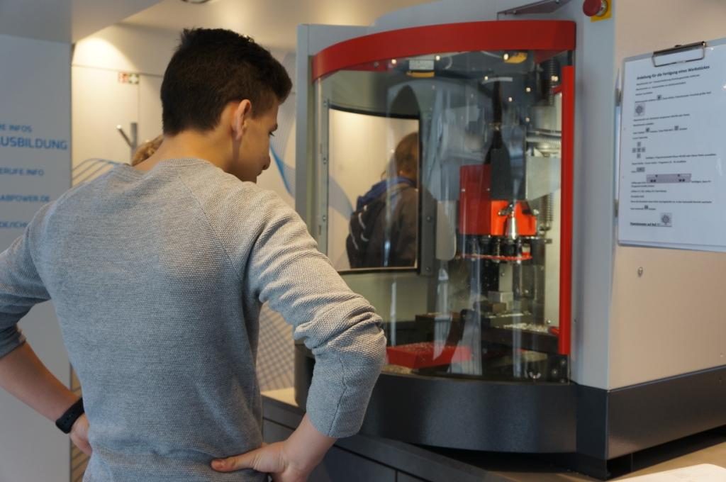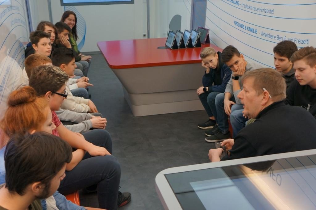 Der „BerufeScout“ auf dem mannshohen Touch-Monitor erklärt wichtige Inhalte zu den M+E-Berufen und zeigt das Ausbildungsangebot sowie freie Lehrstellen von Unternehmen in der Region.