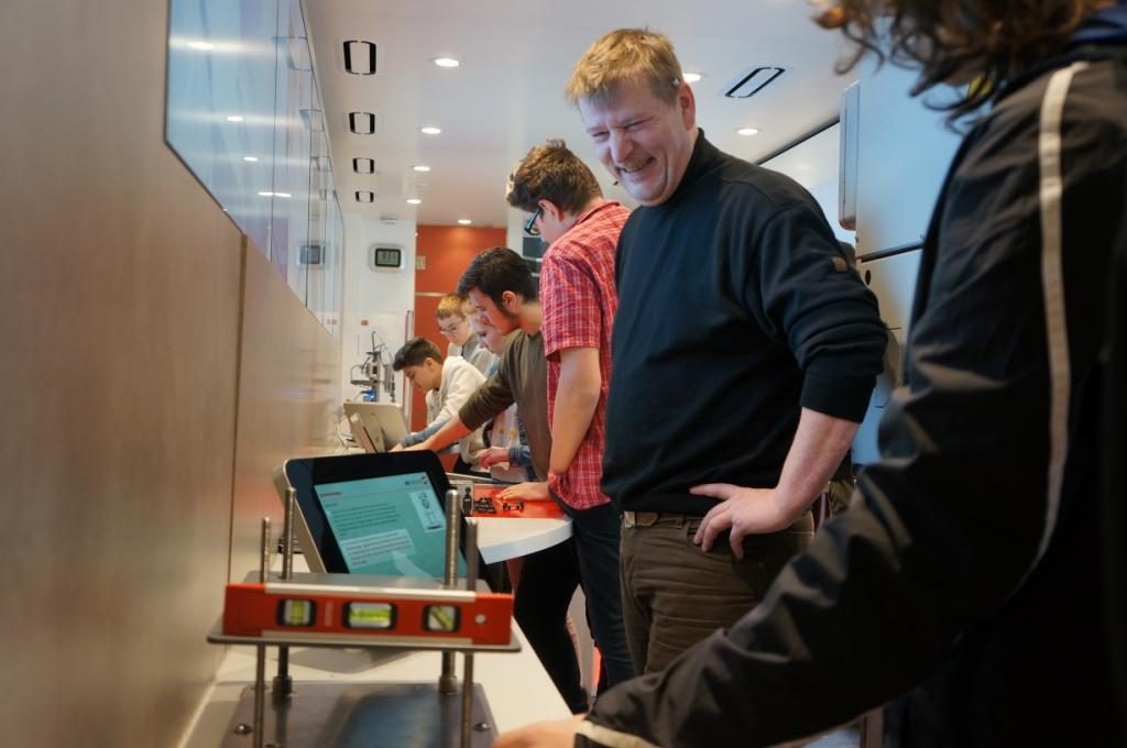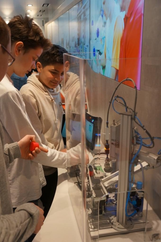 Der 32 Tonnen schwere Infotruck lässt sich per Hydraulik auf zwei Etagen ausfahren. Auf 80 Quadratmetern können ganze Schulklassen in zwei Gruppen aufgeteilt unterrichtet werden. Technik erlebbar wird auf der unteren Etage an mehreren Mitmachstationen. An einer CNC-Fräse können die SchülerInnen durch Programmieren ein eigenes Werkstück herstellen. Ein Aufzugmodell demonstriert anschaulich, warum eine intelligente IT-Steuerung die Wartezeit für die Nutzer deutlich reduziert.