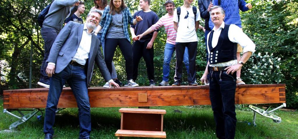 Für unser Sozialtraining entstand der Wunsch eine Großwippe auf dem Schulgelände zu haben. Eine industrielle Wippe war aber so nicht finanzierbar. So ergab sich der Kontakt zu Herrn Birnschein von der Johannes-Selenka-Schule mit seinen Schülern eine solche Wippe zu bauen. Mit Hilfe einer Spende der Volksbank BraWo Stiftung von 2000,- € konnte dann der Wunsch Wirklichkeit werden!