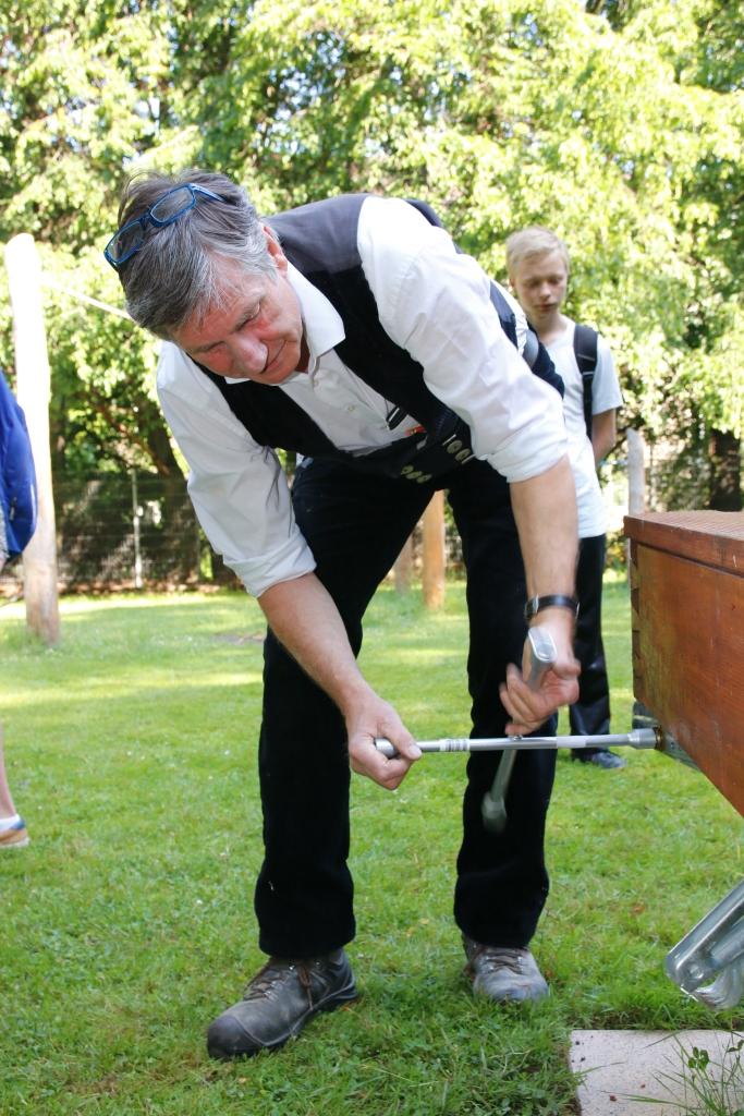 Der eigentliche Bau begann im zweiten Halbjahr 2016, nachdem das Holz geliefert worden war. Nur wenige Schüler waren für die Eckverbindung mit den Schwalbenschwänzen zu begeistern, nachdem sie an einem Übungsstück gemerkt habe, wie schwierig es ist, diese Holzverbindung in guter Qualität her zu stellen. Daher waren zuerst immer nur wenige Schüler gleichzeitig beschäftigt. Erst zum Schluss kam Schwung in die Sache, als der Belag angeschraubt, die Welle und die Lager eingepasst und die Fundamente mit den Auflagern auf ihrem Schulgelände eingebaut wurden.