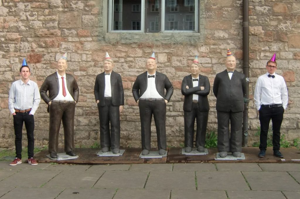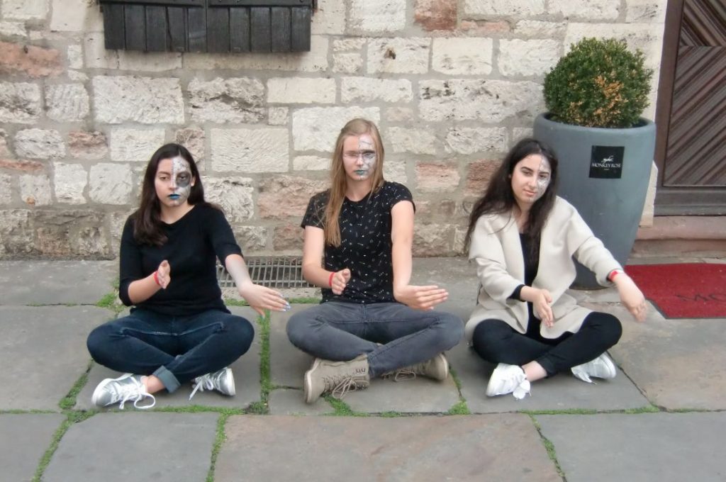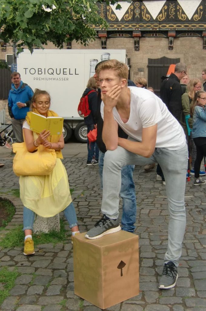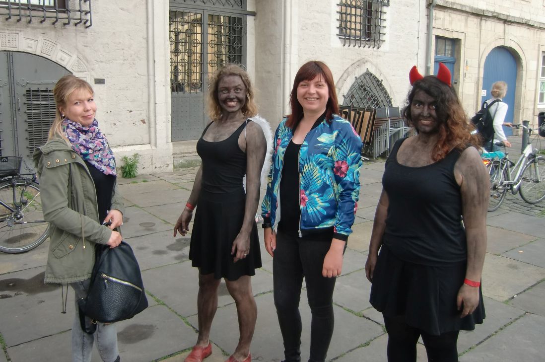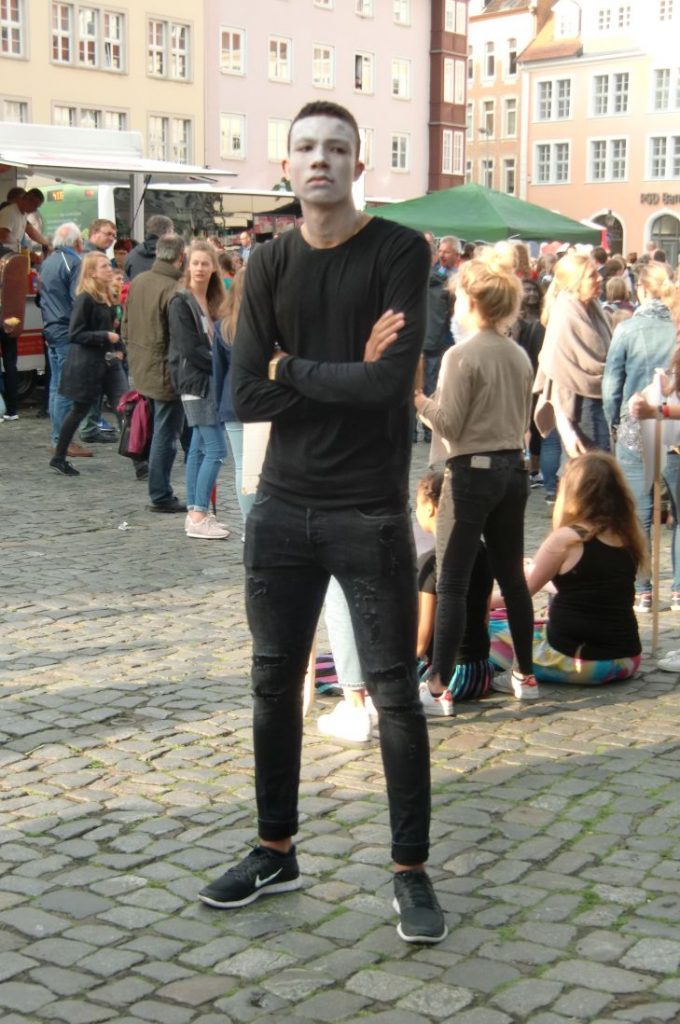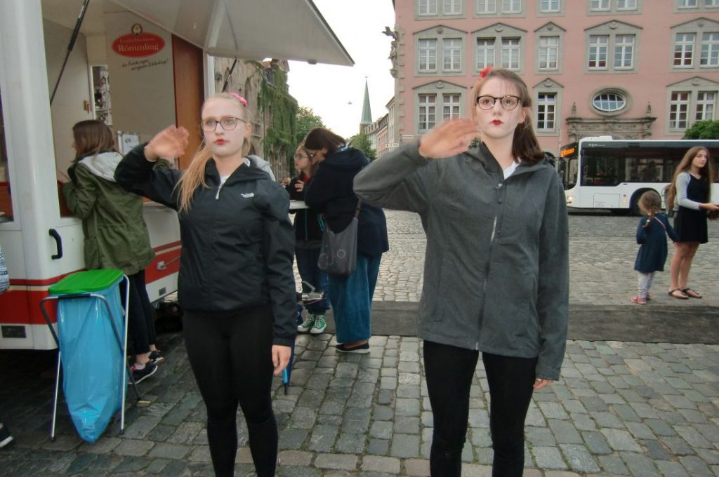 Zwei Schüler „spielten“ mit echten Skulpturen, die sich zur Zeit auf dem Altstadtmarkt befinden, indem sie sich zu diesen Figuren gruppierten, und einige Schüler des 12. Jahrgangs haben direkt mit den Zuschauern interagiert: als „Engelchen und Teufelchen“ oder als „freche Mäuse“ sind sie durch die Menge geflitzt.