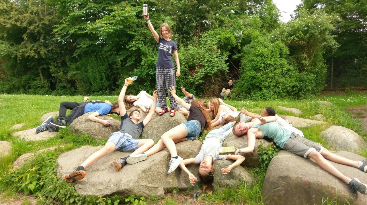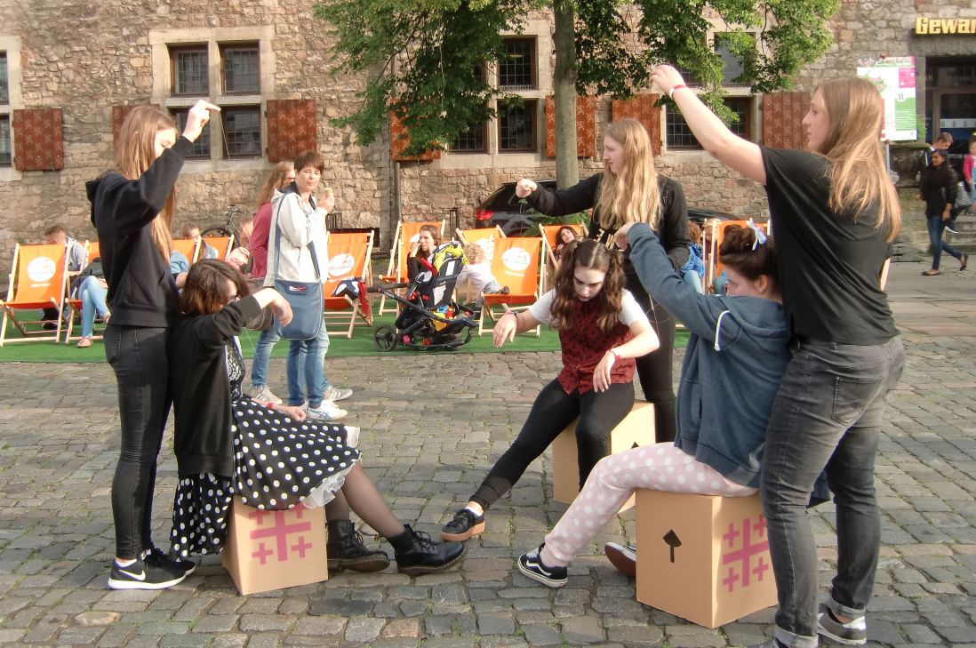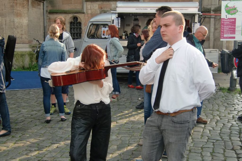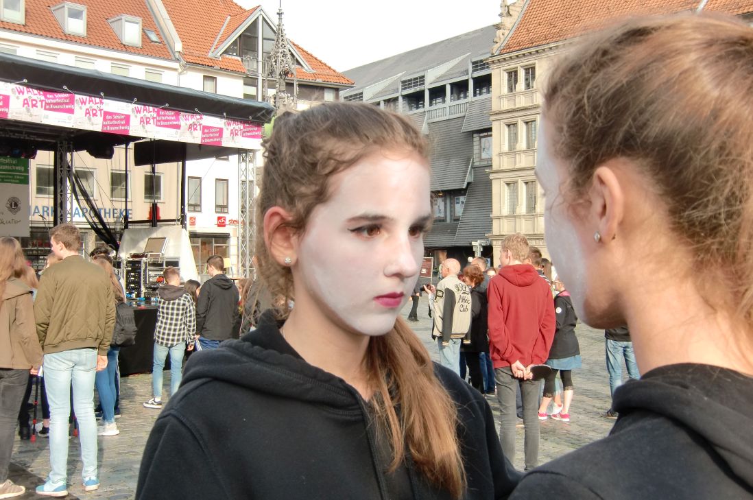18. Juni 2017Am Abend des 09.06.17 fanden während des Walk’n’Arts-Festivals die Performances der drei Darstellendes-Spiel-Kurse aus den Jahrgängen 9-12 unserer Schule statt. Dies geschah unter der Leitung von Frau Bethke und Herrn Möhlmann (Universität Hannover), die uns mit Workshops und Gruppentraining darauf vorbereitet haben. Als sogenannter „Walking Act“ traten wir alle auf dem Altstadt- bzw. Eiermarkt während der Pausen zwischen den Acts in den umliegenden Spielstätten auf. Zu Beginn unseres ersten Auftritts war zum Glück der heftige Regen vorbei, so dass wir wie geplant in der Abendsonne spielen konnten.