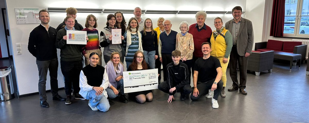 Anlass für die Verleihung ist ein Wahlpflichtkurs, den SchülerInnen des 9. und 10. Jahrgangs seit August besuchen können: Im WPK „MitMenschen“ besuchen sie regelmäßig die Bewohner:innen des Pflegeheims St. Thomaehof in der Ottenroder Straße. Hier erlebt man vieles – von Bowlingspielen über Galgenraten, gemeinsamer Sitzgymnastik oder Mensch ärgere dich nicht – wesentlich ist, dass Jung und Alt das alles gemeinsam erleben. Das erste Halbjahr hat die Gruppe viel gelehrt: unter anderem sich zu trauen, auf Menschen zuzugehen, die die gemeinsame Zeit schätzen. Und dass die Bewohner:innen des Pflegeheims ganz unterschiedliche Angebote brauchen, um sich wohlzufühlen.