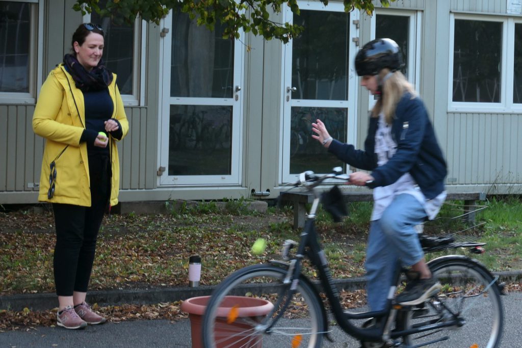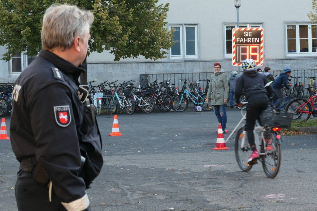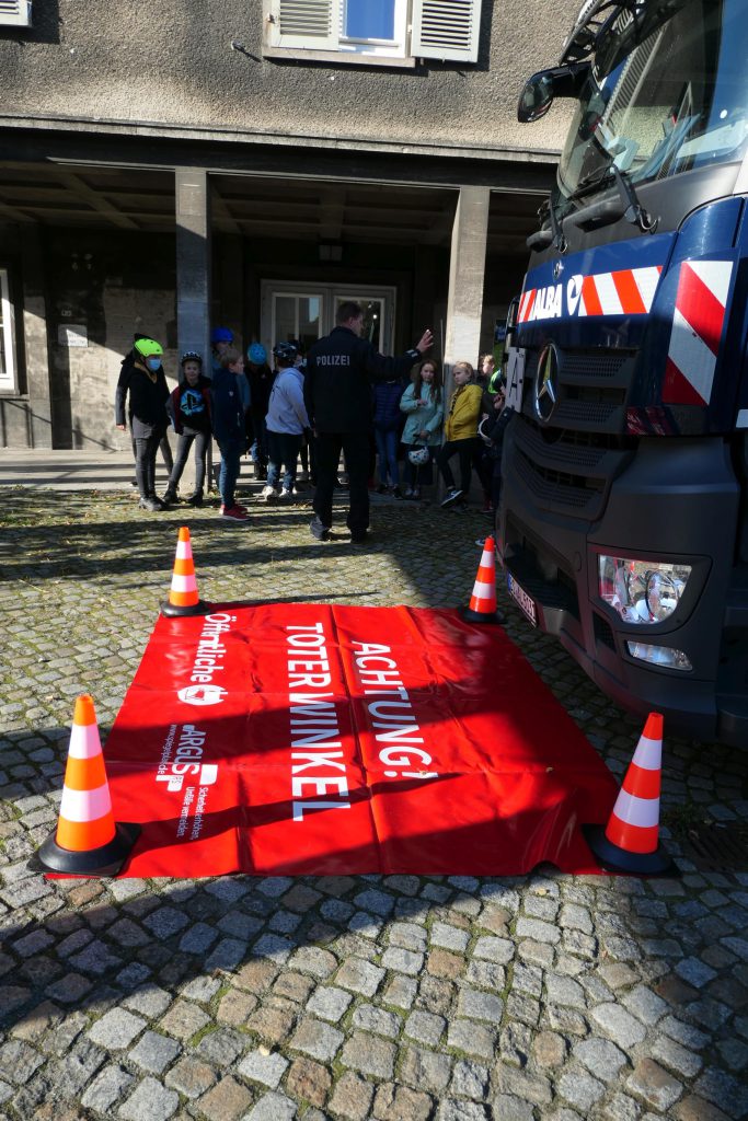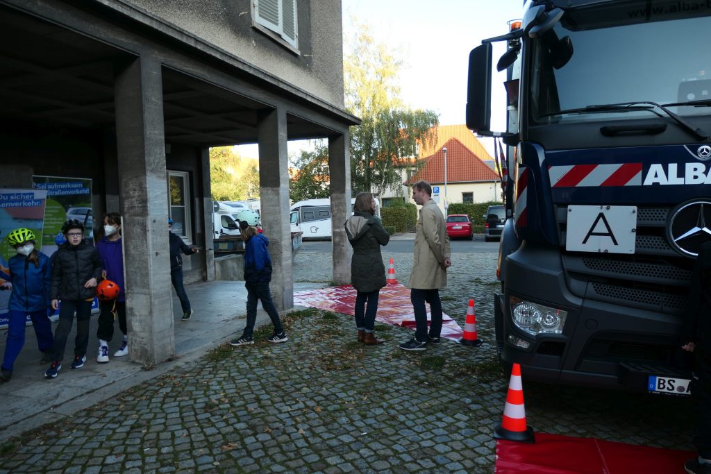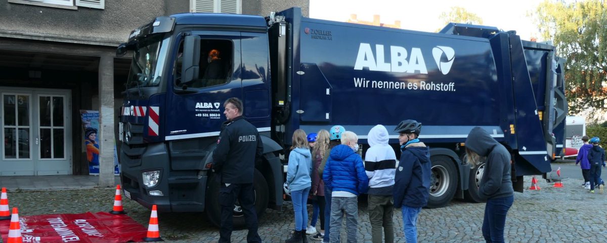 Da fragt man sich doch, was ein Becher auf dem Fahrrad zu suchen hat. Den Kindern der neuen 5. Klassen war das ganz schnell klar. Sie bewiesen ihr Fahrgeschick, indem sie während der Fahrt einen Becher von einer Stange in die Hand nahmen und auf dem nächsten ablegten. Da hatte sich Herr Weidemann vom Präventionsteam der Polizei eine Menge anschaulicher Übungen zu Reaktionsgeschwindigkeit, Anhalteweg und Fahrradsicherheit überlegt. Sein Kollege, Herr Grünvogel, demonstrierte eindrucksvoll den toten Winkel und die damit verbundenen Gefahren. Das Unternehmen ALBA war so freundlich und stellte ein wirklich großes Fahrzeug zur Verfügung.