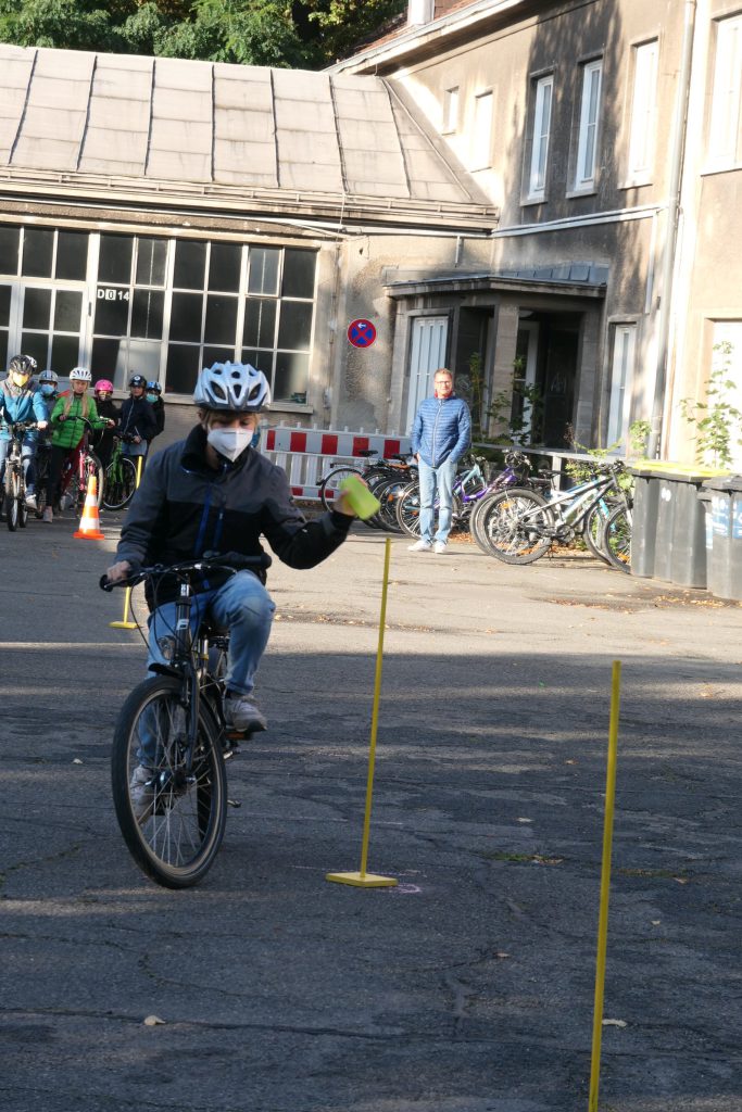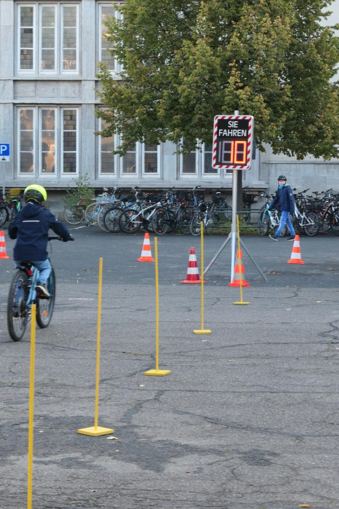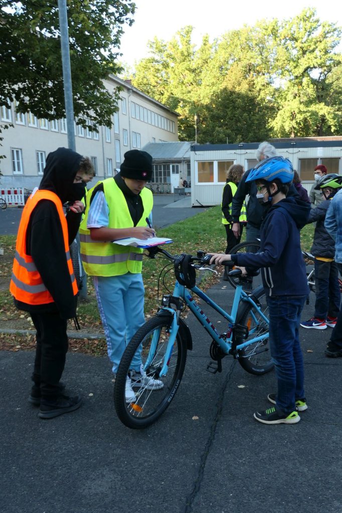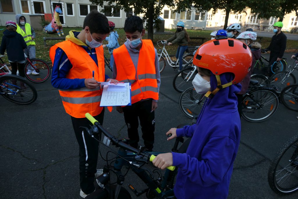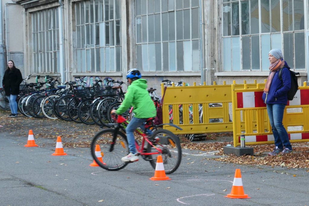 Mit Unterstützung der Eltern und unserer Praktikantinnen der Sozialpädagogik meisterten die Kinder einen Geschicklichkeits-Parcours. Da mussten sie mit ihren Fahrrädern ganz schön kurven. Vorher wurden ihre Gefährte von den Jugendlichen des Kurses Technische Welt 8 auf Verkehrssicherheit überprüft. Funktioniert das Licht? Bremst das Fahrrad gut?