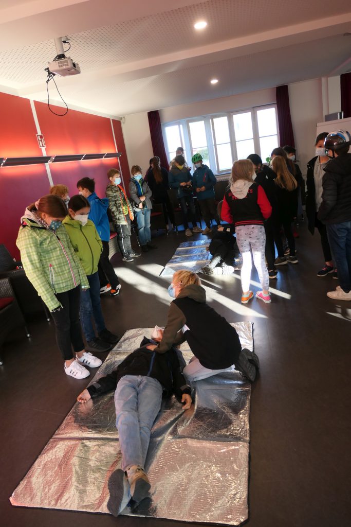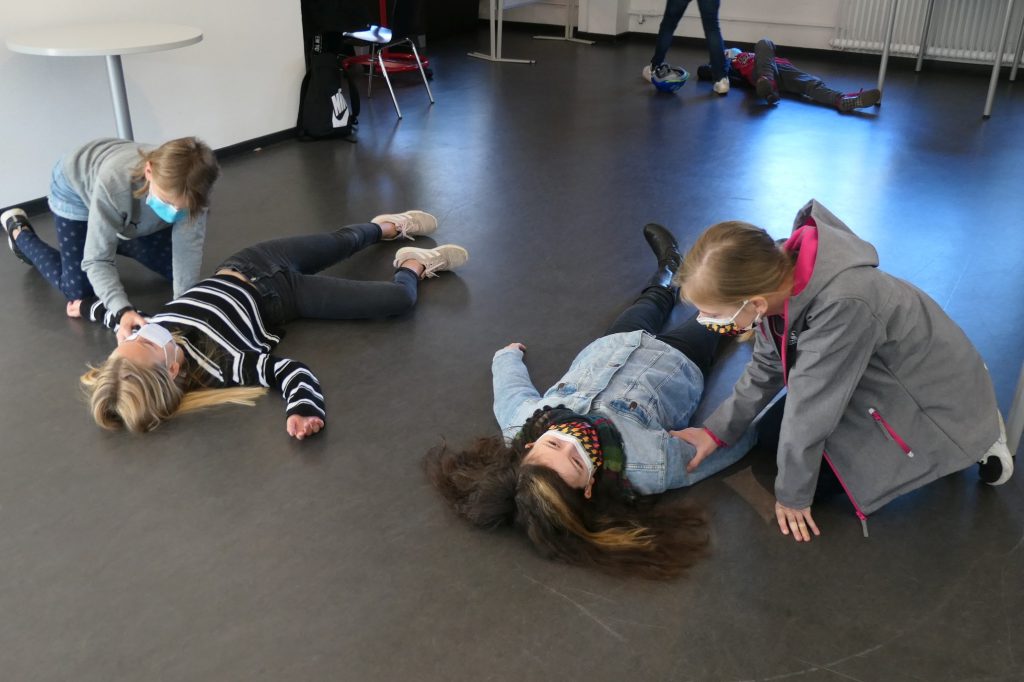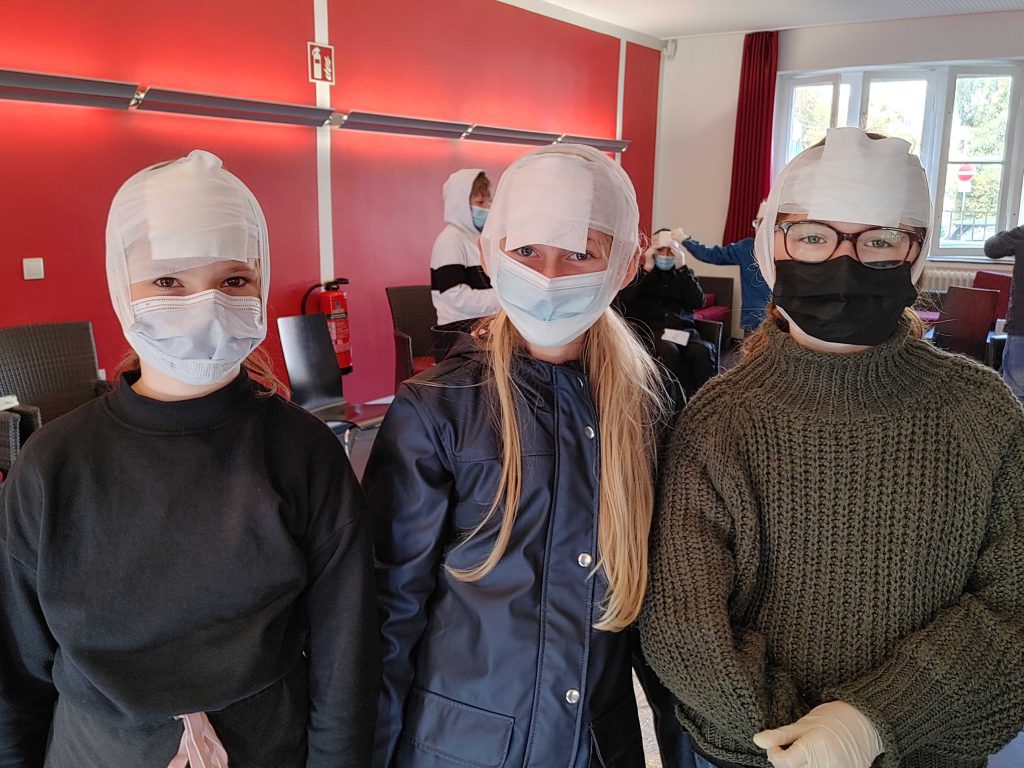 In unserer Mediathek zeigte der ASB grundlegende Maßnahmen zur 1. Hilfe. Stabile Seitenlage und Notverbände können sie nun, unsere 5.-Klässler.
