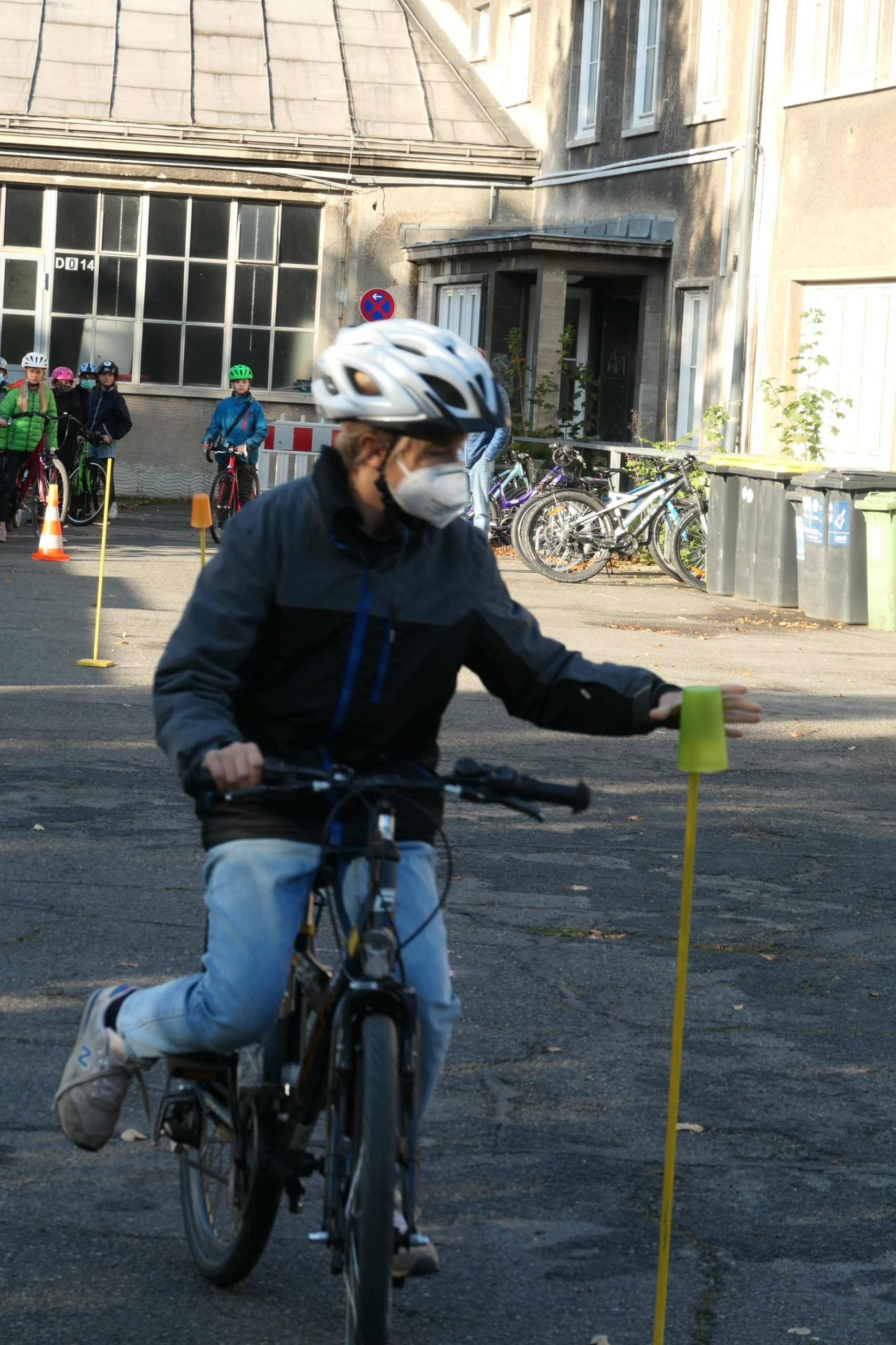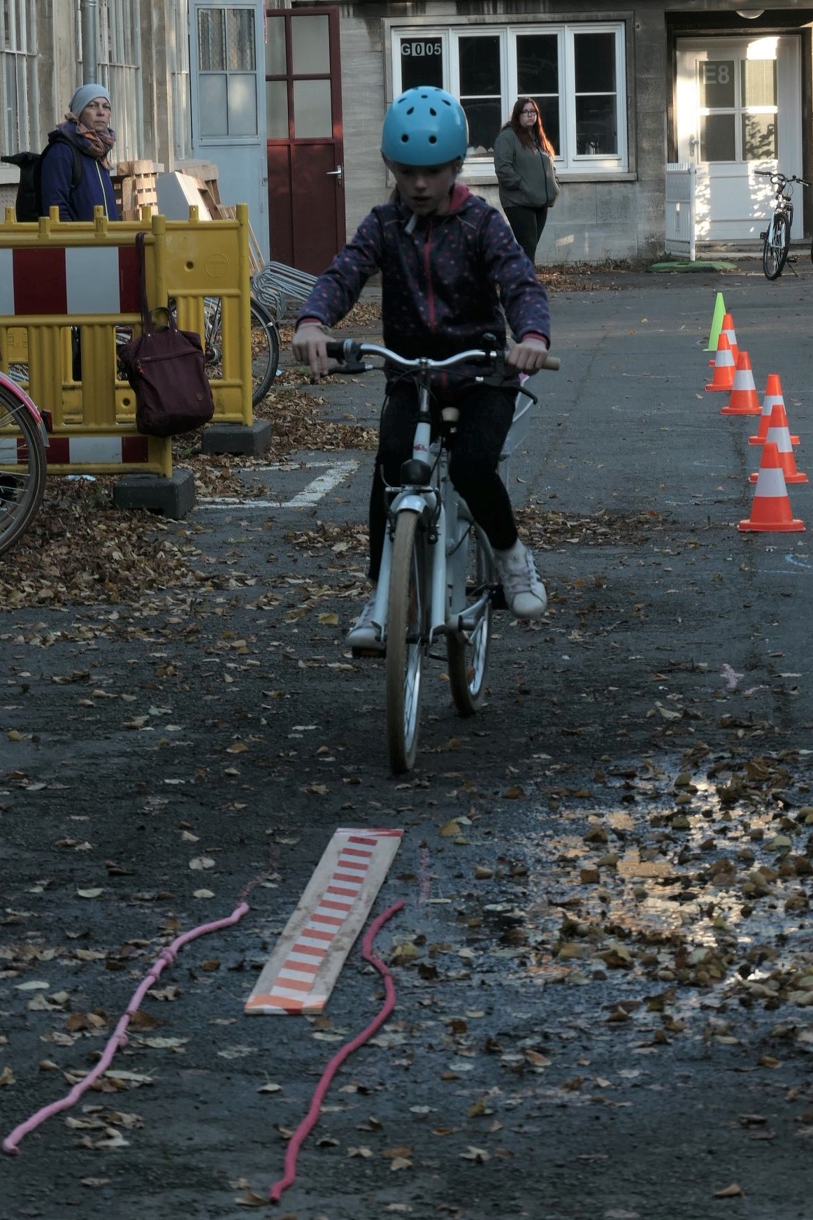 Mit Unterstützung der Eltern und unserer Praktikantinnen der Sozialpädagogik meisterten die Kinder einen Geschicklichkeits-Parcours. Da mussten sie mit ihren Fahrrädern ganz schön kurven. Vorher wurden ihre Gefährte von den Jugendlichen des Kurses Technische Welt 8 auf Verkehrssicherheit überprüft. Funktioniert das Licht? Bremst das Fahrrad gut?