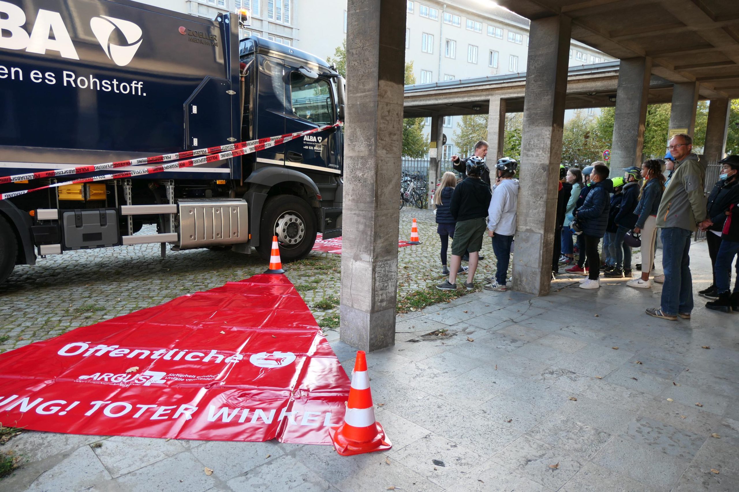 Da fragt man sich doch, was ein Becher auf dem Fahrrad zu suchen hat. Den Kindern der neuen 5. Klassen war das ganz schnell klar. Sie bewiesen ihr Fahrgeschick, indem sie während der Fahrt einen Becher von einer Stange in die Hand nahmen und auf dem nächsten ablegten. Da hatte sich Herr Weidemann vom Präventionsteam der Polizei eine Menge anschaulicher Übungen zu Reaktionsgeschwindigkeit, Anhalteweg und Fahrradsicherheit überlegt. Sein Kollege, Herr Grünvogel, demonstrierte eindrucksvoll den toten Winkel und die damit verbundenen Gefahren. Das Unternehmen ALBA war so freundlich und stellte ein wirklich großes Fahrzeug zur Verfügung.