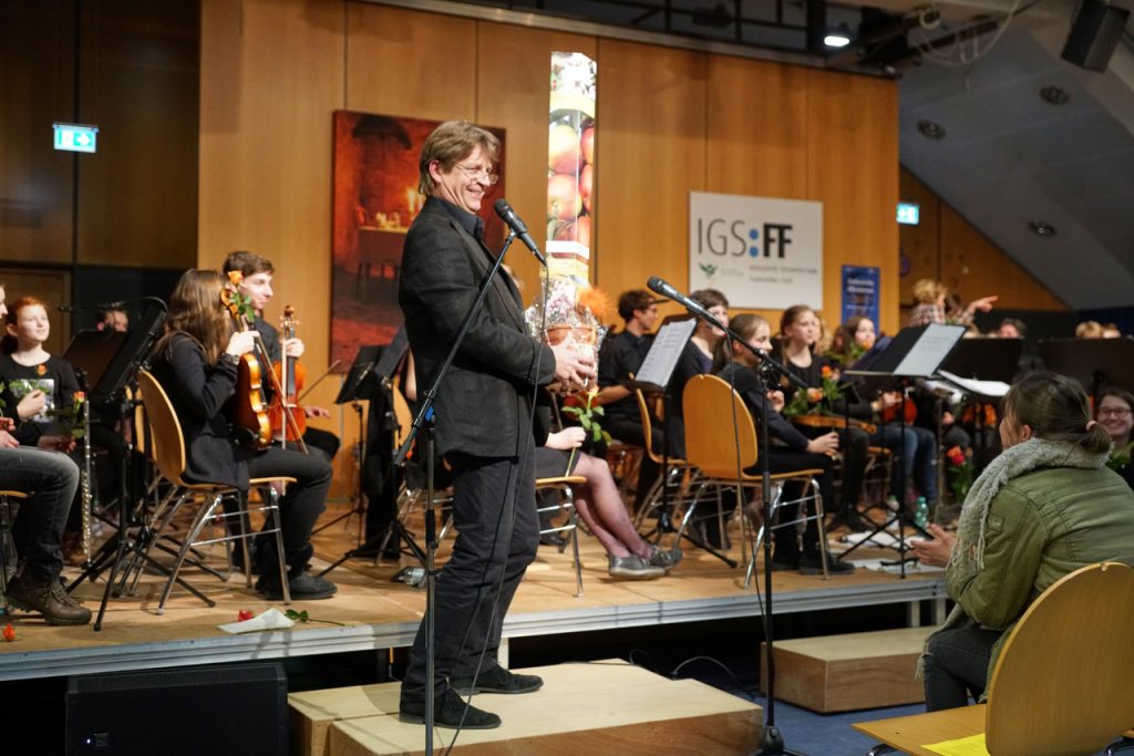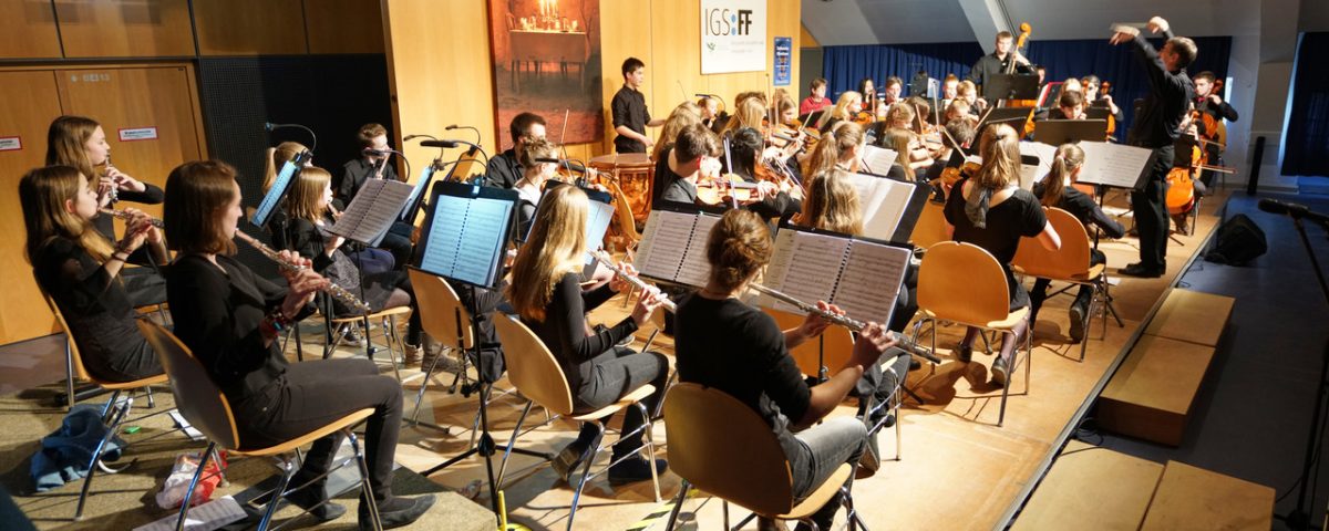 21. April 2017Am 16. März war es dann soweit. Beim ersten Konzert der neu zusammengesetzten Franzschen Vielharmonie wurden sinfonische Ohrwürmer von Tschaikowski über Händel, Brahms, Dvorák, Grieg und Schostakowitsch zu Beethoven brilliant und nahezu professionell auf die Bühne gebracht. Durch die Öffnung des Orchesters für Schülerinnen anderer Schulen hat die Franzsche Vielharmonie einen eindrucksvollen Klangkörper und eine Qualität bekommen, die sich hören lassen können. Als i-Tüpfelchen spielten auch noch Profimusiker des Braunschweiger Staatsorchesters mit. Auch schwierige Passagen wurden gemeistert und das Orchester unter der Leitung von Günther Westenberger kann Stolz auf seine Leistung sein. Bei Beethovens „Ode an die Freude“ erhob sich ein Gast und sang den Text mit. Davon angesteckt und mit einer Textvorlage versehen schloss sich das gesamte Auditorium an. Emma und Kübra aus dem siebten Jahrgang moderierten die Stücke unterhaltsam und lehrreich, in dem sie Informationen über die Komponisten und die Stücke in motivierender Form zum Besten gaben.