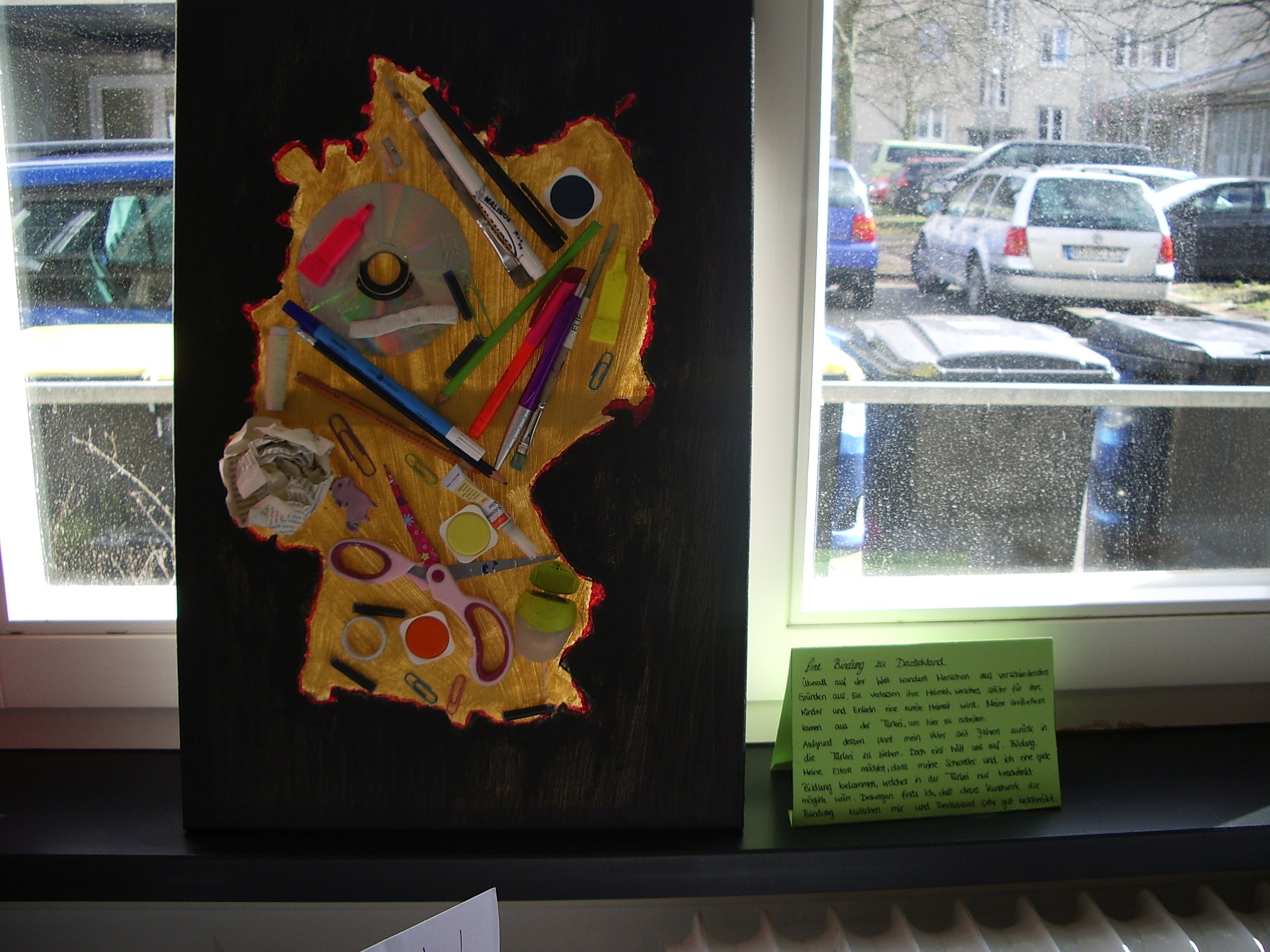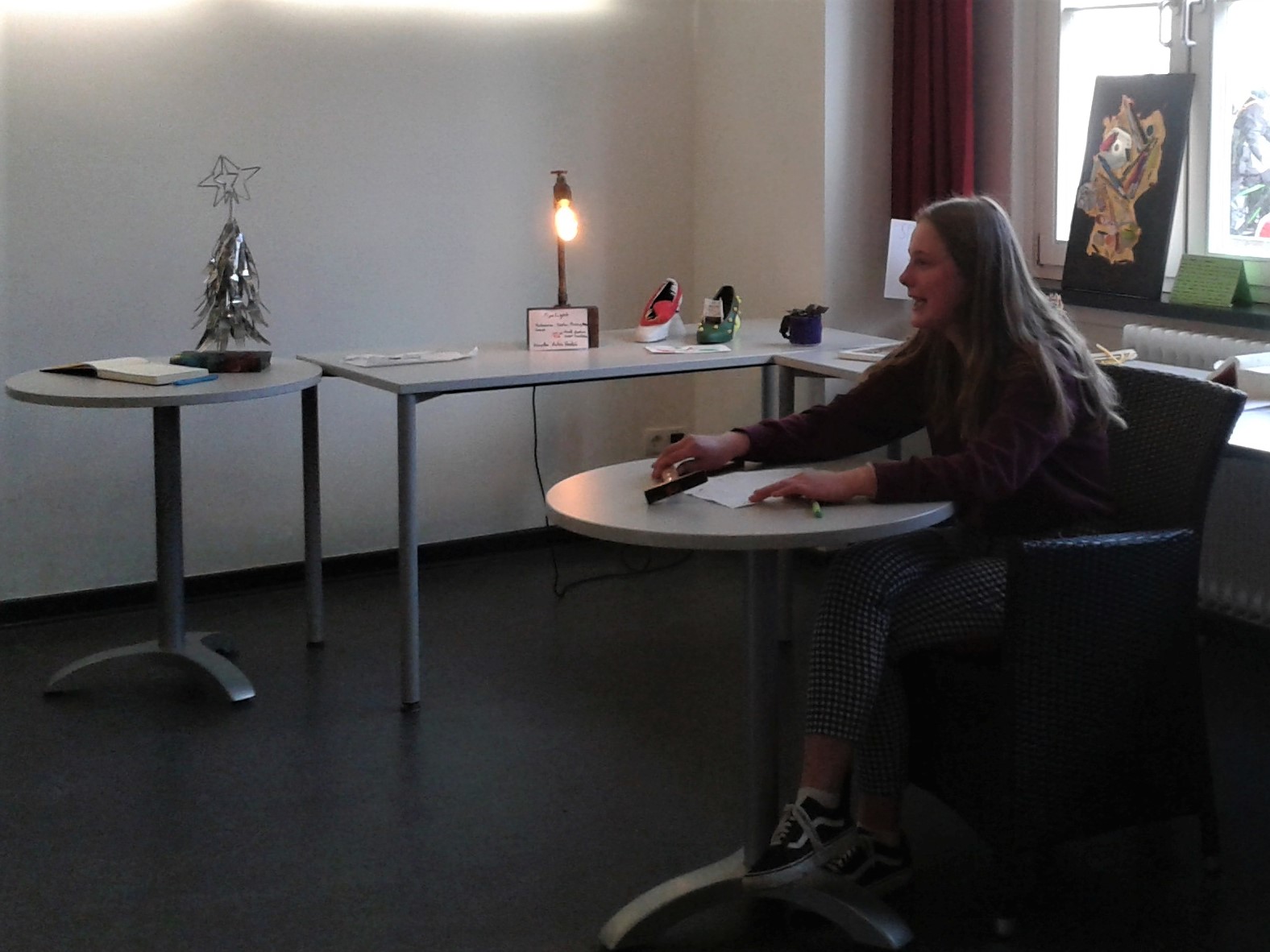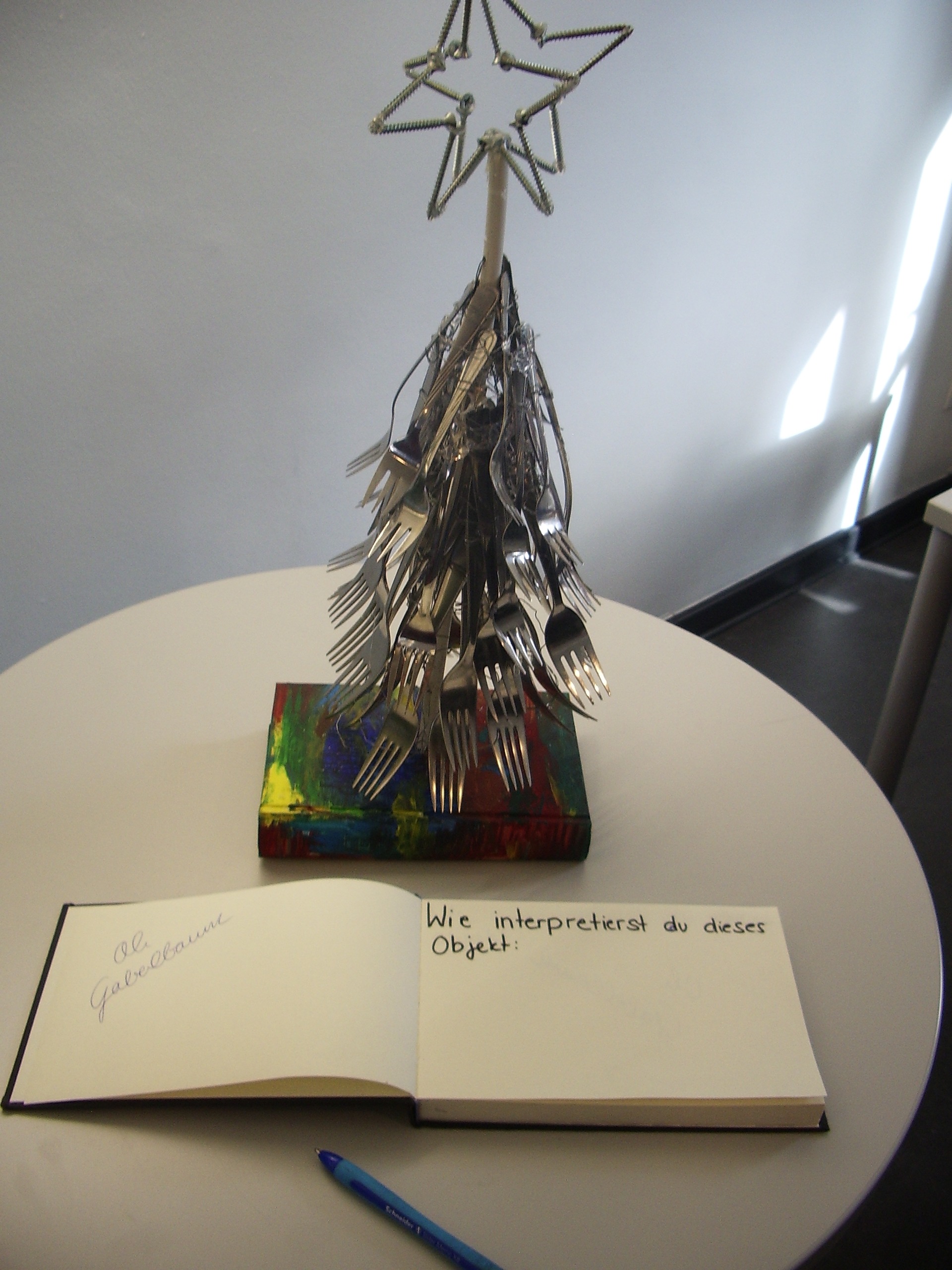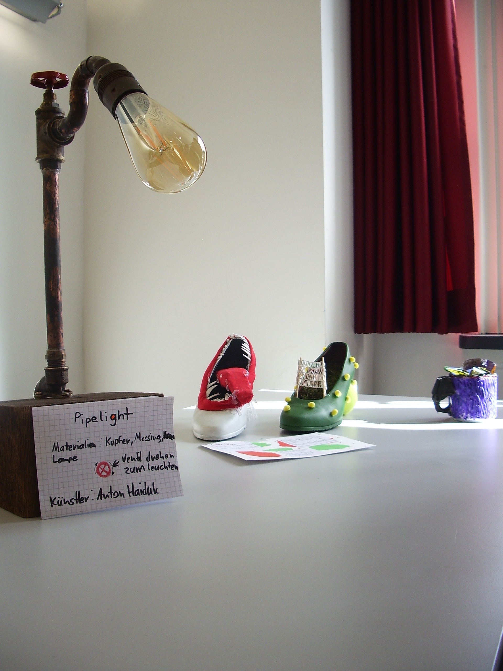 Der Kurs hatte sich anlässlich seines Abschlussjahres für eine Ausstellung als Präsentationsform Objektkunst-Einheit entschieden. Ein kleiner Publikumskreis von Schülern, Eltern und Lehrern besuchte die Ausstellung und konnte dem Rollenspiel beiwohnen.