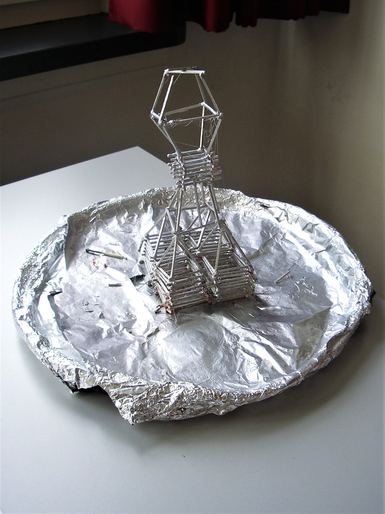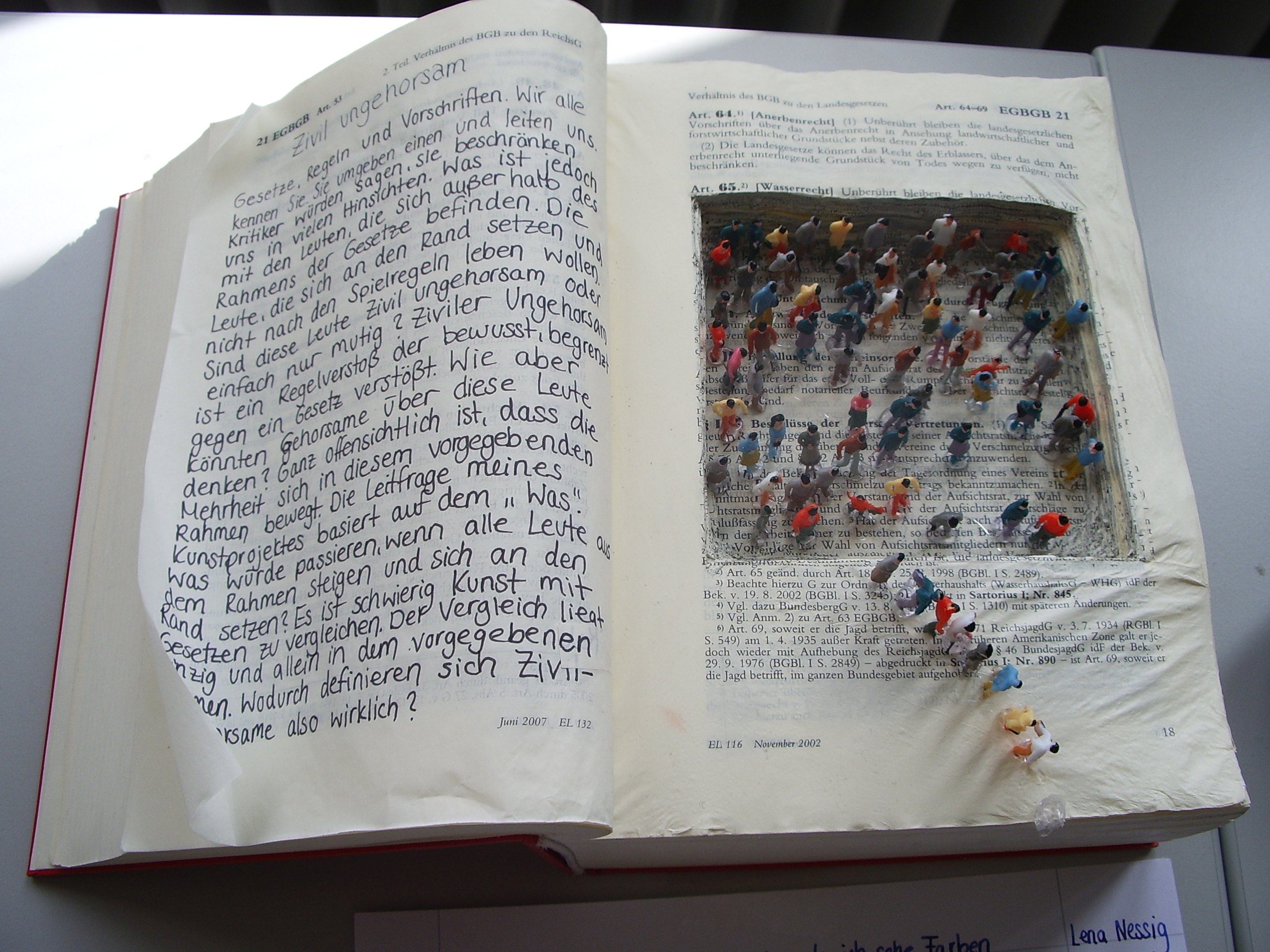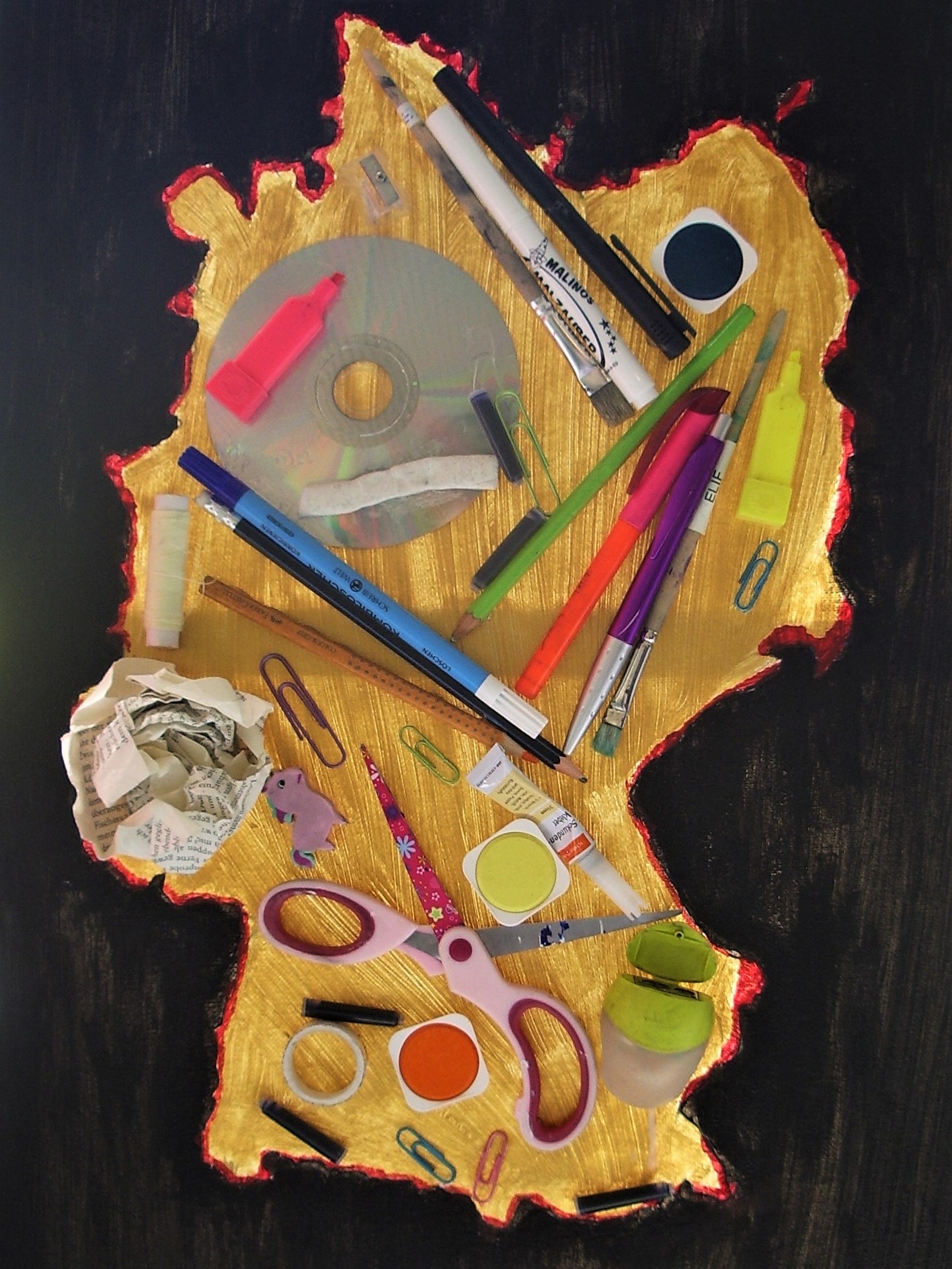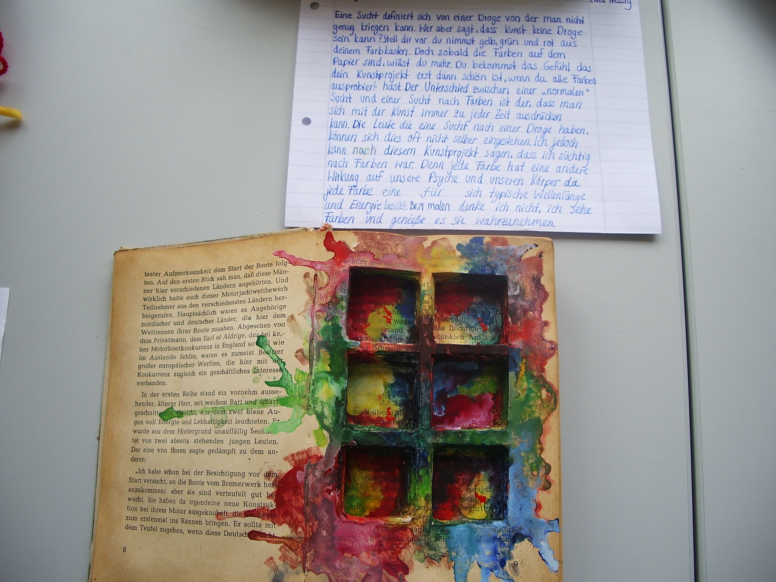 Der Kurs hatte sich anlässlich seines Abschlussjahres für eine Ausstellung als Präsentationsform Objektkunst-Einheit entschieden. Ein kleiner Publikumskreis von Schülern, Eltern und Lehrern besuchte die Ausstellung und konnte dem Rollenspiel beiwohnen.