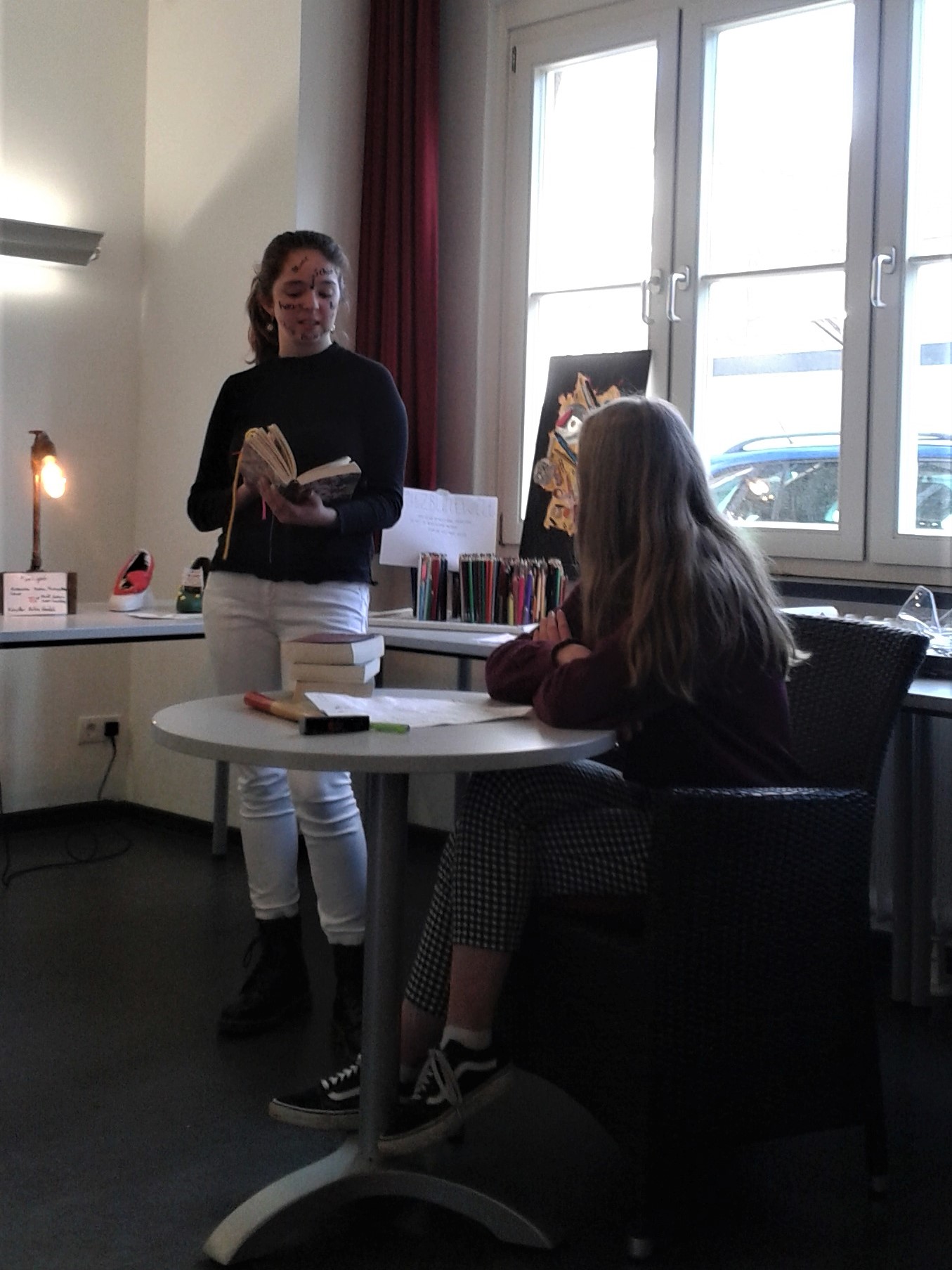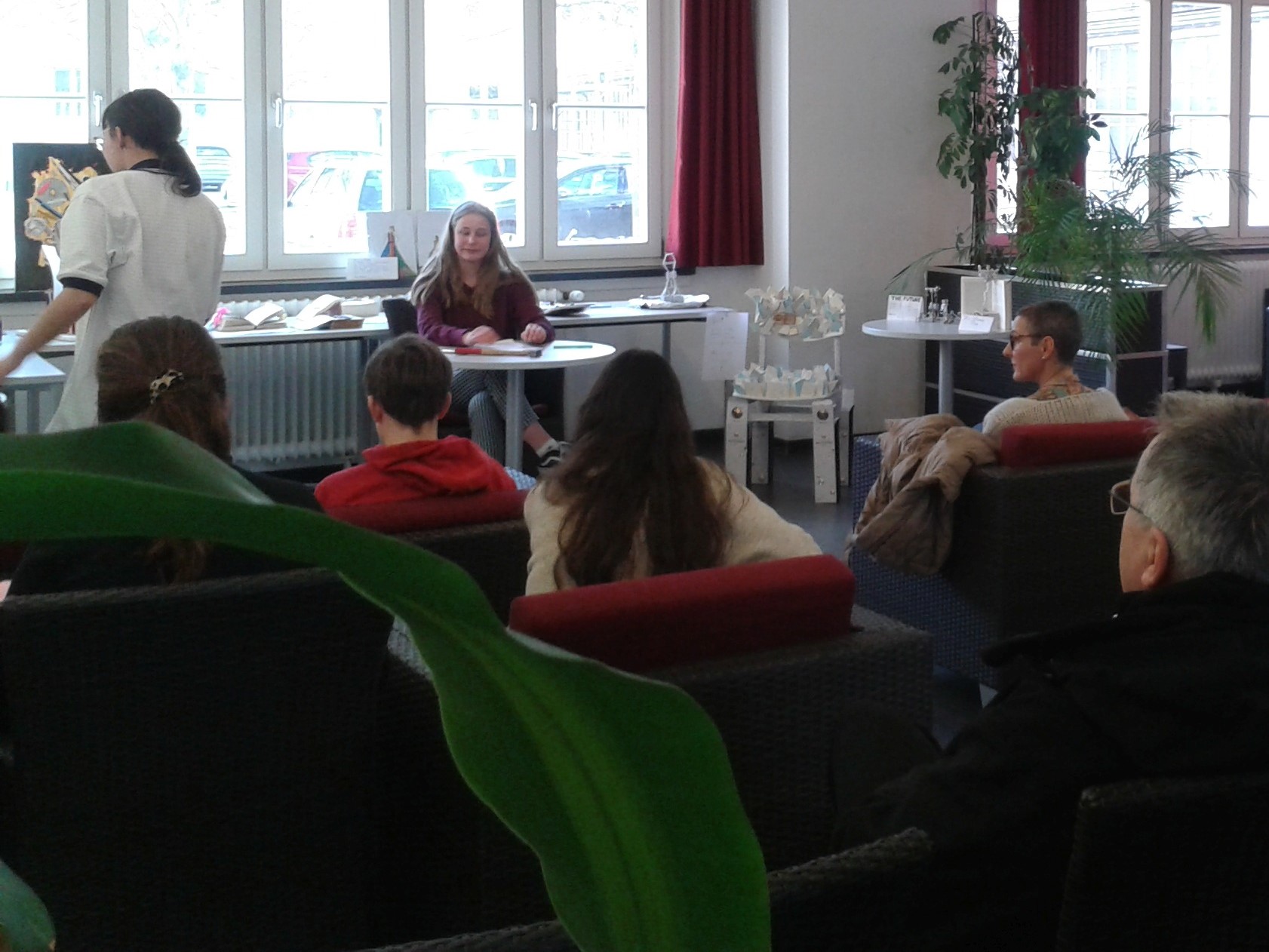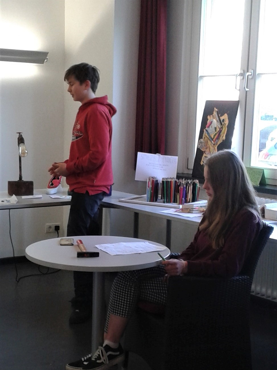 Die SchülerInnen zeigten nicht nur ihre künstlerischen Ergebnisse sondern bewiesen zusätzlich bei der Veranstaltungsorganisation viel Einfallsreichtum. In selbstständiger Arbeit organisierten sie nicht nur ein kleines Catering, Hinweise zu den Kunstwerken sondern auch eine performative Möglichkeit mehr über die Kunstrichtung Objektkunst, das jeweilige Kunstwerk und seinen KünstlerIn zu erfahren: