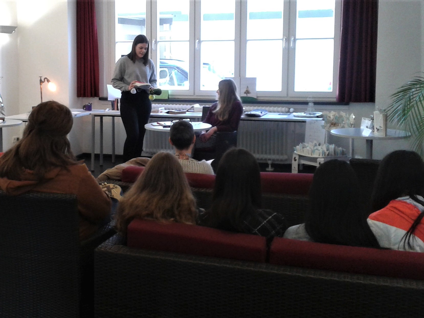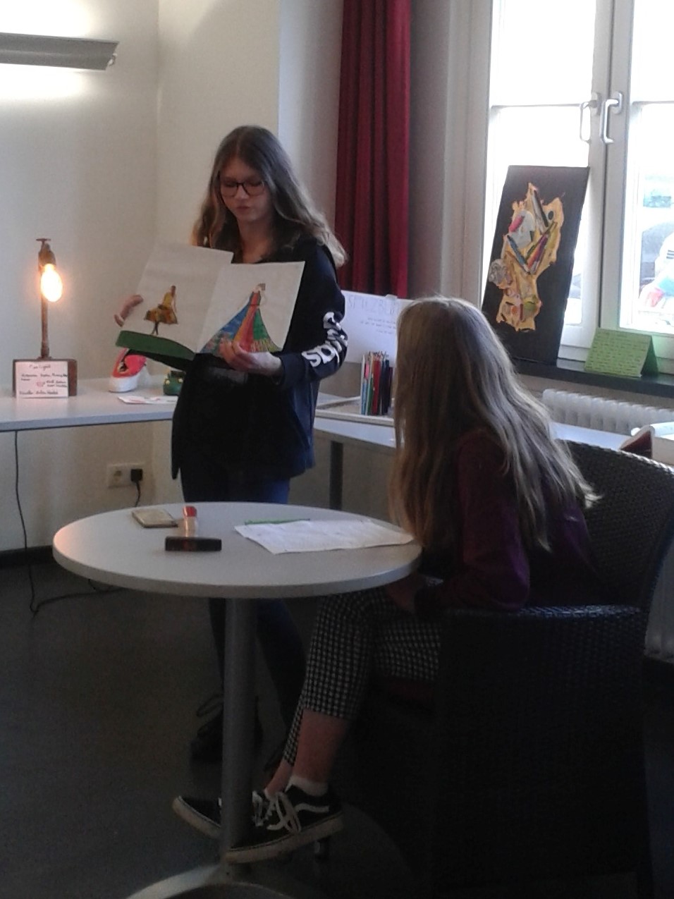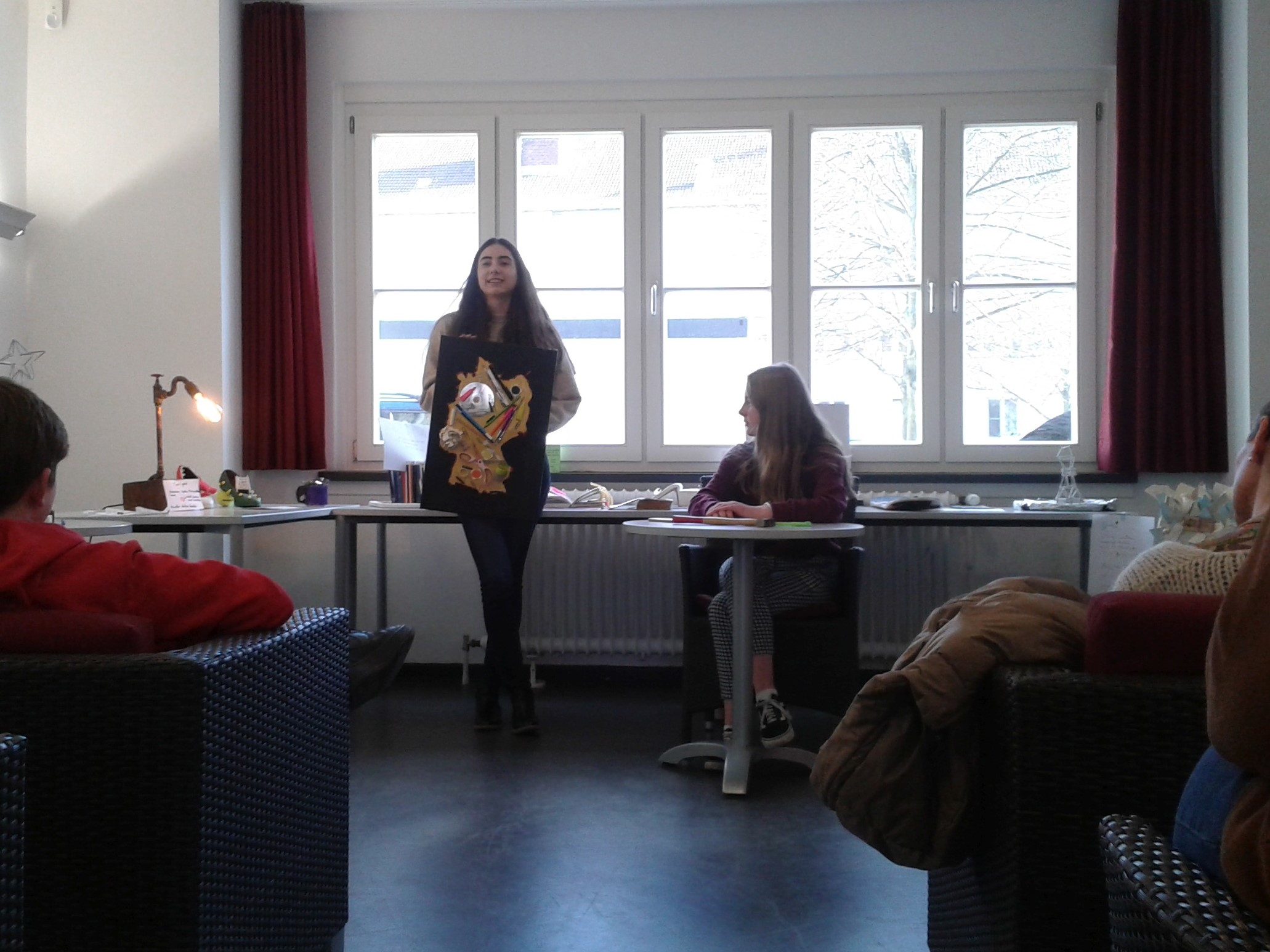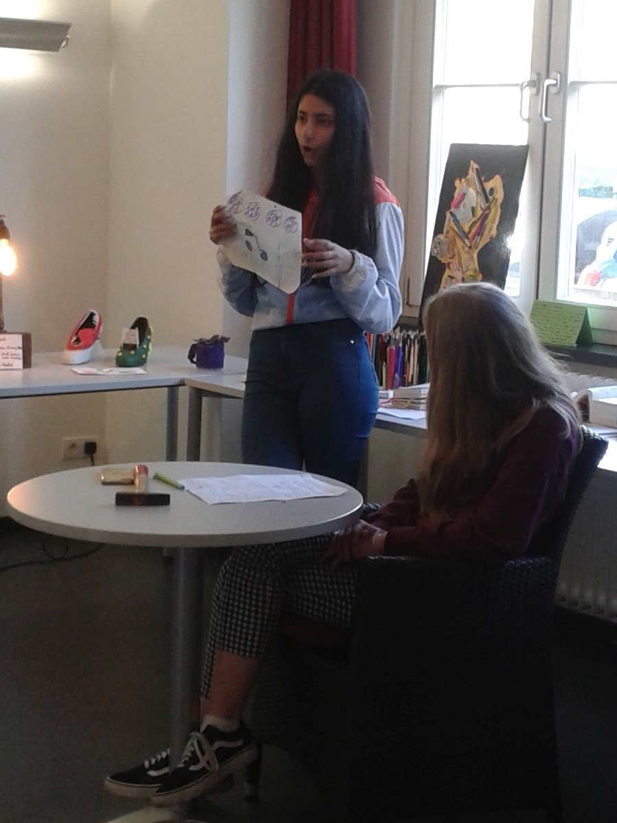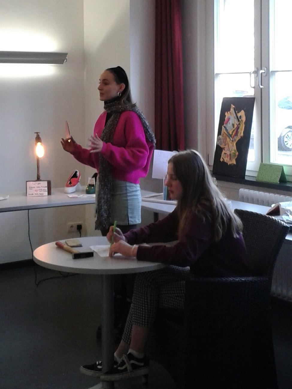 Sie stellten ihre Objekte und ihre damit einhergehenden Gedanken und Intentionen dem Publikum zusätzlich durch ein kleines Rollenspiel vor. Im Rahmen einer simulierten Auktion ersteigerten sie ihre Kunstwerke und erläuterten, in einer Argumentation mit der Auktionatorin, ihre Ideen.