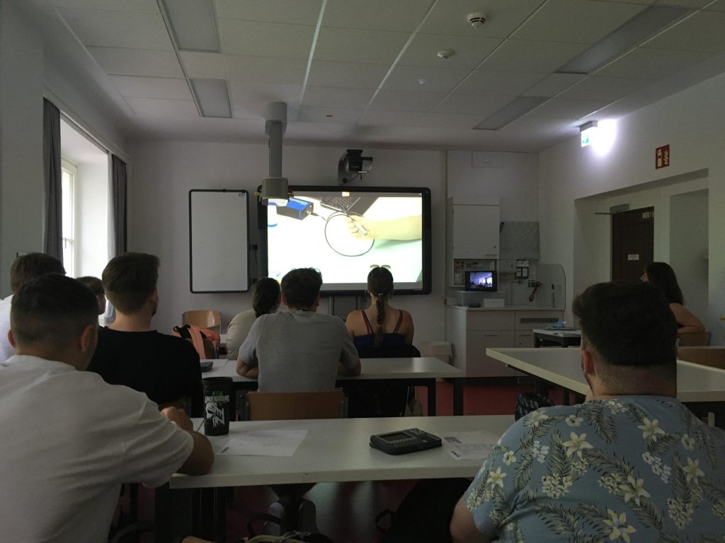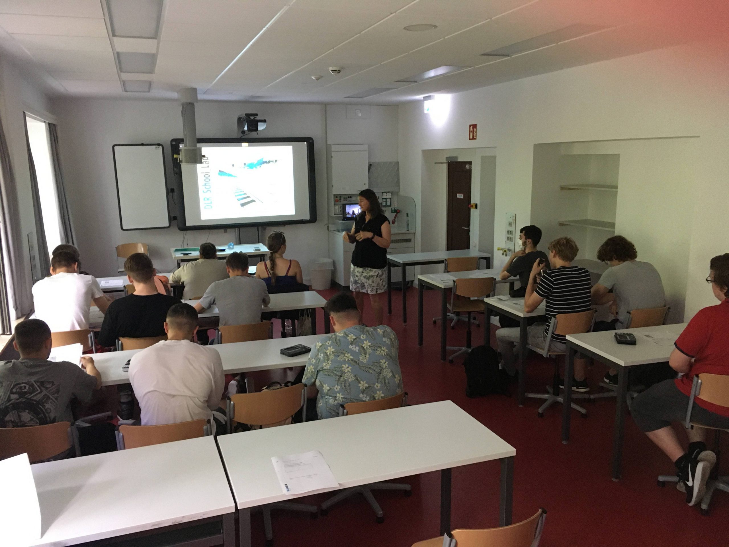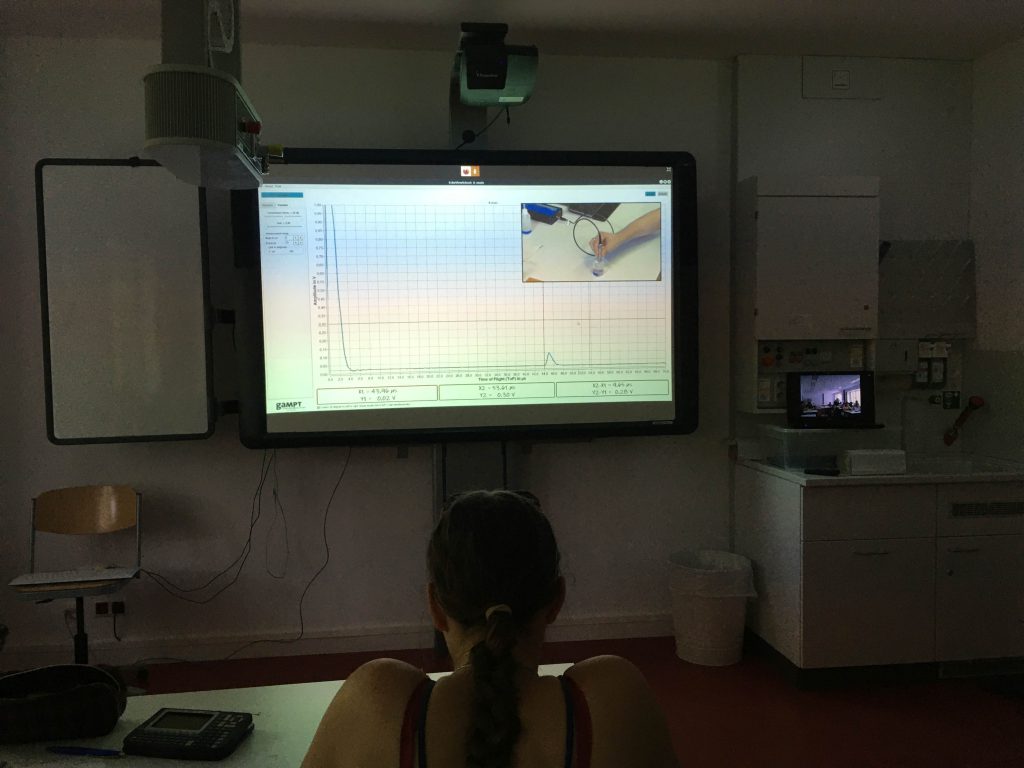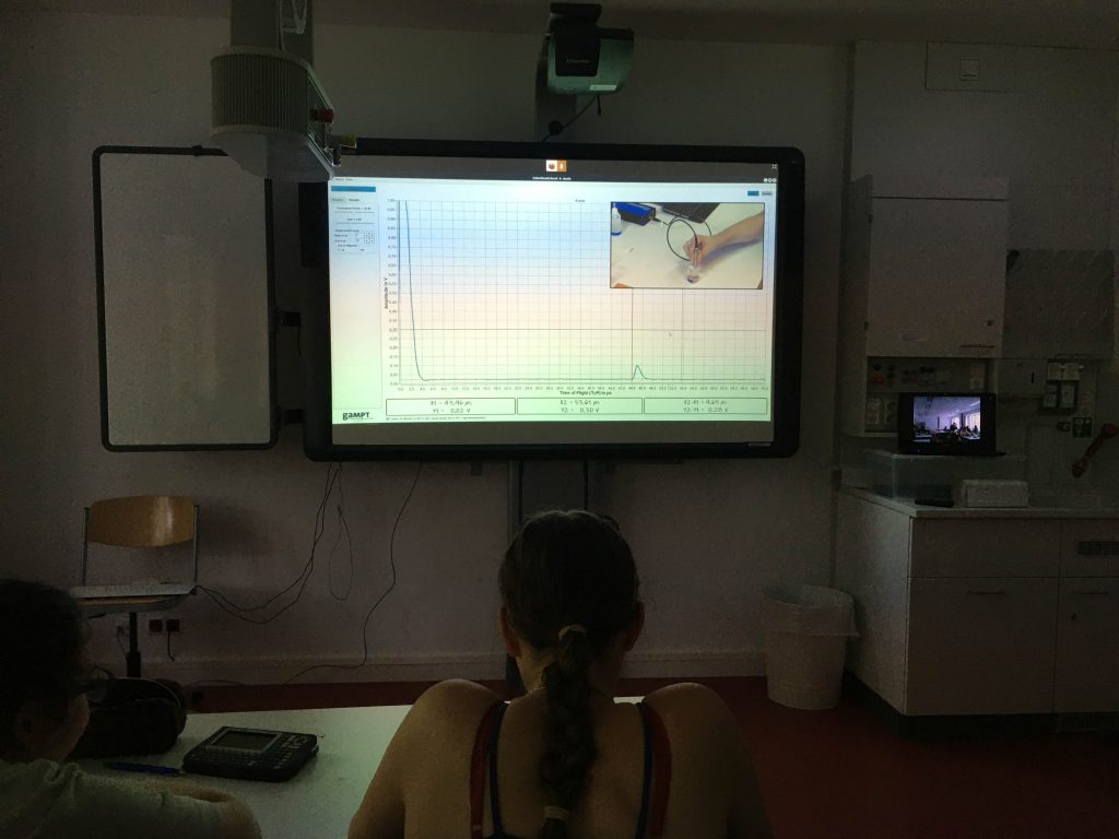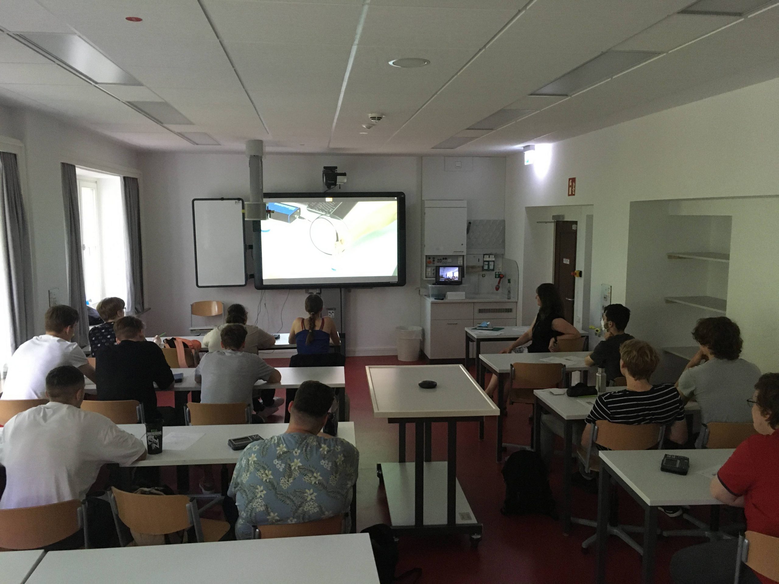 Die Kollegin Bettina Koeppen-Stahl, die mit einigen Stunden ans School_Lab des DLR abgeordnet ist, entwickelte daher ein Modell für eine interaktive Unterrichtsstunde zum Thema Ultraschall. Mit großem technischen Aufwand zur digitalen Interaktion wurden die Versuche im School_Lab von den Studierenden Stefan Lobas und Maximilian Bremer durchgeführt und ins Klassenzimmer übertragen. Es war aber auch möglich, dass die Schüler:innen Rückmeldungen zum Experiment direkt mitteilen konnten und so eine Lernatmosphäre wie bei einem Demonstrationsexperiment im Klassenzimmer möglich wurde.